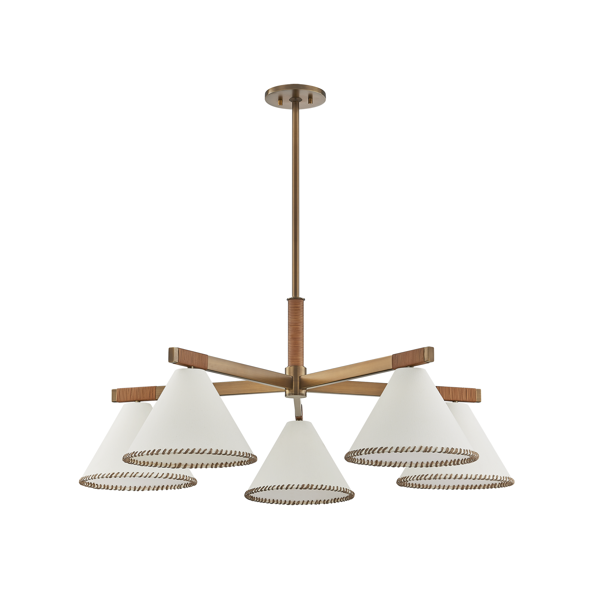 The architectural design language of the Stoney family is softened by its unique material qualities. Large conical white linen shades are edged with contrasting whip-stitching, echoing the natural jute wrap details along the Patina Brass frames. Available as a 1-light sconce, 1-light pendant, 5-light chandelier, and 1-light floor lamp, Stoney is an ode to craftsmanship.