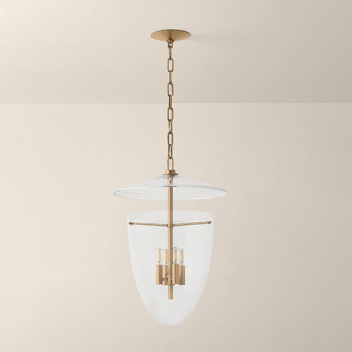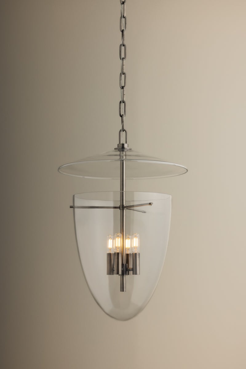 This artful transitional lantern features an inverted bell jar shape with a suspended glass disc at the top. The all-glass composition is fresh and unexpected, revealing clean metalwork inside. Available with 3 or 4 lights, Tully comes in Patina Brass for a classic finish or Vintage Pewter for a sleeker appearance.