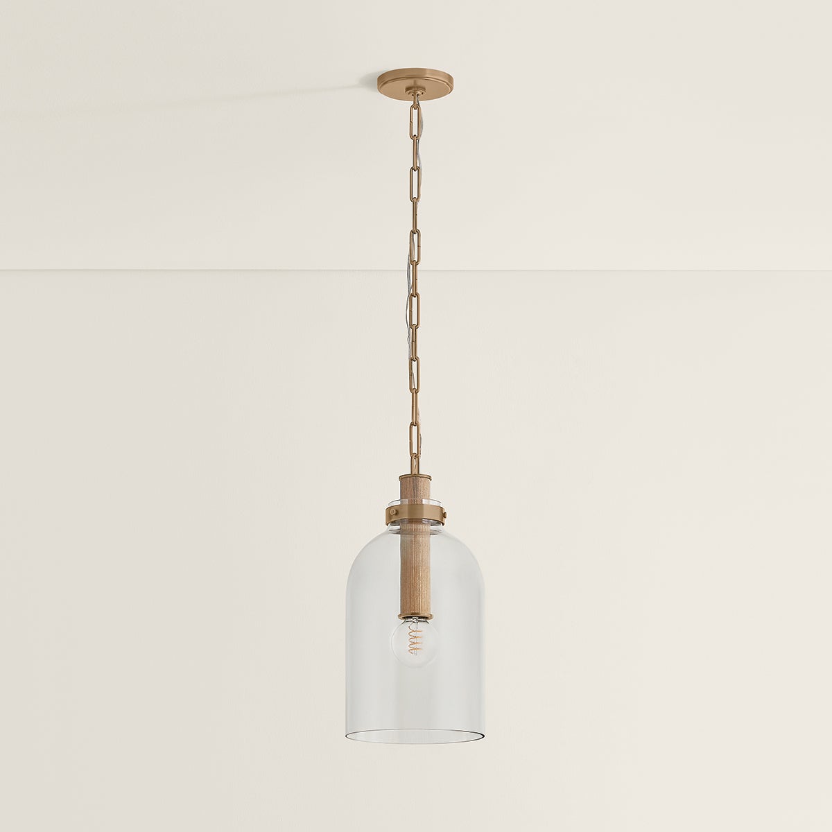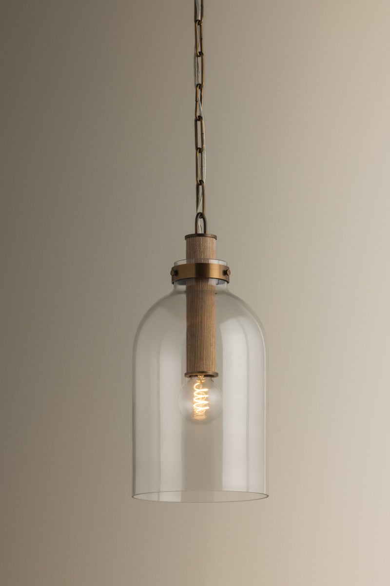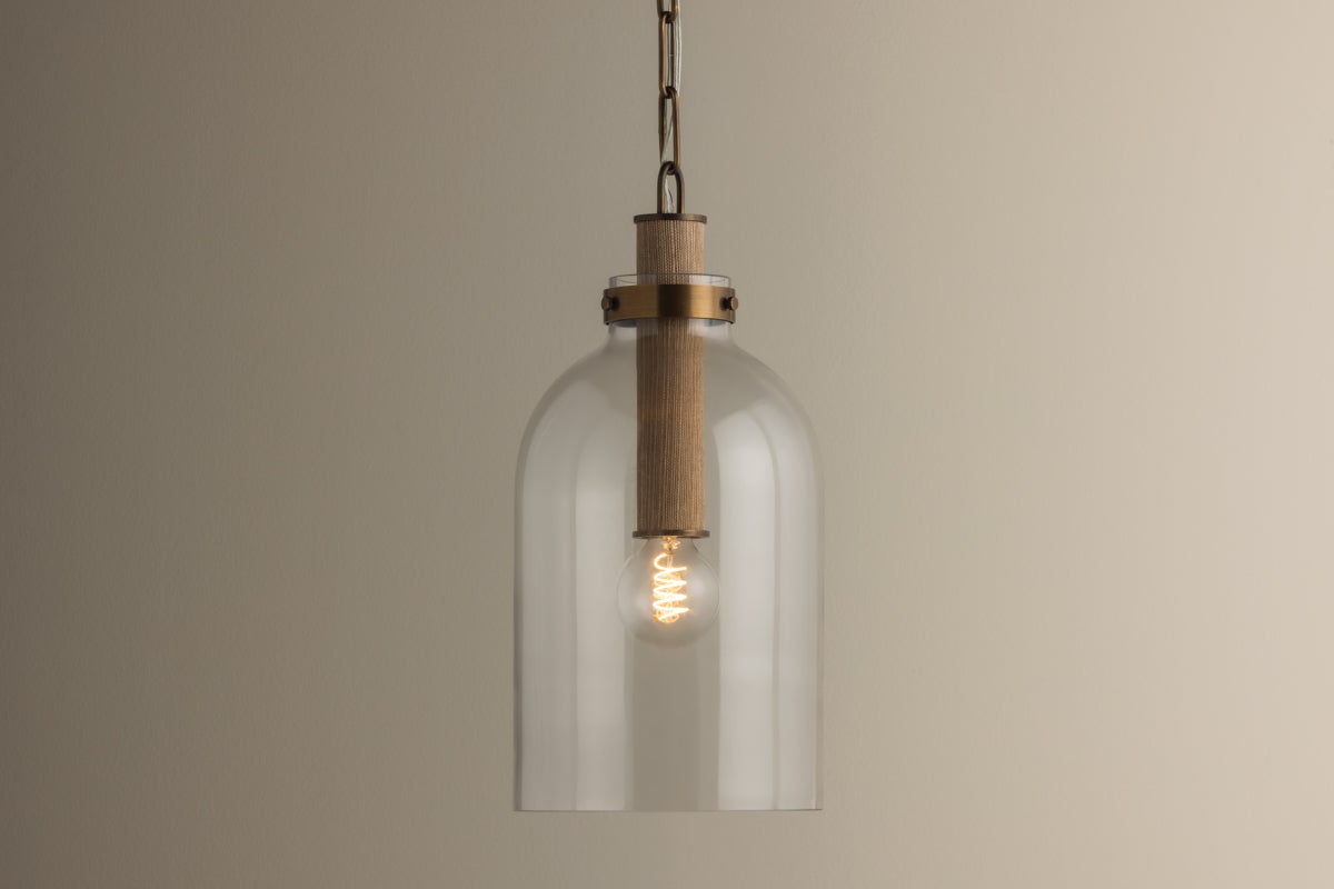 The Kori pendant follows the vein of Japanese modernism with a minimalist cloche-shaped glass design accented by elevated details. A grass cloth wrapped tube extends through the center of the clear glass shade, adding textural interest. Finished in Patina Brass, the thick metal hardware introduces an industrial edge. Despite its distinctive features, Kori’s simplicity of form allows it to be hung in multiples across various spaces. Available in two sizes.