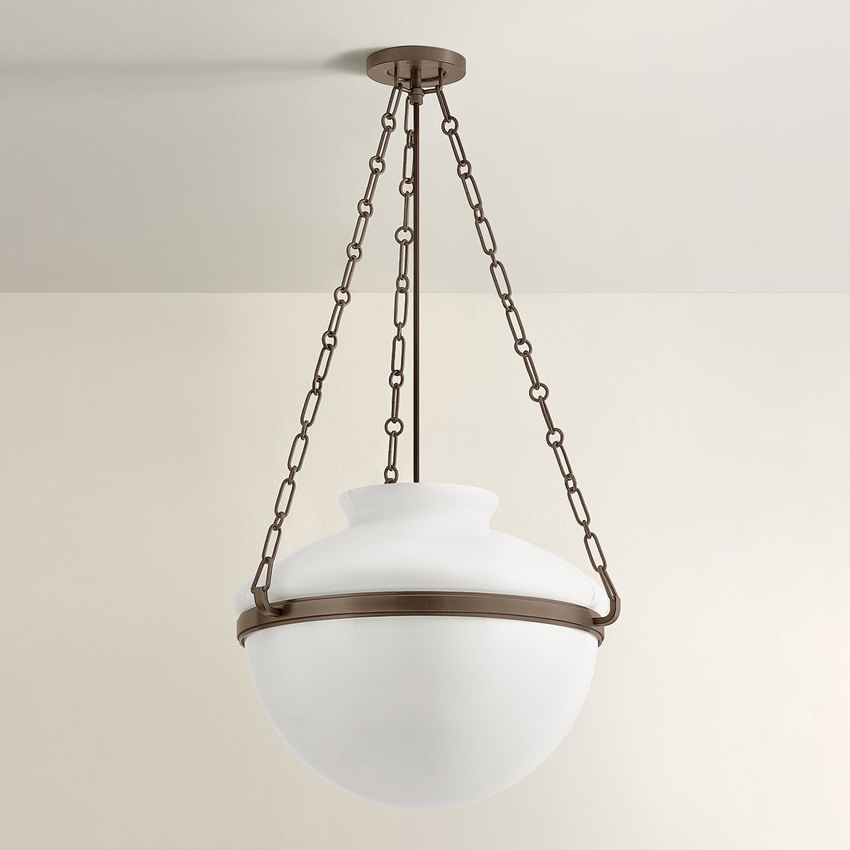 With a silhouette that nods to the past, Paradigm reimagines the classic lantern with bold, generous proportions and a contemporary sensibility. A large student-style opal shiny glass shade hangs from a trio of chunky chains, finished in either polished Patina Brass or an understated Bronze finish. Available in two sizes, Paradigm blends heritage and modernity into a sculptural overhead statement.