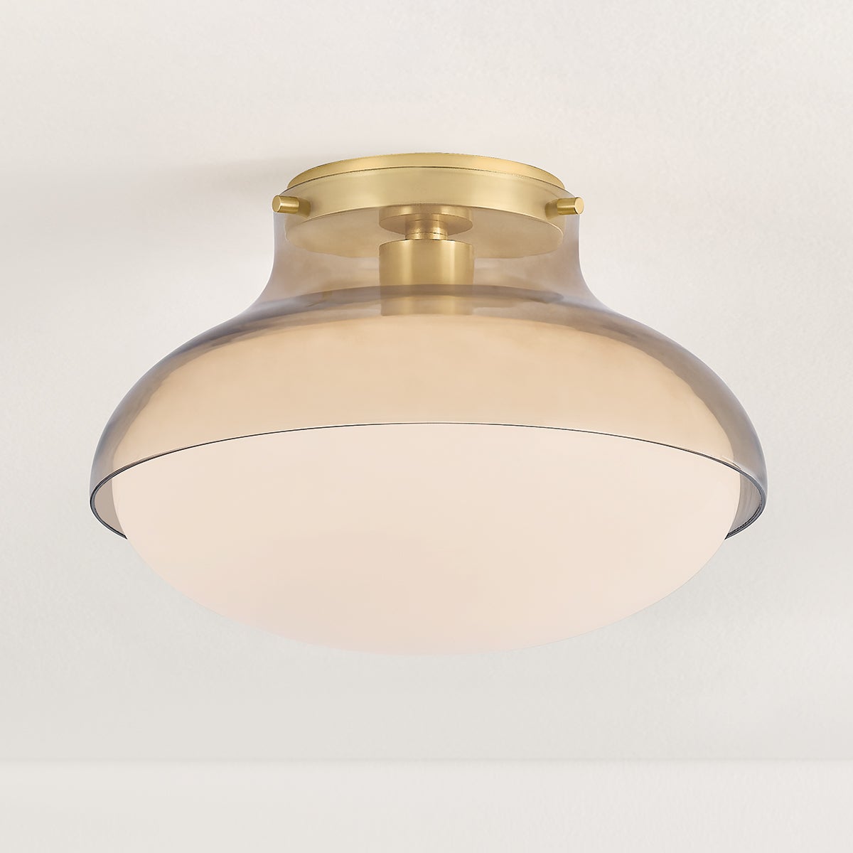 The soft curves and mechanical detailing of Gianna create visual tension while retaining a sense of balance. A light bronze glass layer melts from an Aged Brass canopy, surrounding a glossy opal glass inner shade to form the organic design. The clean, minimalist shape is elevated by the distinctive double glass composition and the industrial-style pins that hold the entire fixture together.
