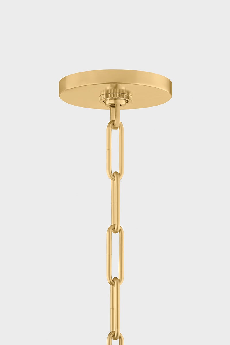 Elegant in its simplicity, the Merida pendant pairs a pleated faux silk shade with crisp metalwork. A sleek racetrack loop extends from the top of the fixture, its elongated shape seeming to be drawn downward by the weight of the shade. Finished in Aged Brass, this special detail and classic chain add a clean modern touch to the design. Available in two sizes.
