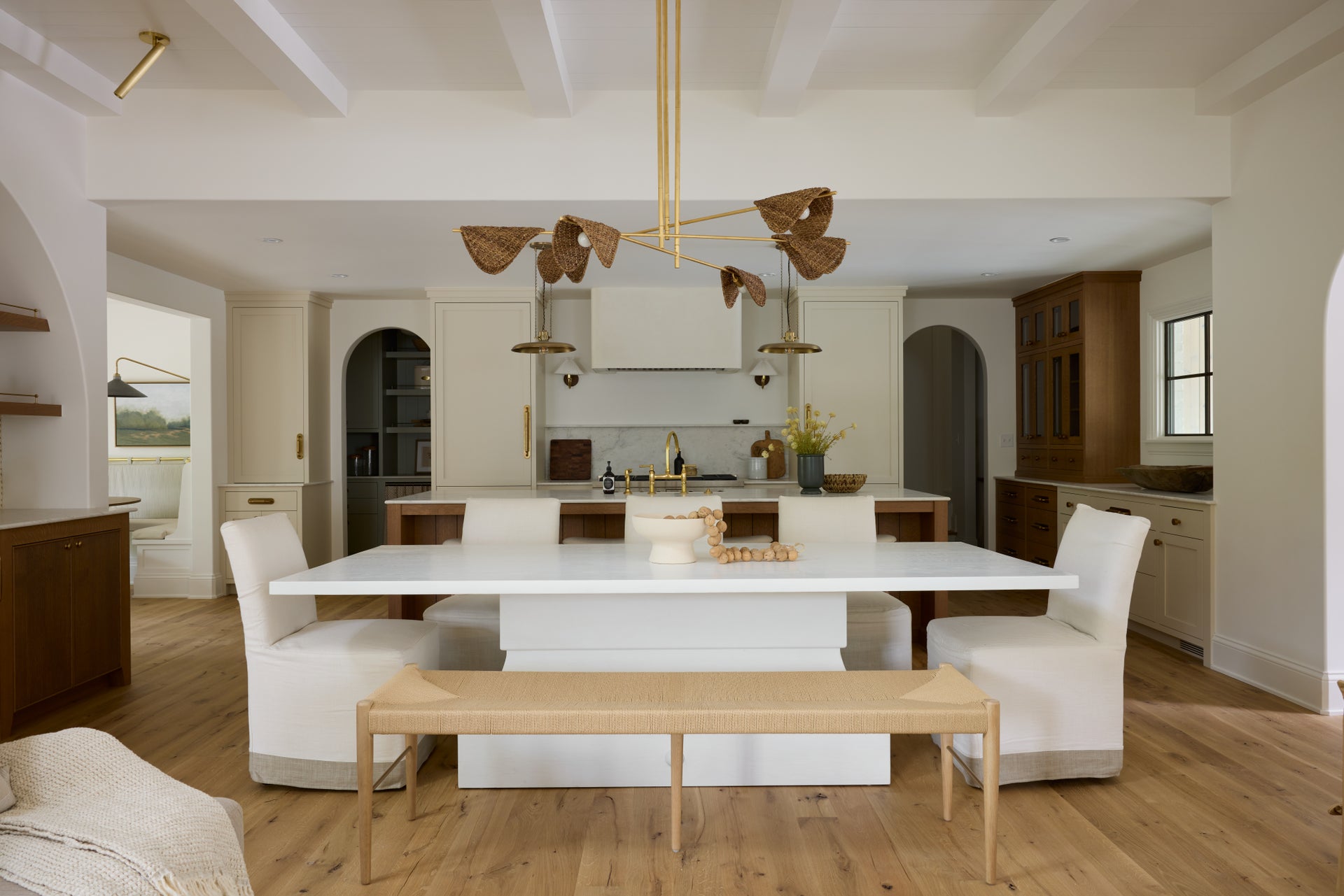 The Acacia sconce is playfully maximalist in form, yet tailored in materiality. The white linen shade has a sophisticated return on top, adding an unexpected twist to the pleated design. The shade is supported by a dramatic Aged Brass-finished J-arm, which connects to a wooden backplate through a simple sphere detail. The dark wood’s classic, heritage feel and contrasting color help visually separate the shade from the wall.
