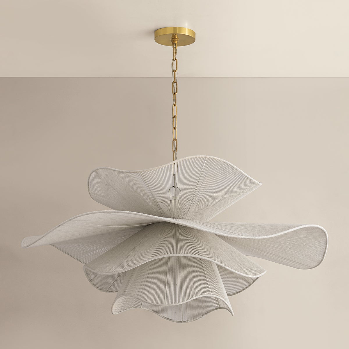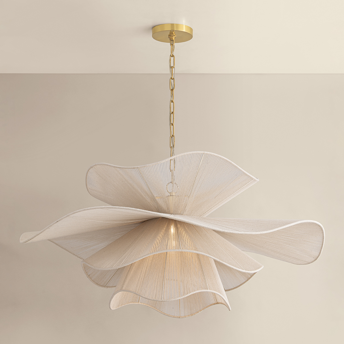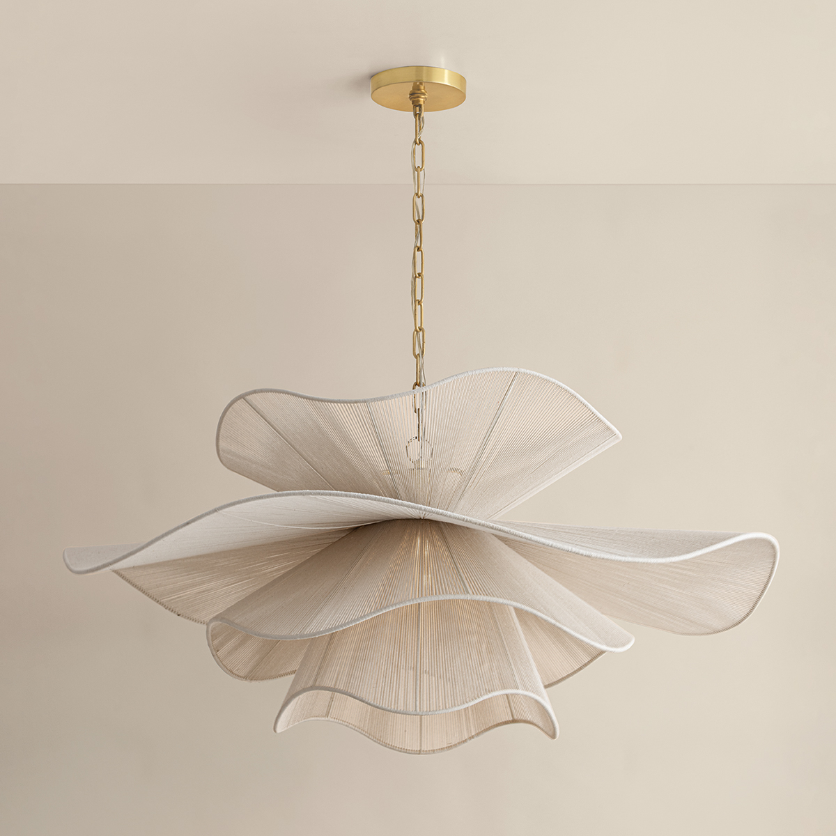 Composed of layered leaf-inspired forms, the Amanda pendant makes a grand-scale visual impact. The four softly undulating cotton-string shades create an implied sense of rhythmic movement as their sculptural lines come alive with light. Despite the generous silhouette, Amanda is airy as it floats above dining tables and entryways. Suspended from an Aged Brass chain and available in two sizes, it brings a quiet drama to any space.