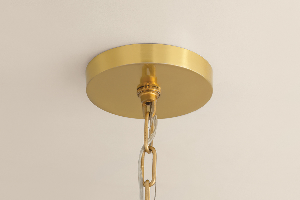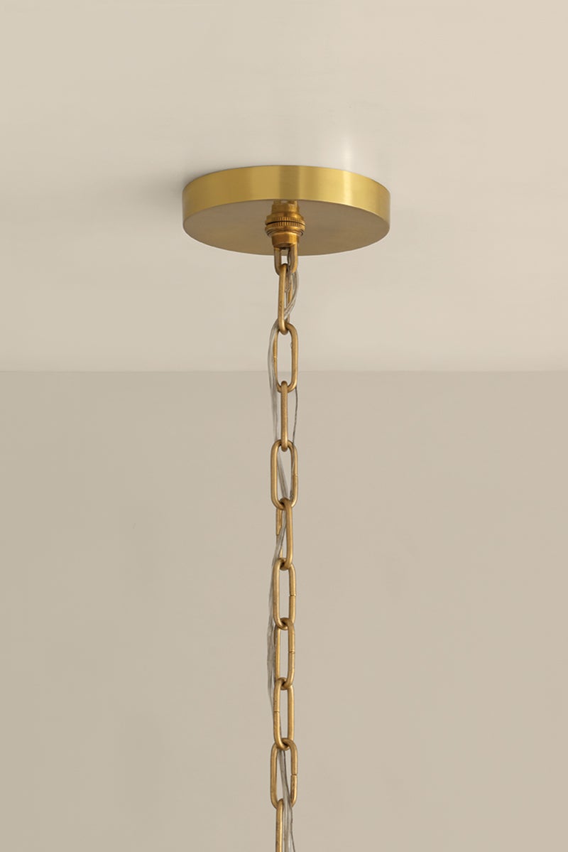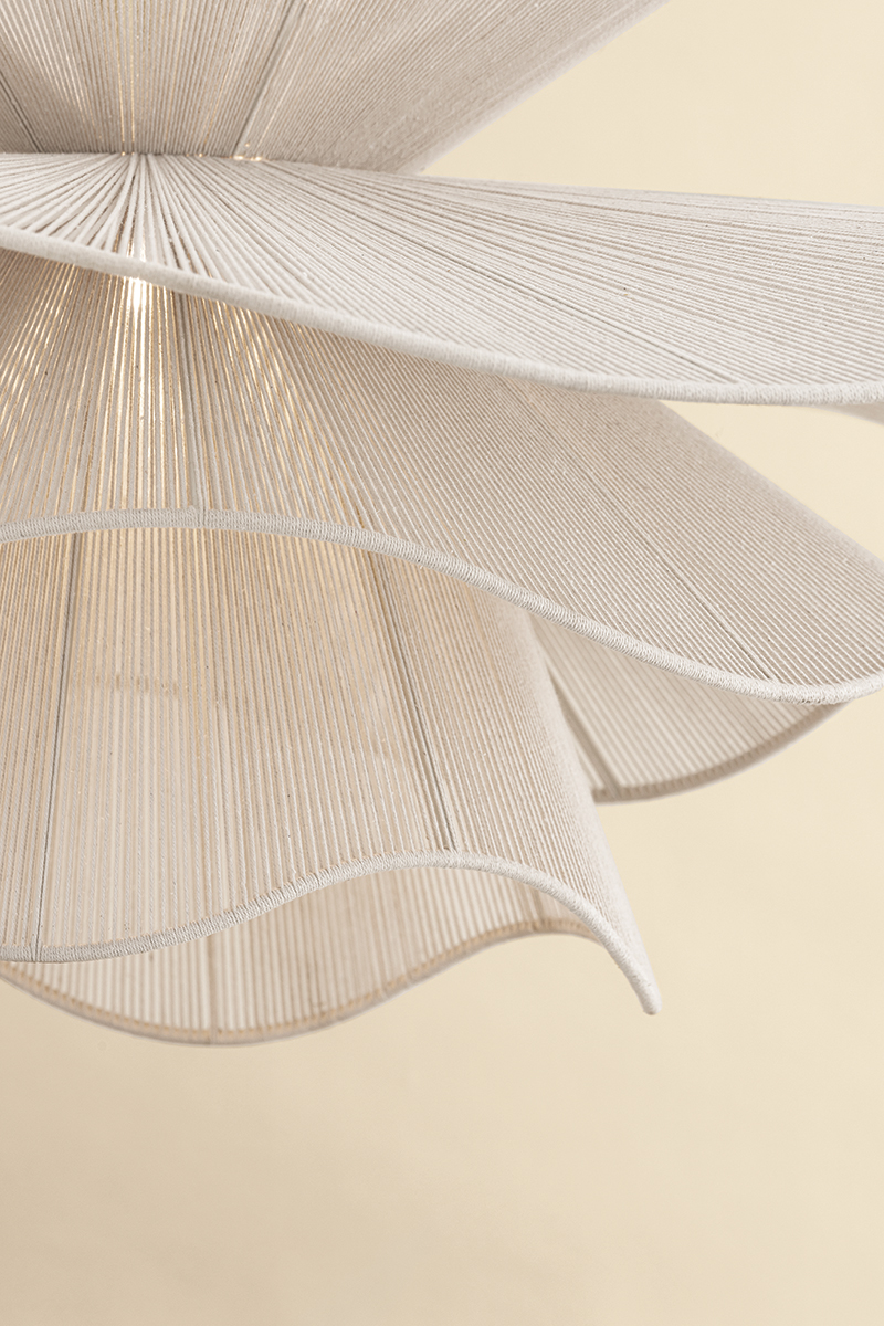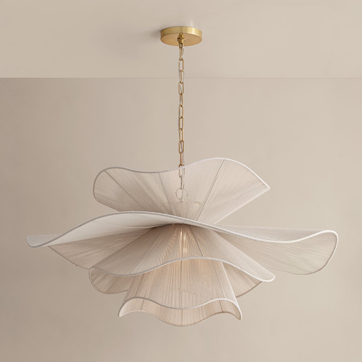 Composed of layered leaf-inspired forms, the Amanda pendant makes a grand-scale visual impact. The four softly undulating cotton-string shades create an implied sense of rhythmic movement as their sculptural lines come alive with light. Despite the generous silhouette, Amanda is airy as it floats above dining tables and entryways. Suspended from an Aged Brass chain and available in two sizes, it brings a quiet drama to any space.