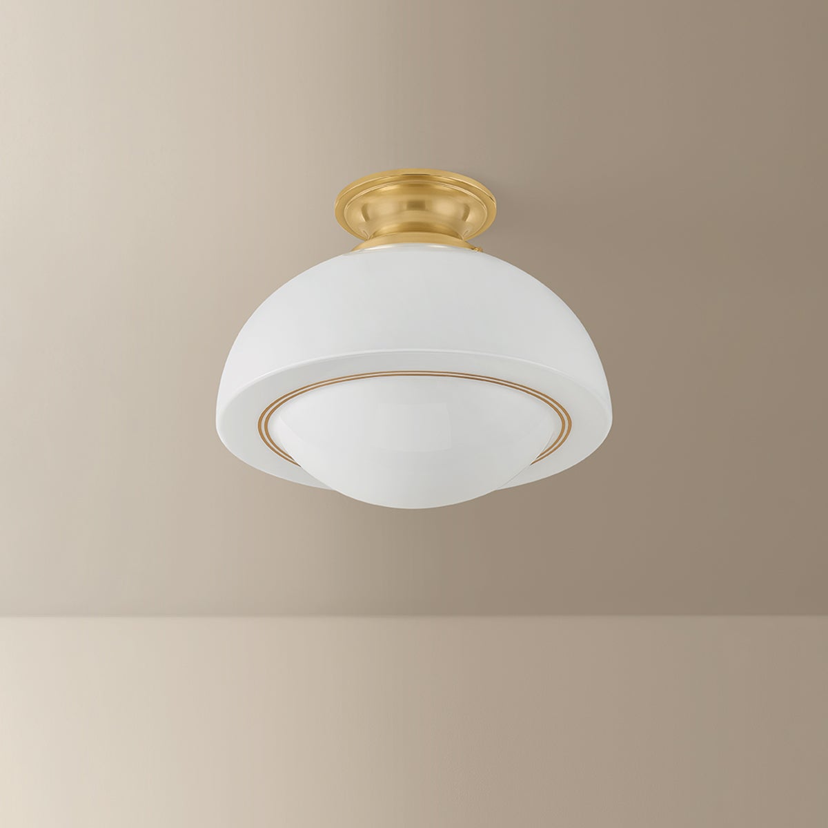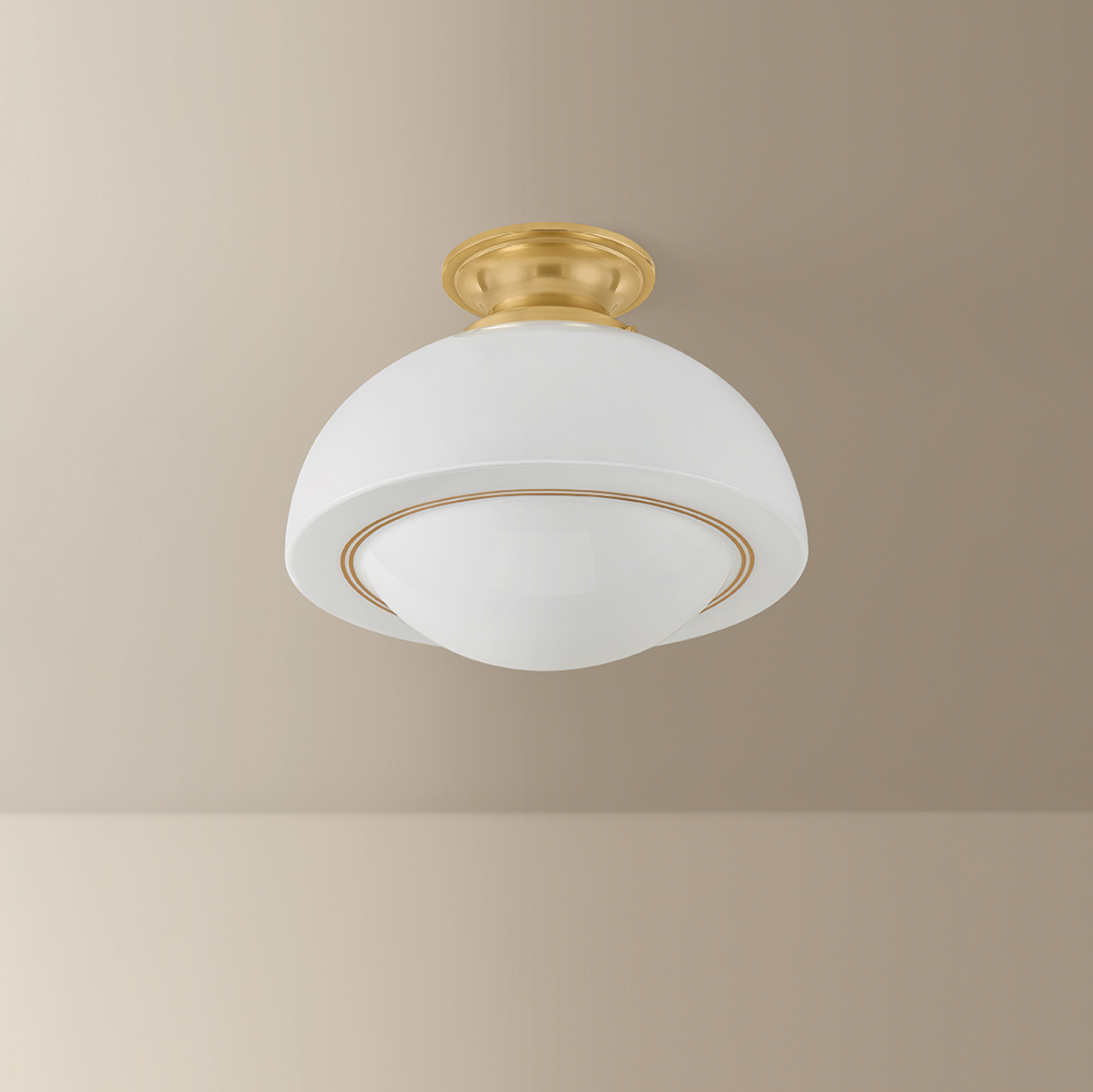 Inspired by retro silhouettes, Celine calls on mid-century style with a twist. The domed spot-plated opal glass shade glows softly, diffusing light evenly throughout the entire form. Thin gold pinstripes trace the shade, giving shape to the edges. This sophisticated everyday staple is available as a 1-light semi-flush in two sizes and as a pendant.