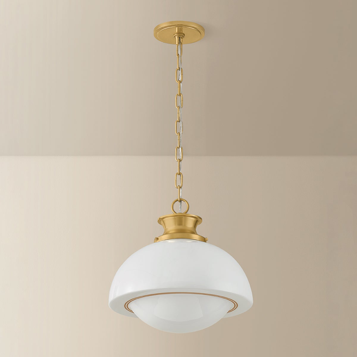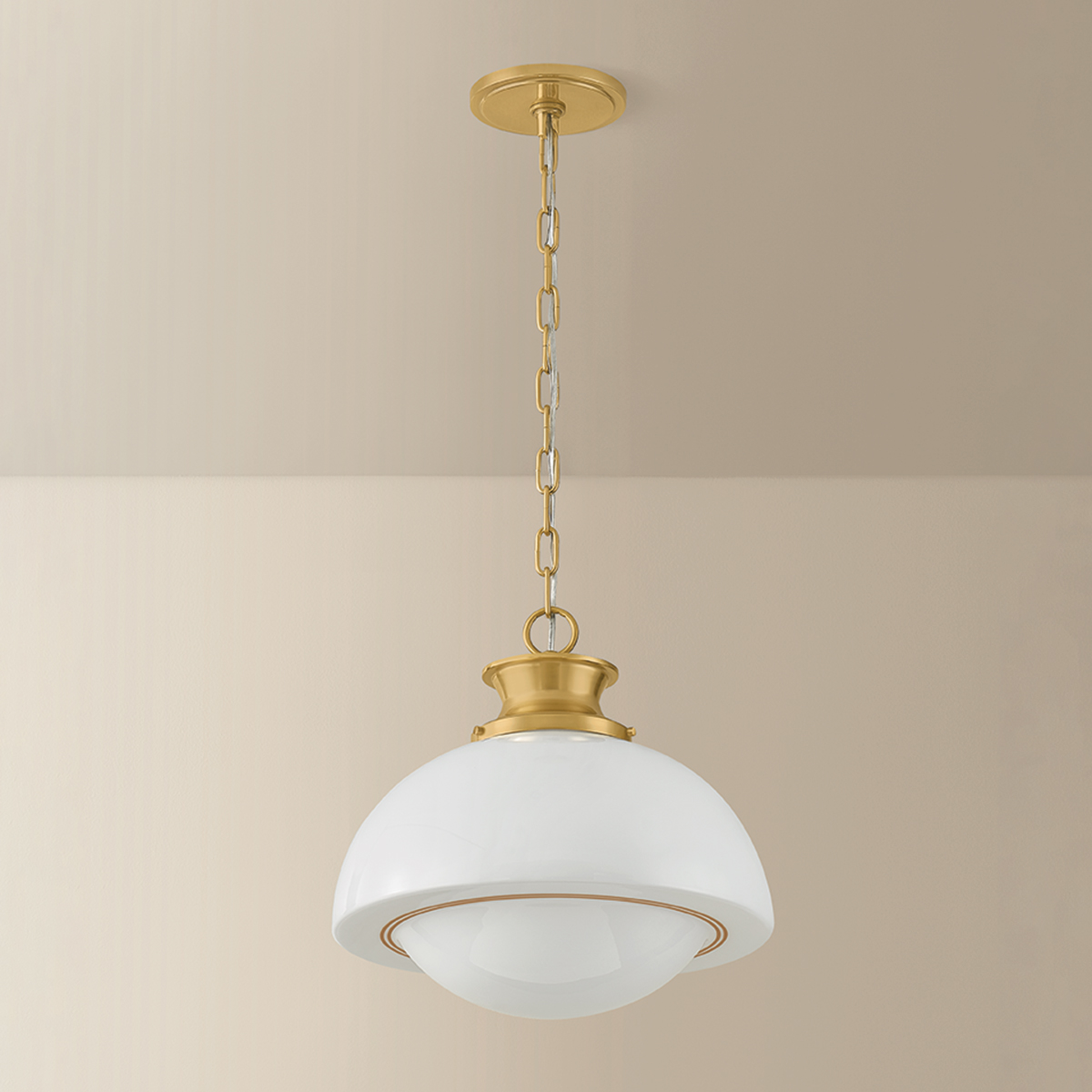 Inspired by retro silhouettes, Celine calls on mid-century style with a twist. The domed spot-plated opal glass shade glows softly, diffusing light evenly throughout the entire form. Thin gold pinstripes trace the shade, giving shape to the edges. This sophisticated everyday staple is available as a 1-light semi-flush in two sizes and as a pendant.
