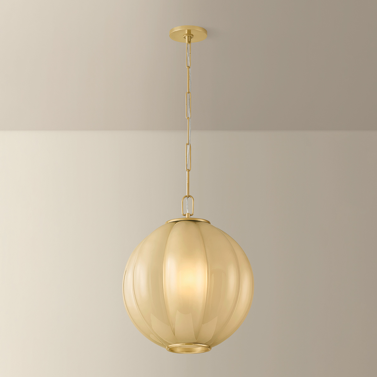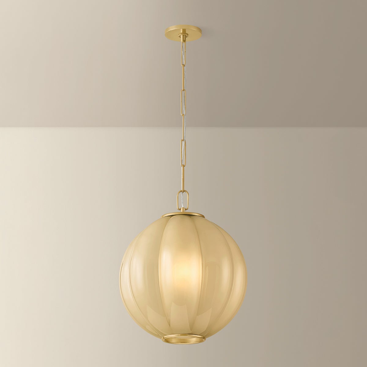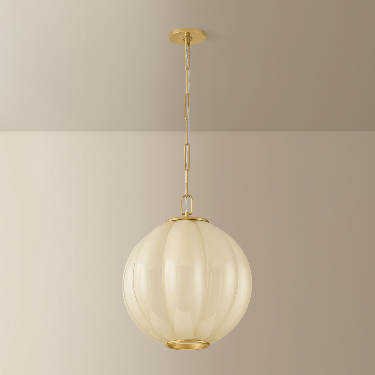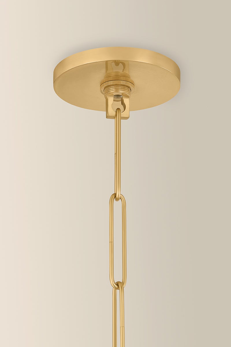 The Bernadine pendant reimagines the beloved scalloped trend on a grander scale. The wide contours of the clear etched cream glass shade create a pillowy shape that sets this hanging lantern apart. Finished in Aged Brass, the frame bookends the shade on either end like jewelry. Available in two pendant sizes, Bernadine is a versatile, artful choice above dining tables, kitchen counters, and entryways.