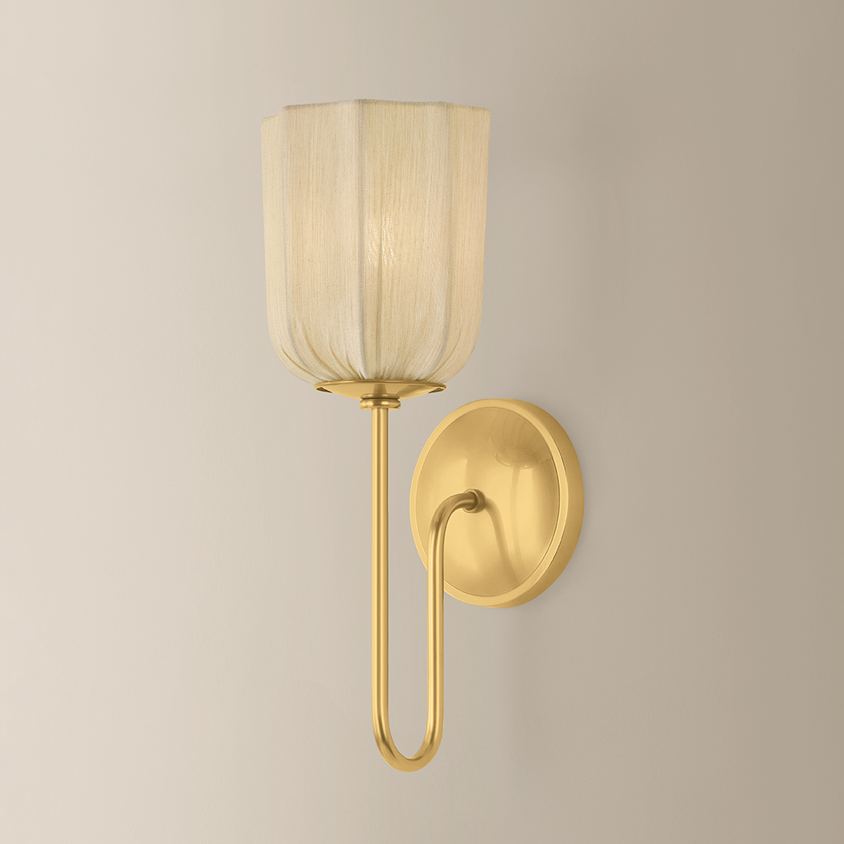 A love affair with vintage decadence, the Samantha family features an expressive rise-and-fall chandelier and a botanically-inspired sconce. The swooping metalwork and central finial of the 3-light chandelier recall the sculptural curves of Art Nouveau. Soft cotton shades gather at the bottom and relax at the top, creating a natural, fluted silhouette. An Aged Brass frame shimmers as you walk by.