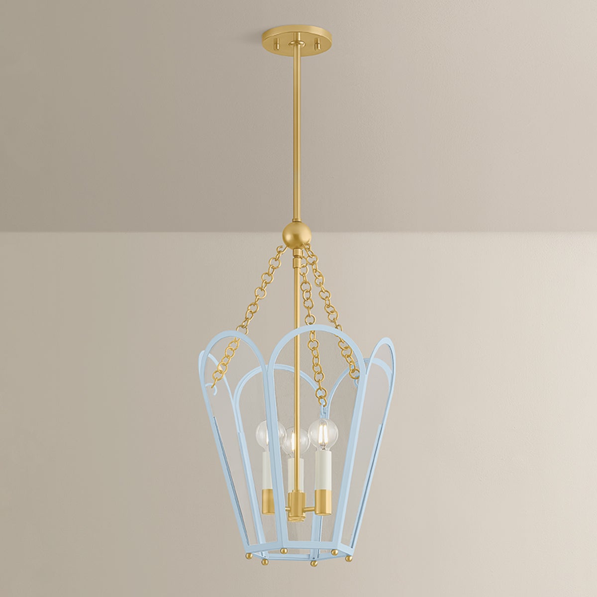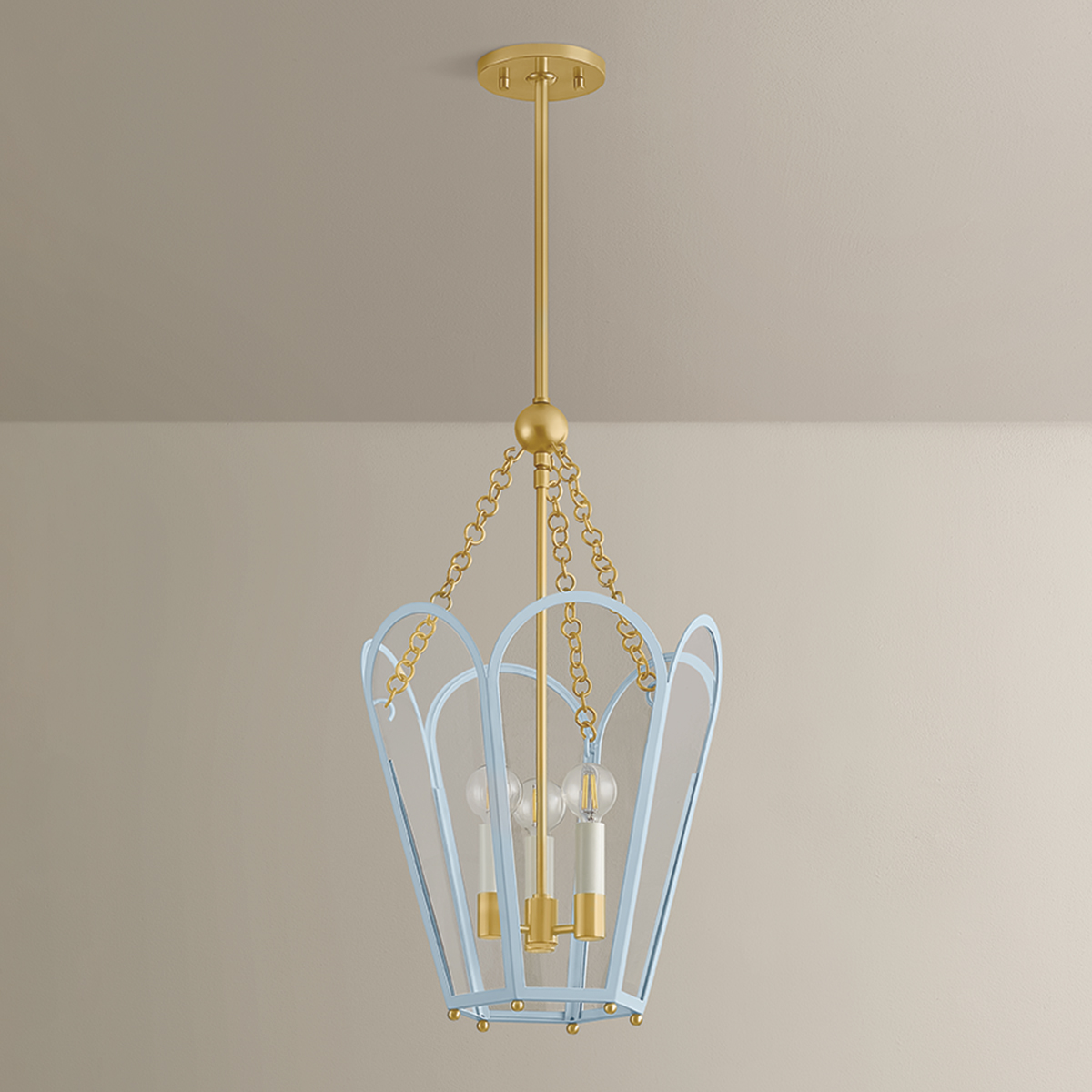 A classic lantern shape is reimagined with the spirit of modern romance. The hexagonal frame of Clarisse features arched glass panels that reveal cream candles. With a mix of Aged Brass and either Soft Bisque or Arctic Ocean finishes, each lantern is a festive celebration of color. Available as a small 3-light or large 4-light design.