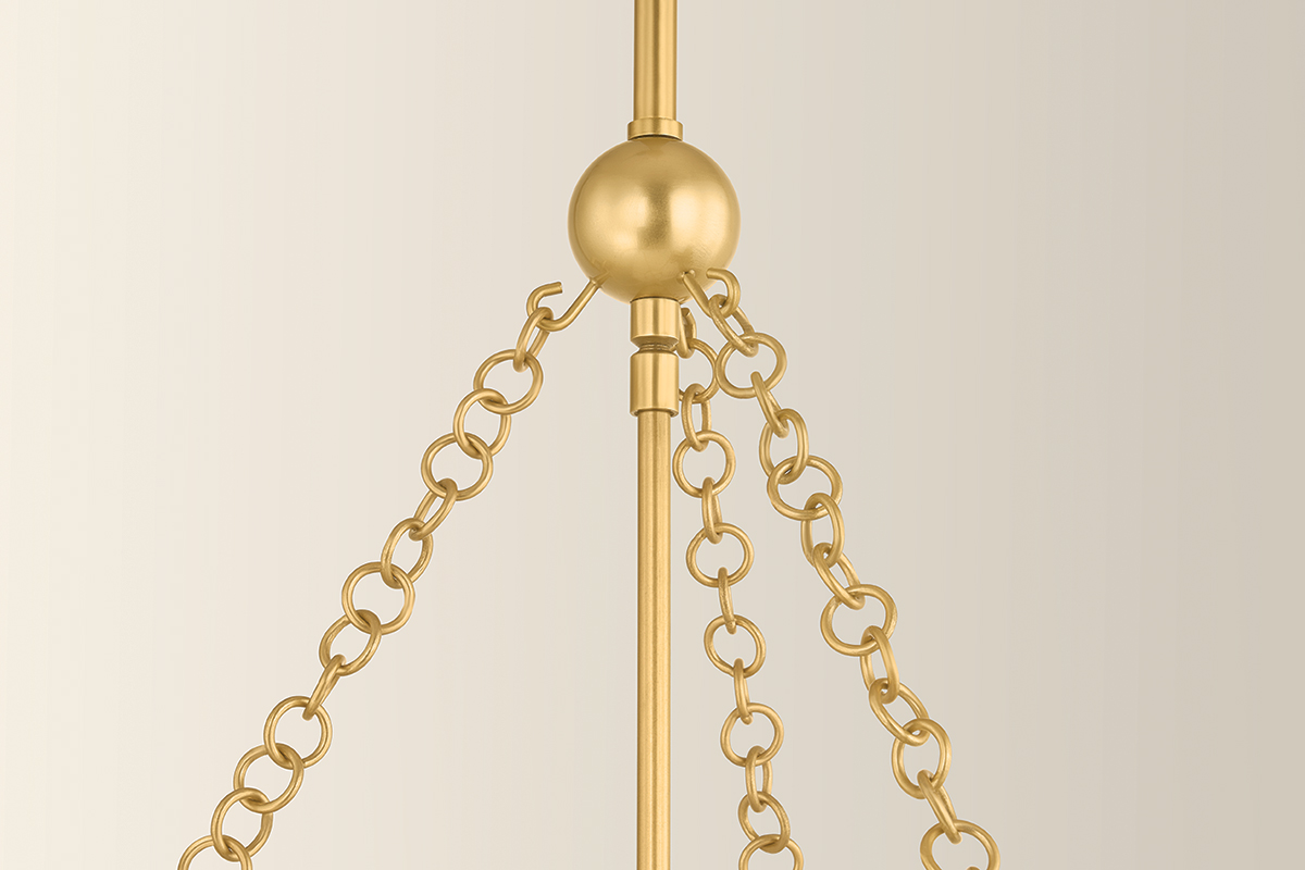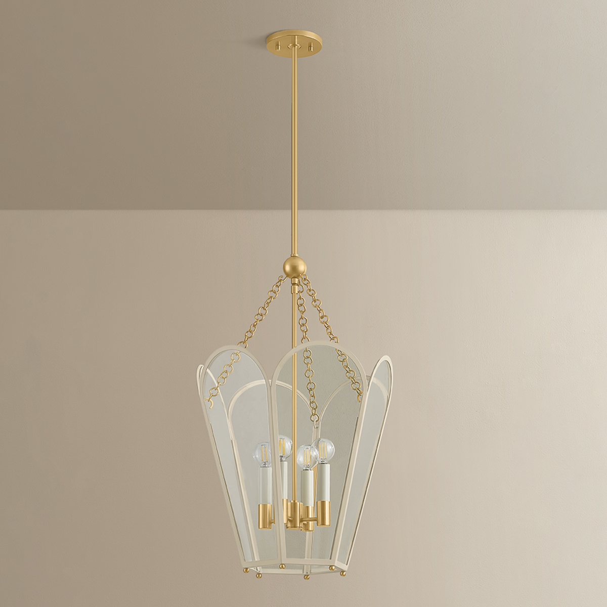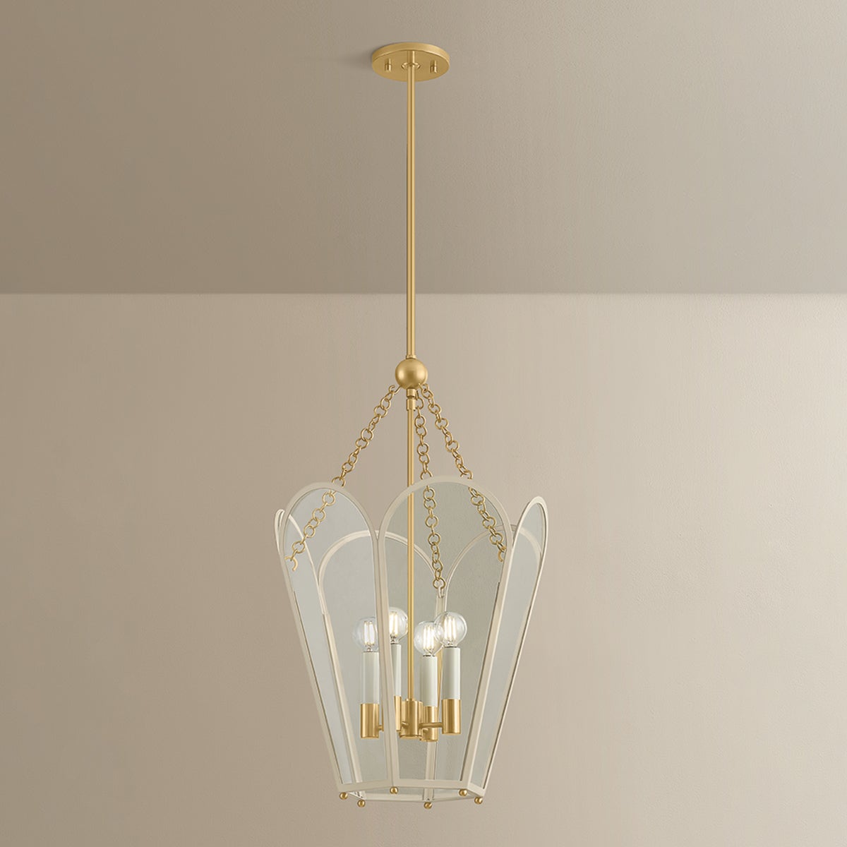 A classic lantern shape is reimagined with the spirit of modern romance. The hexagonal frame of Clarisse features arched glass panels that reveal cream candles. With a mix of Aged Brass and either Soft Bisque or Arctic Ocean finishes, each lantern is a festive celebration of color. Available as a small 3-light or large 4-light design.
