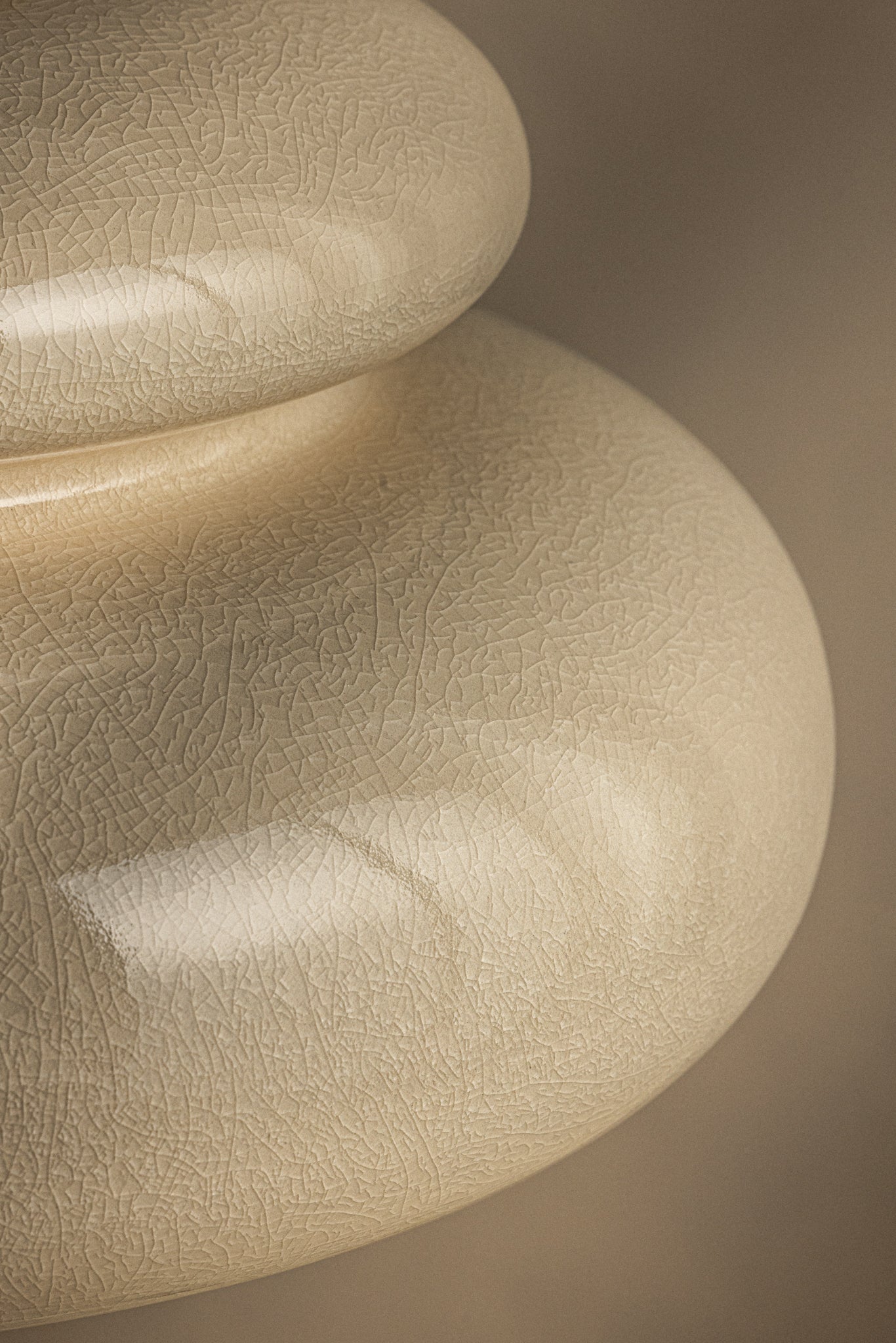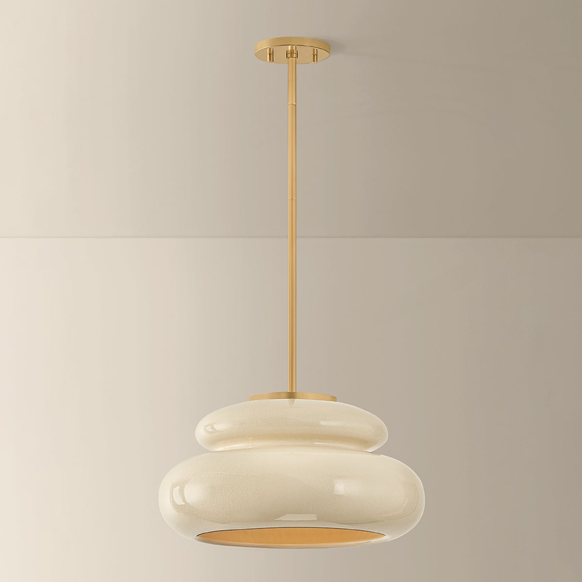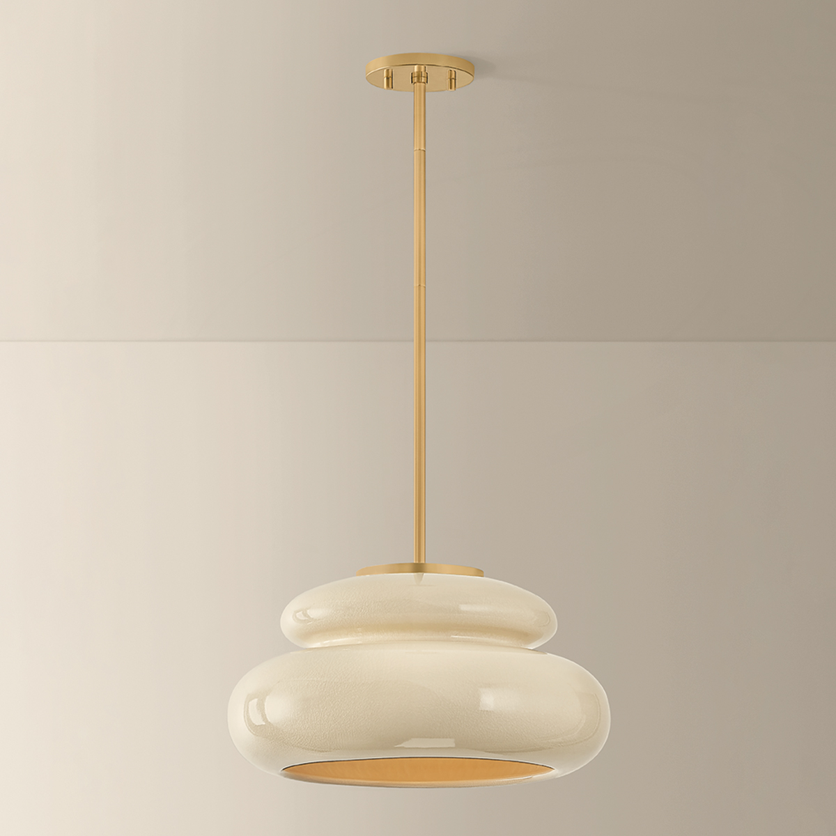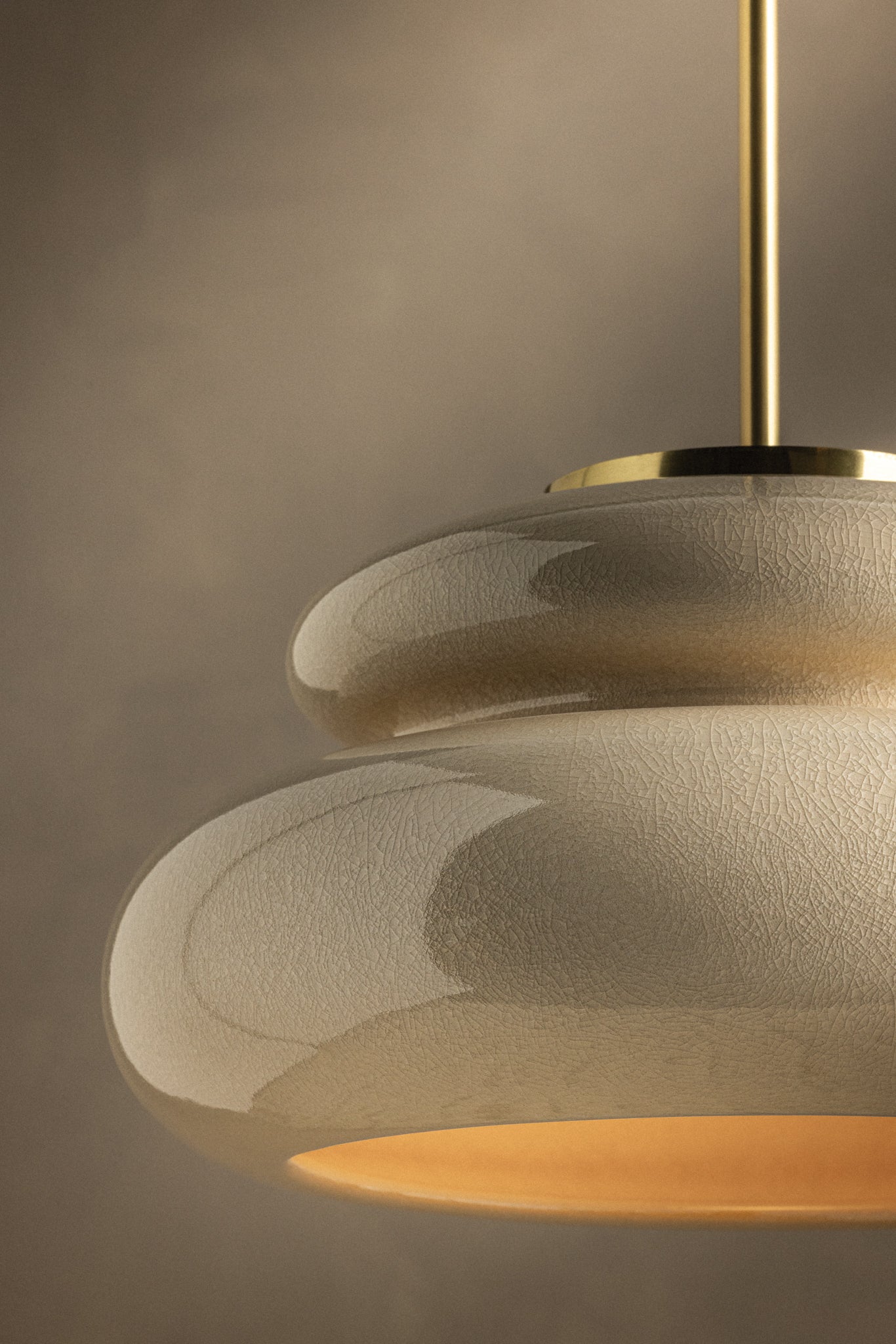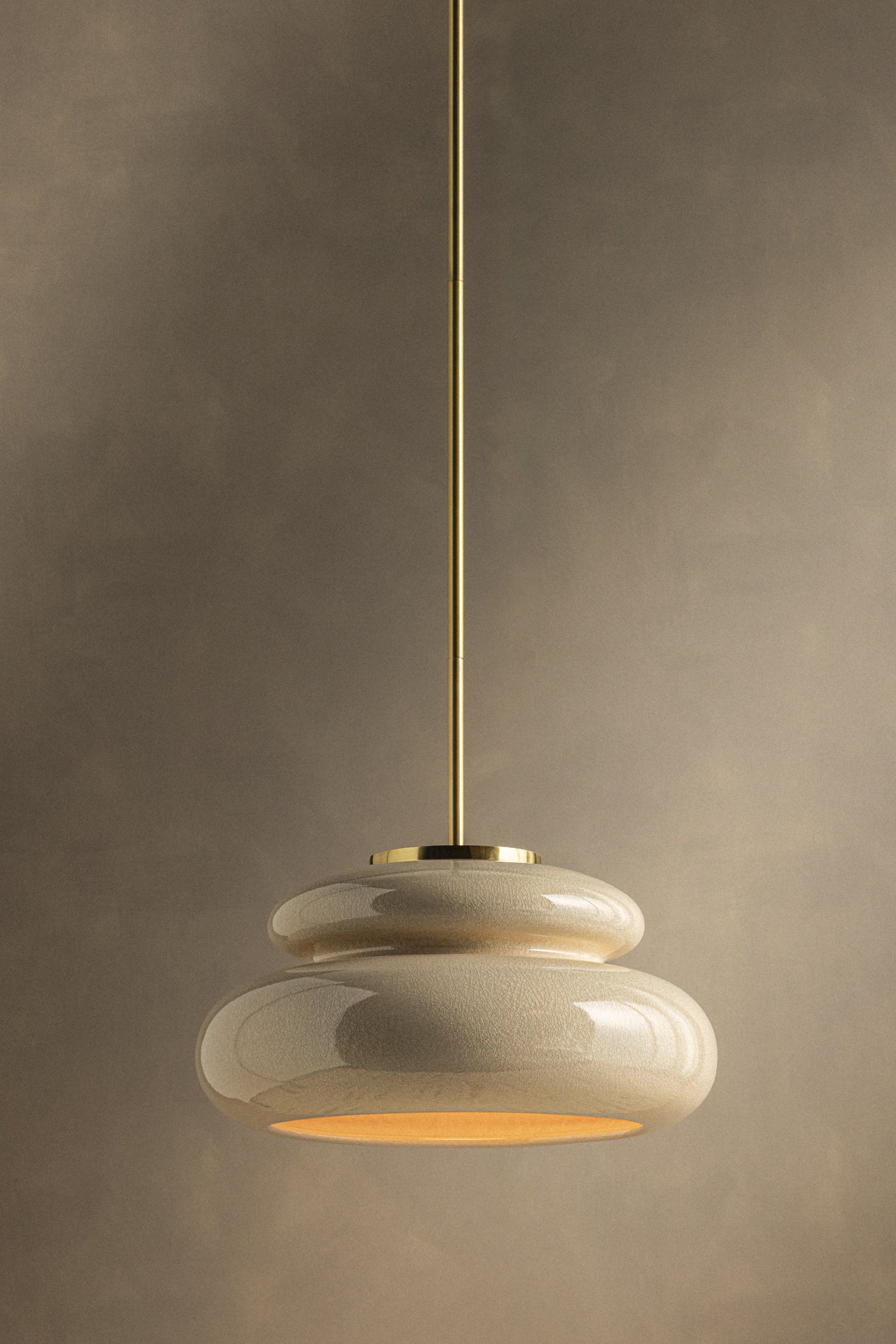 An exploration of voluminous forms and soft, endearing colors, the Pia family leans into the playful side of lighting. Stout proportions, generous curves, and stacked ceramic disc shapes lend an artisanal feel that is enhanced by the Butter Crackle and Chateau Crackle finishes. The table lamp is topped with a classic white linen drum shade, while the pendant, flush mount, and wall sconce cast light through a large oculus. Finished with Aged Brass hardware, this family adds artistic visual interest to any space. Part of our Hilary Matt x Mitzi Tastemakers collection.