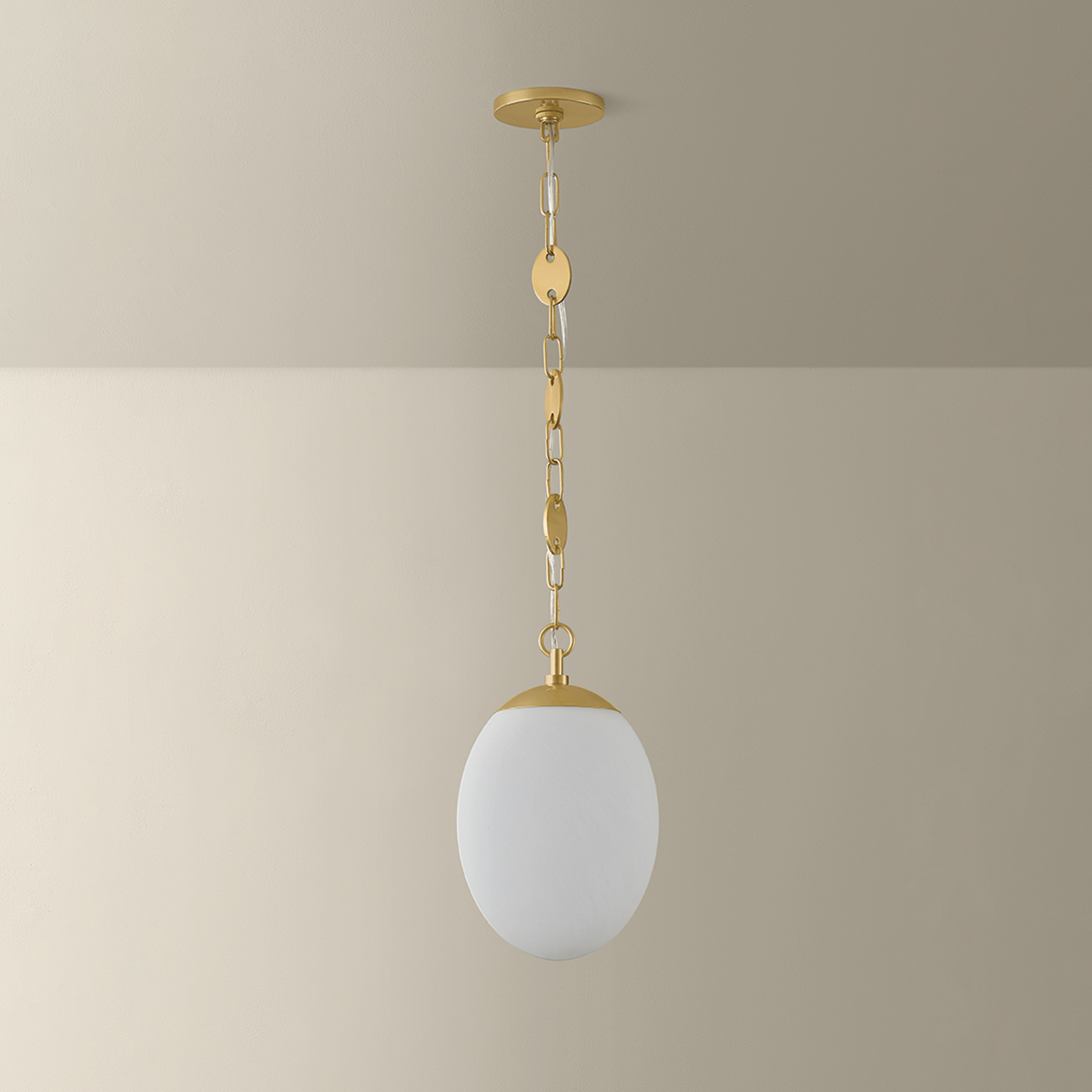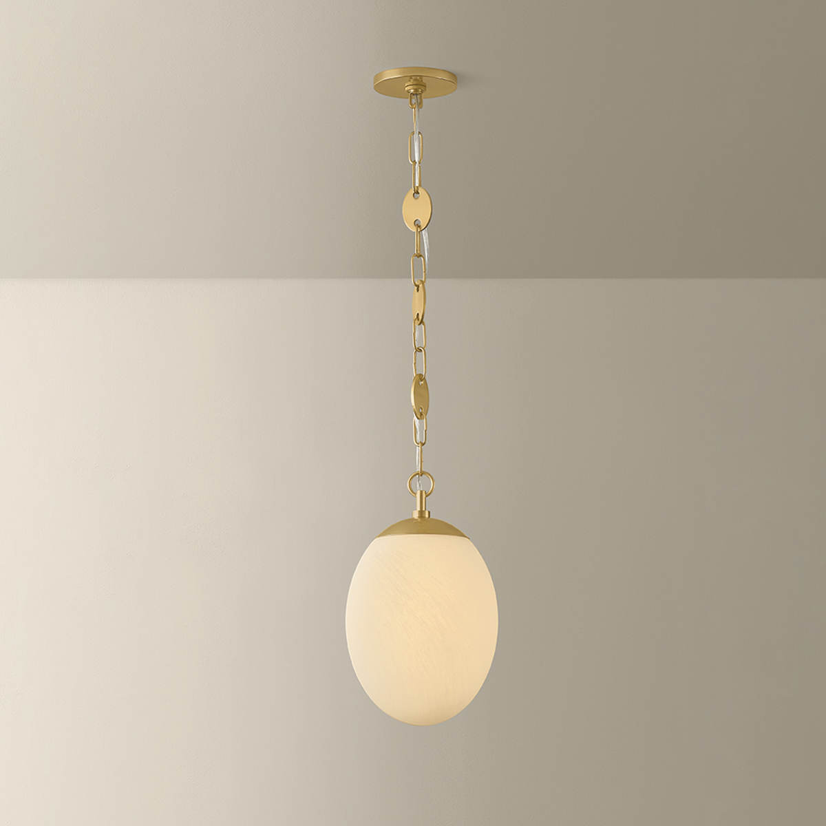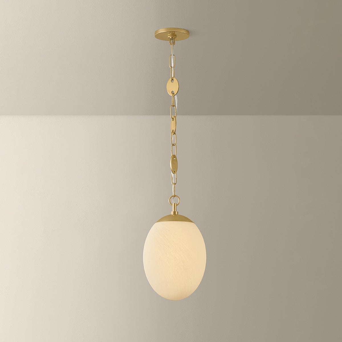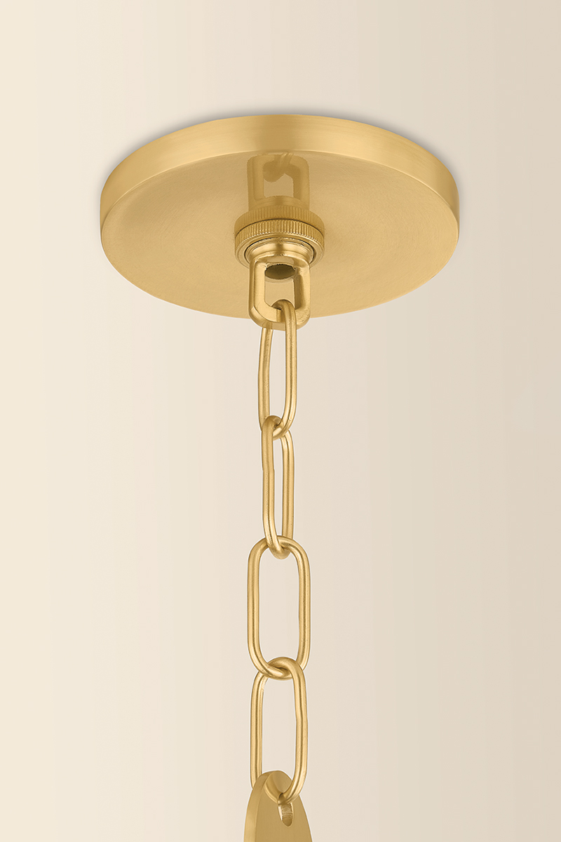 A specialty suspension and organic shaping elevate the Nell pendant into jewelry for the ceiling. Finished in Aged Brass, the chain’s delicate discs alternate with classic loops as they guide the eye to an elongated etched cloud glass globe. Available in two sizes, this single-light fixture lends itself beautifully to repetition, whether aligned along an island or gathered in a cluster to form an artful installation. Part of our Hilary Matt x Mitzi Tastemakers collection.