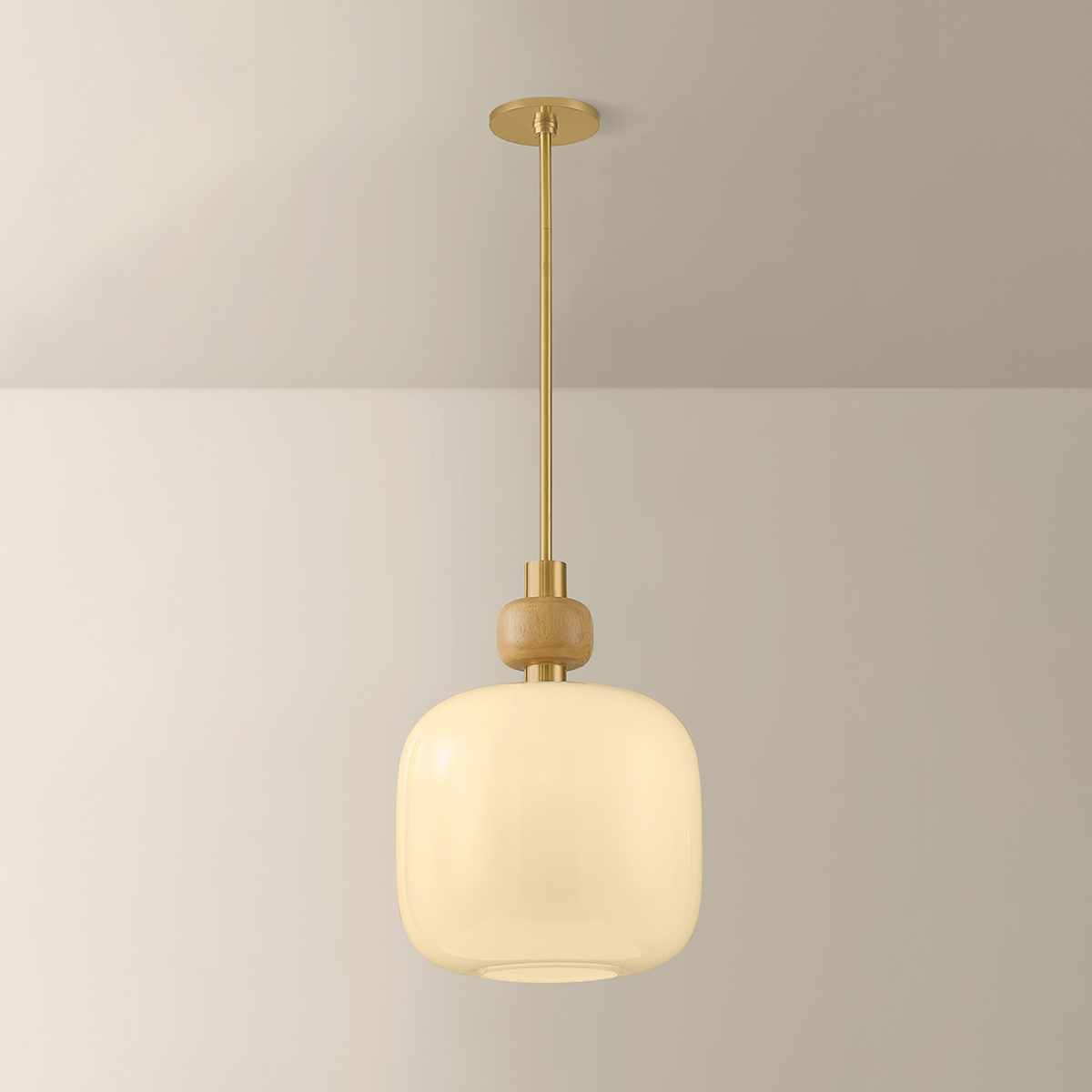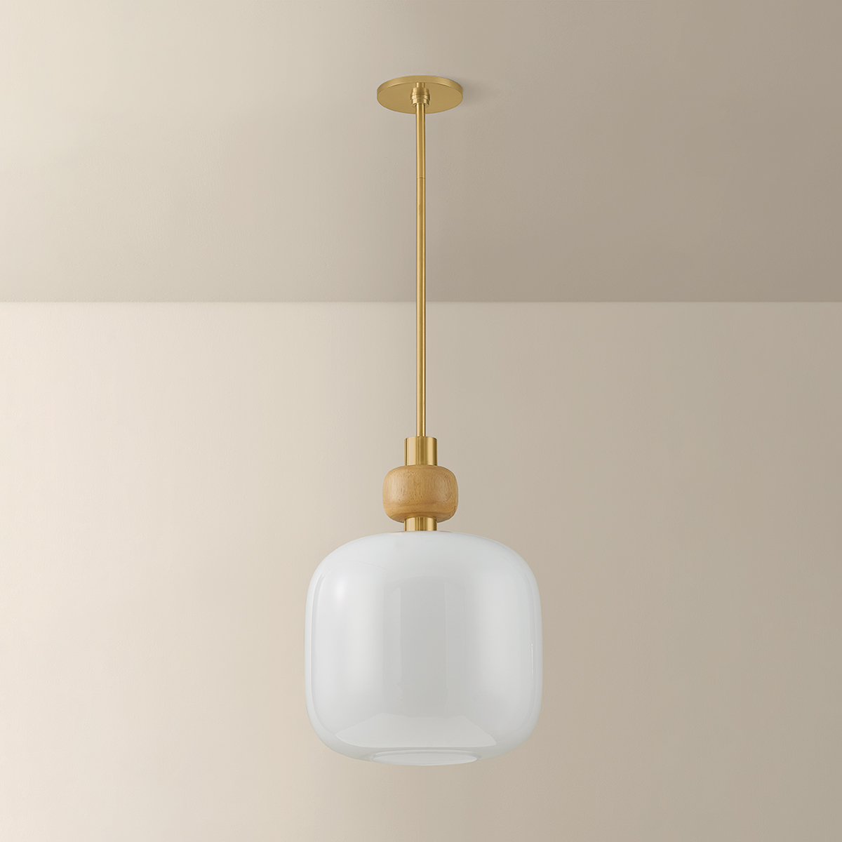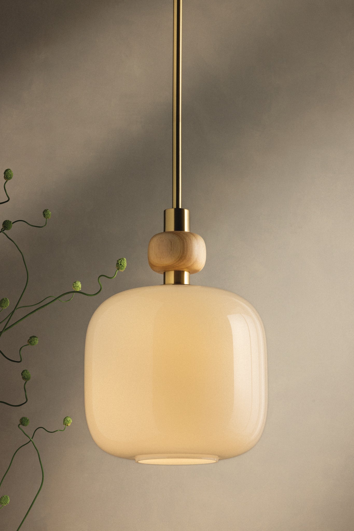 The charmingly modern Elise pendant elevates a minimalist silhouette with a memorable accent. Made of glossy white opal glass, the curved shade recalls a natural gemstone when lit, nodding to the idea of lighting as jewelry. A decorative oak bauble inspired by a bracelet adds a graphic detail to the fixture. Available in 12" and 15" sizes, Elise is finished with an Aged Brass stem. Part of our Hilary Matt x Mitzi Tastemakers collection.