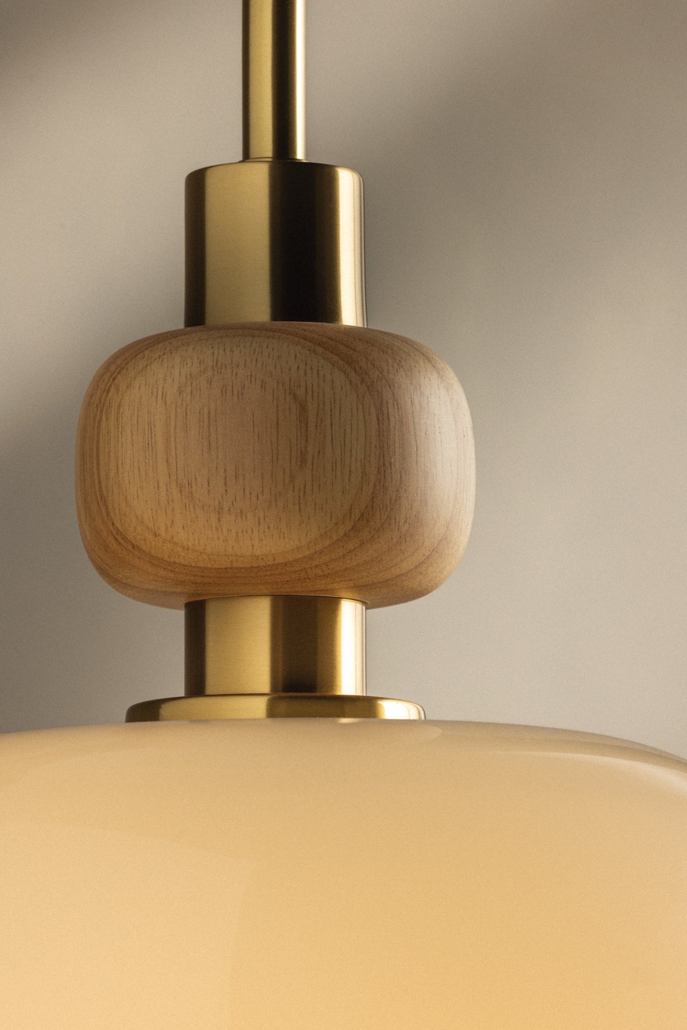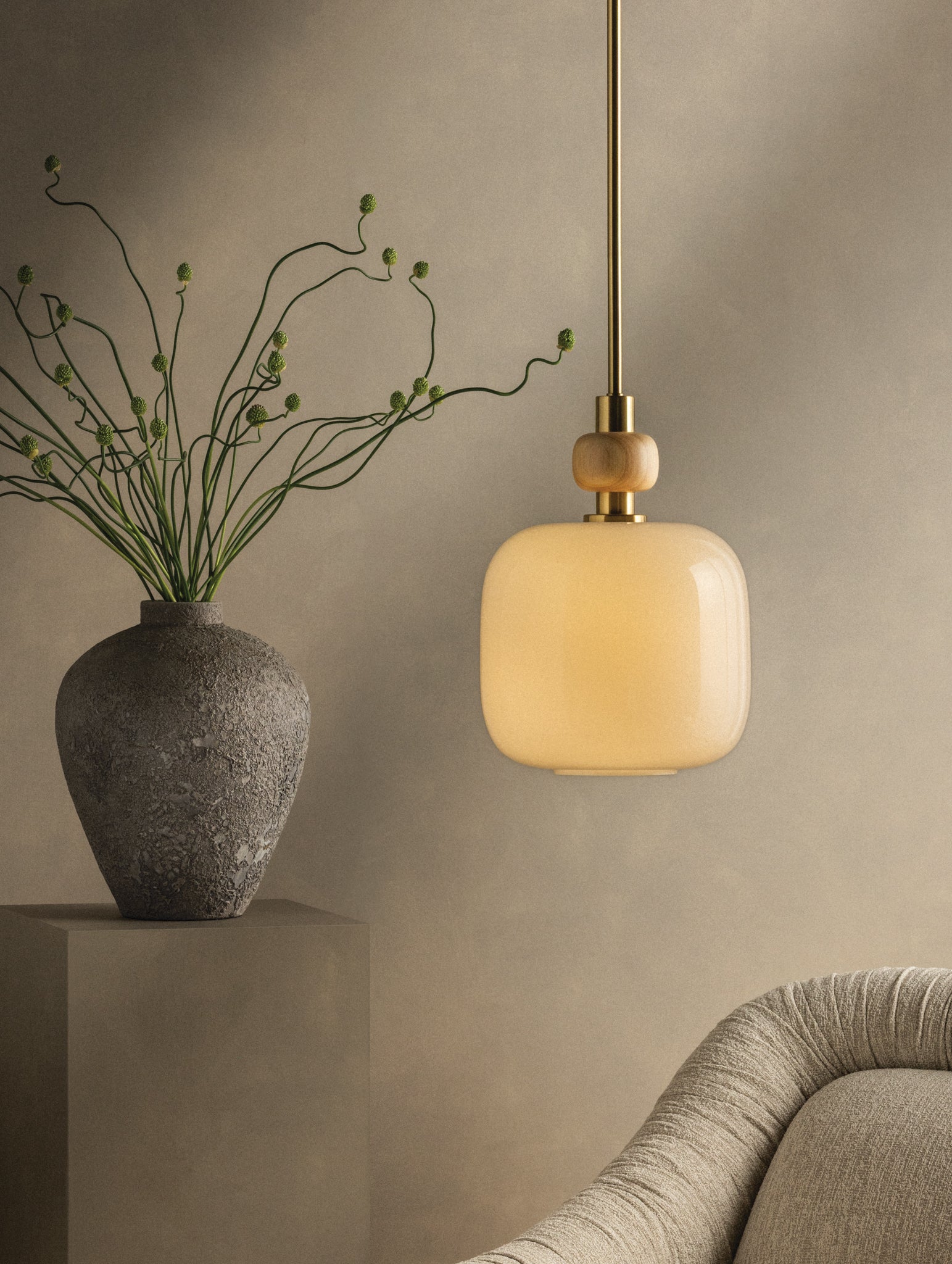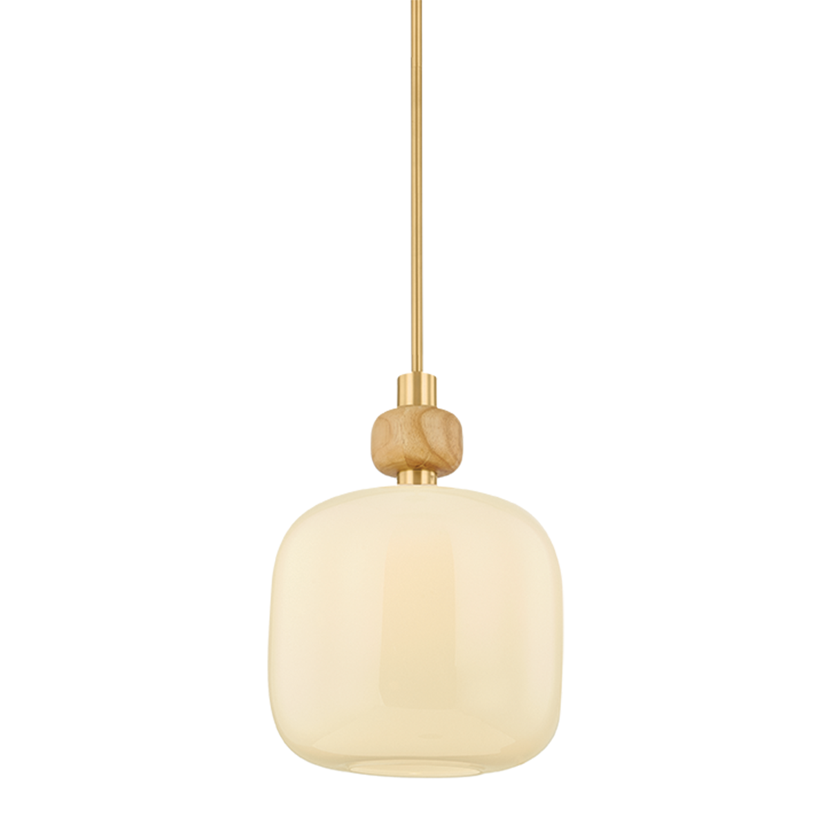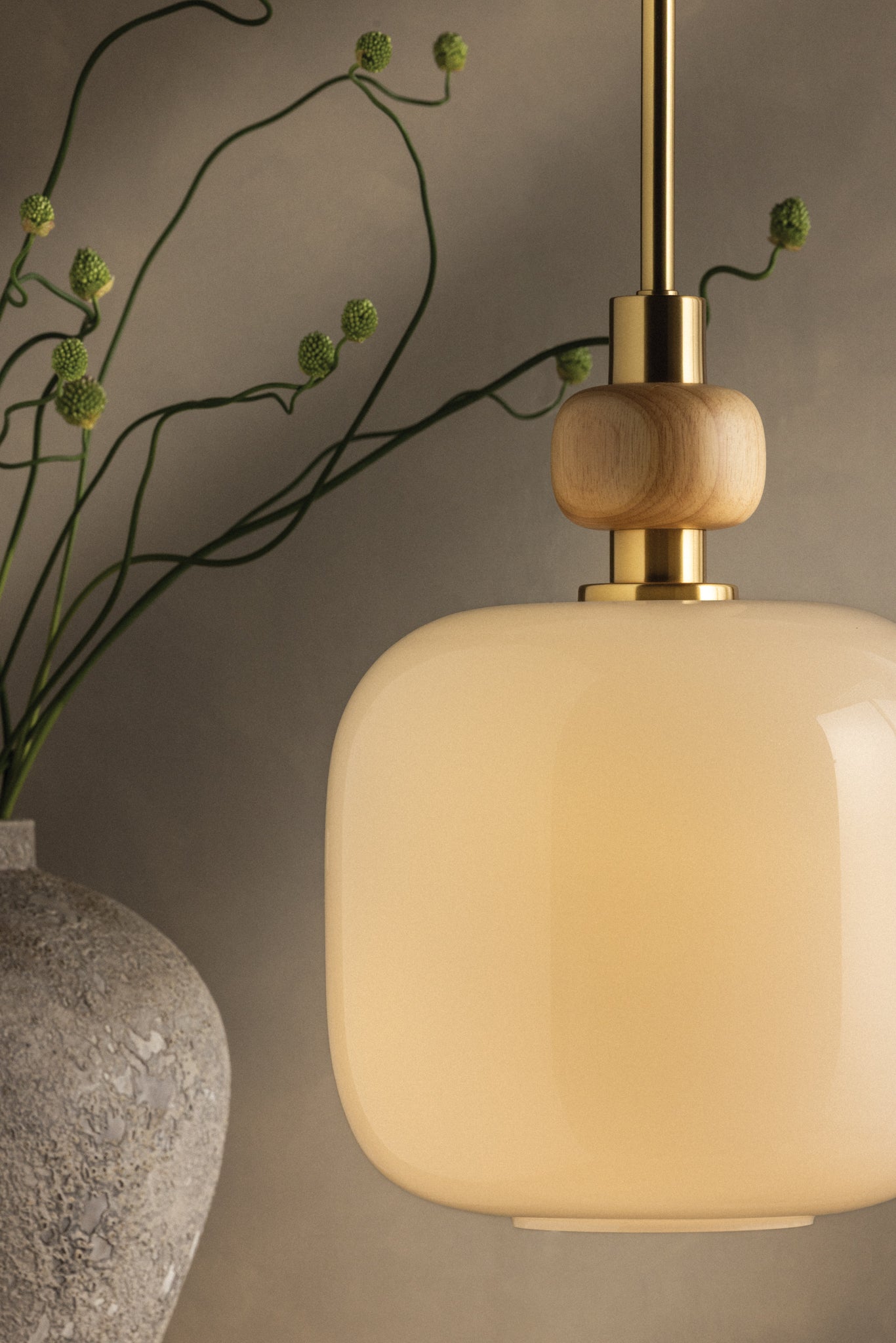 The charmingly modern Elise pendant elevates a minimalist silhouette with a memorable accent. Made of glossy white opal glass, the curved shade recalls a natural gemstone when lit, nodding to the idea of lighting as jewelry. A decorative oak bauble inspired by a bracelet adds a graphic detail to the fixture. Available in 12" and 15" sizes, Elise is finished with an Aged Brass stem. Part of our Hilary Matt x Mitzi Tastemakers collection.