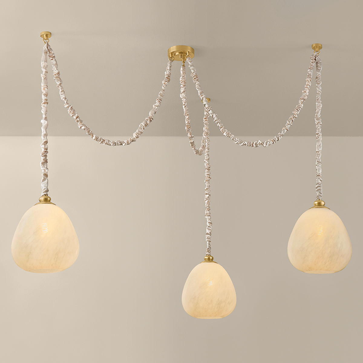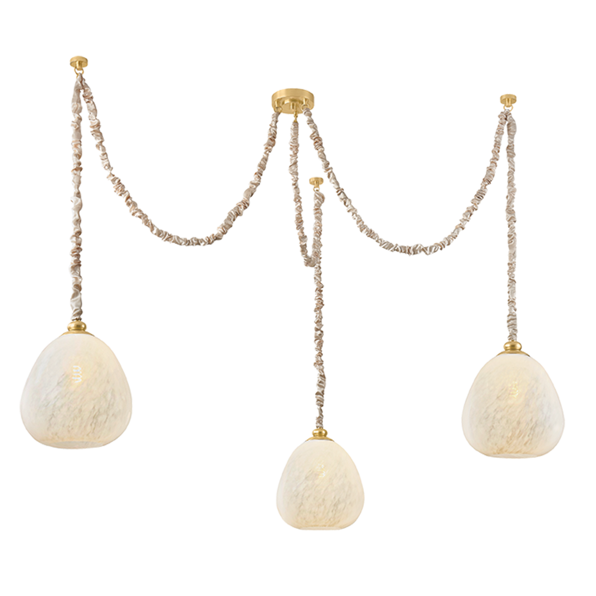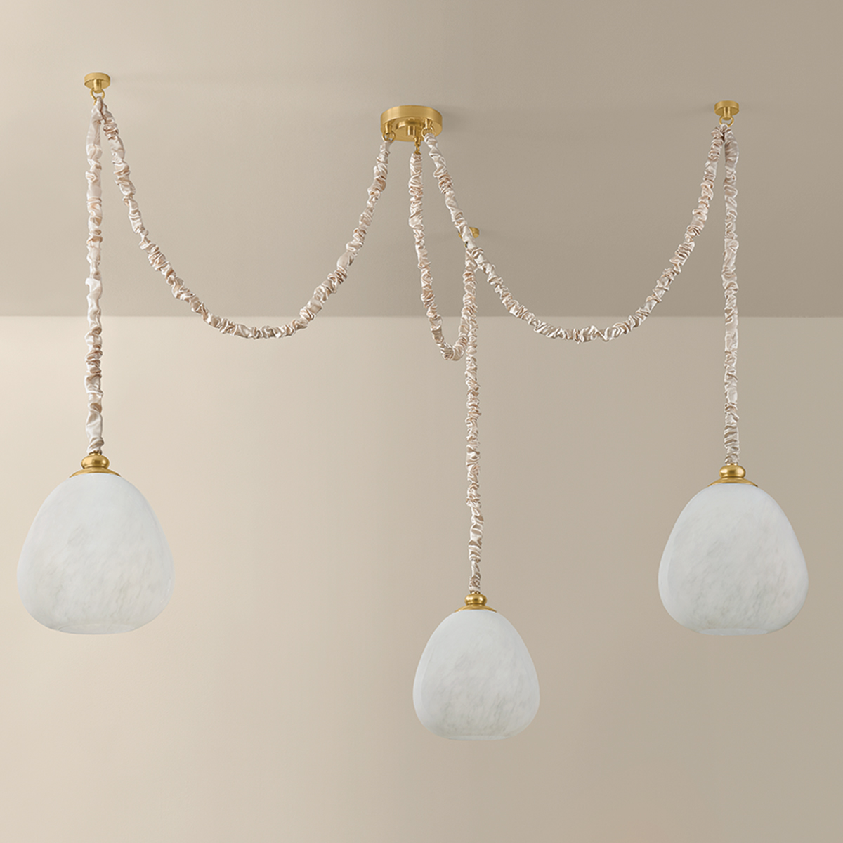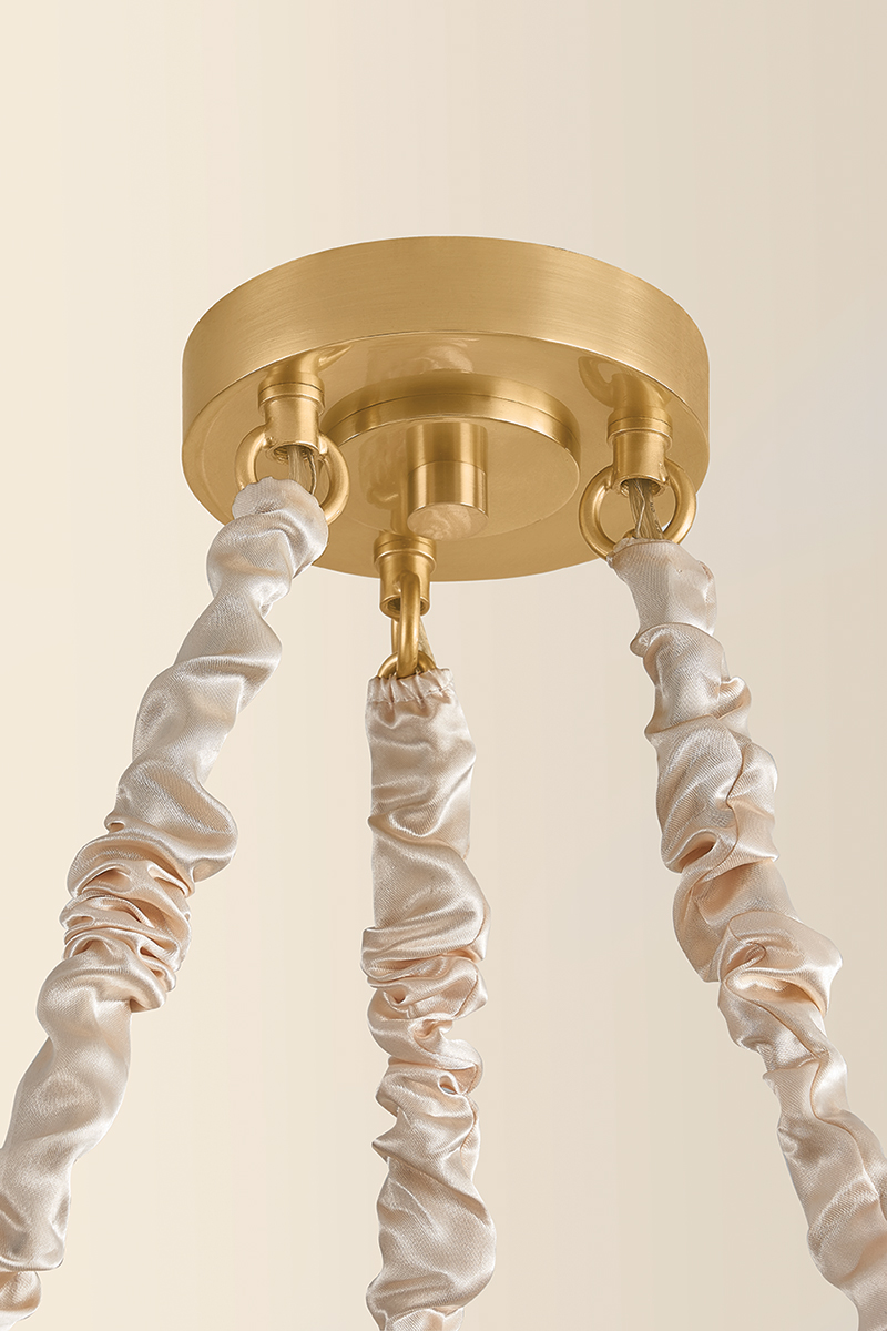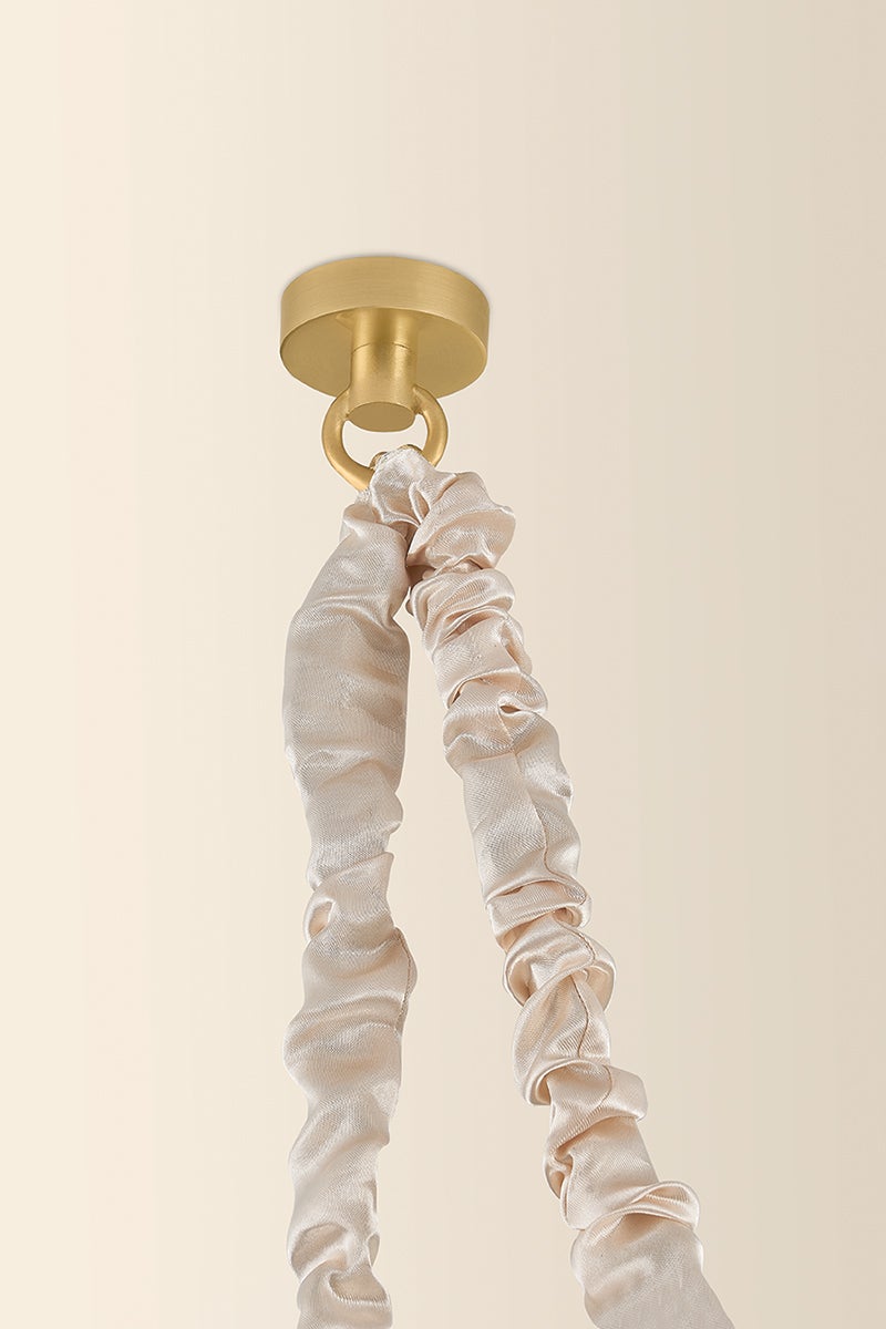 Imbued with a sense of Parisian romance, the Remi family’s use of textiles and artisanal glasswork is nothing short of ethereal. A white silk sleeve gathers over the suspension chain, supporting a clear cloud glass globe that floats in space like a drop of rain. The single-light pendant format serves as a delicate focal point, while the three-light swagged chandelier emits illumination to fill an entire room. Accents of Aged Brass unite each element of Remi. Part of our Hilary Matt x Mitzi Tastemakers collection.