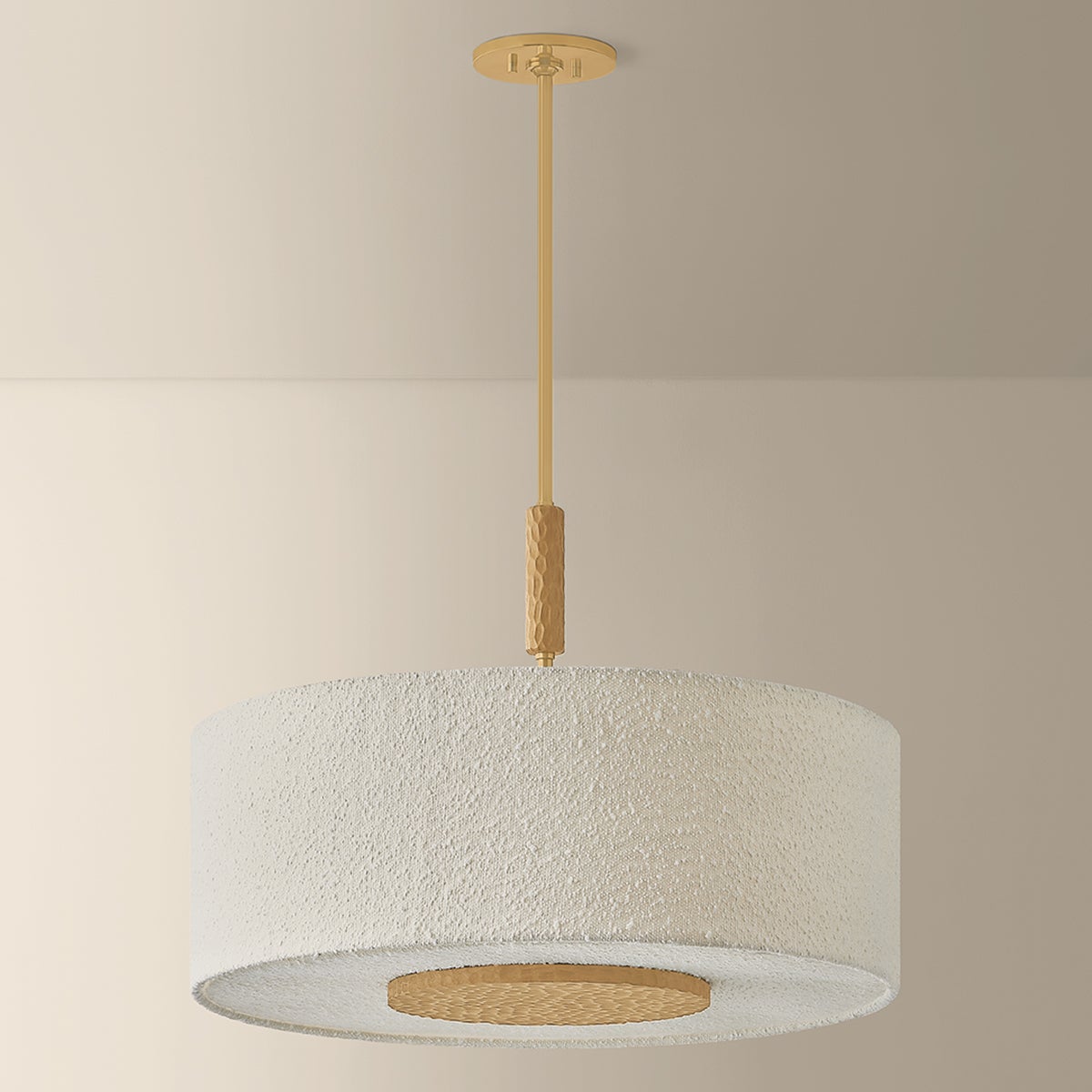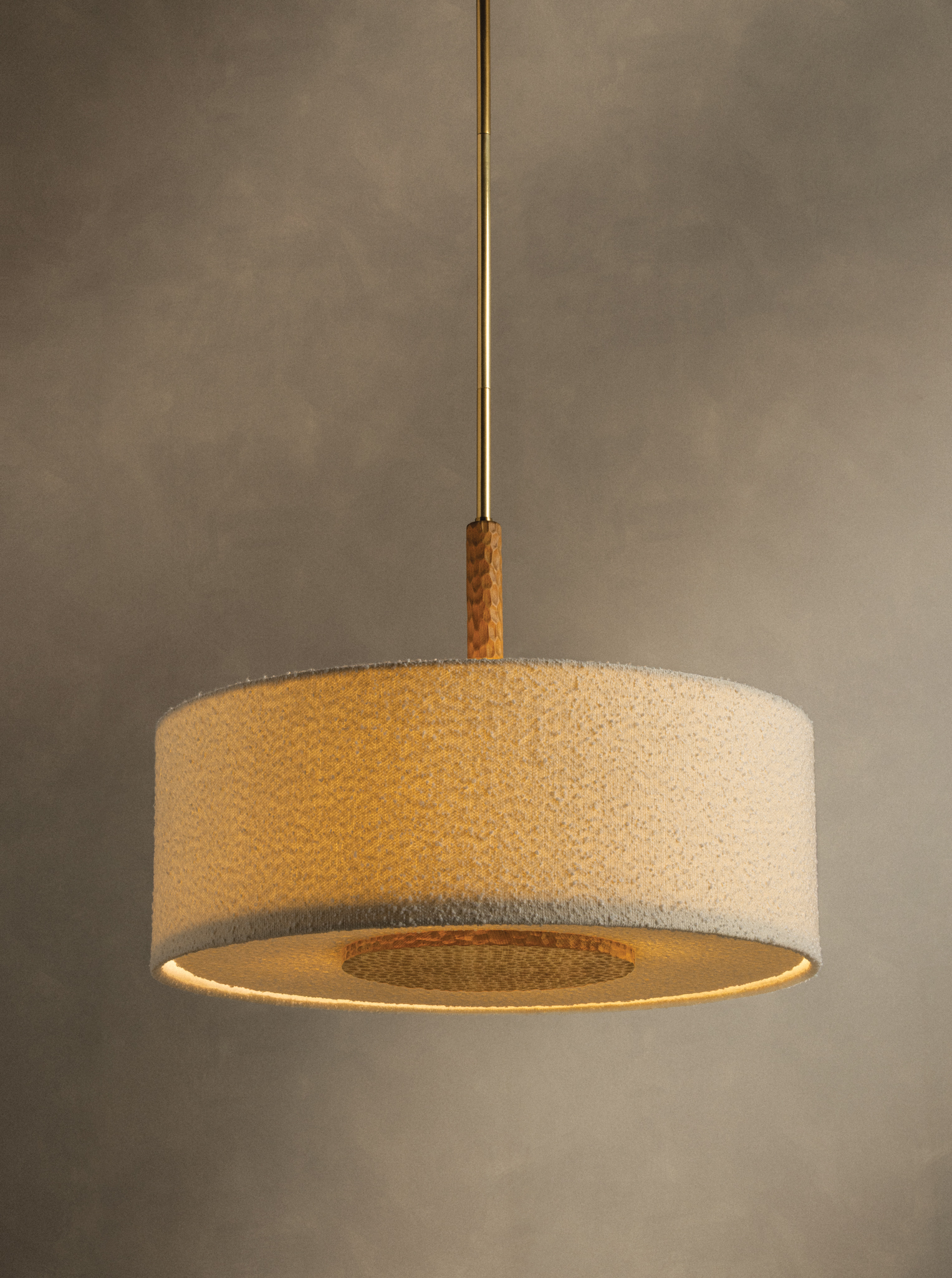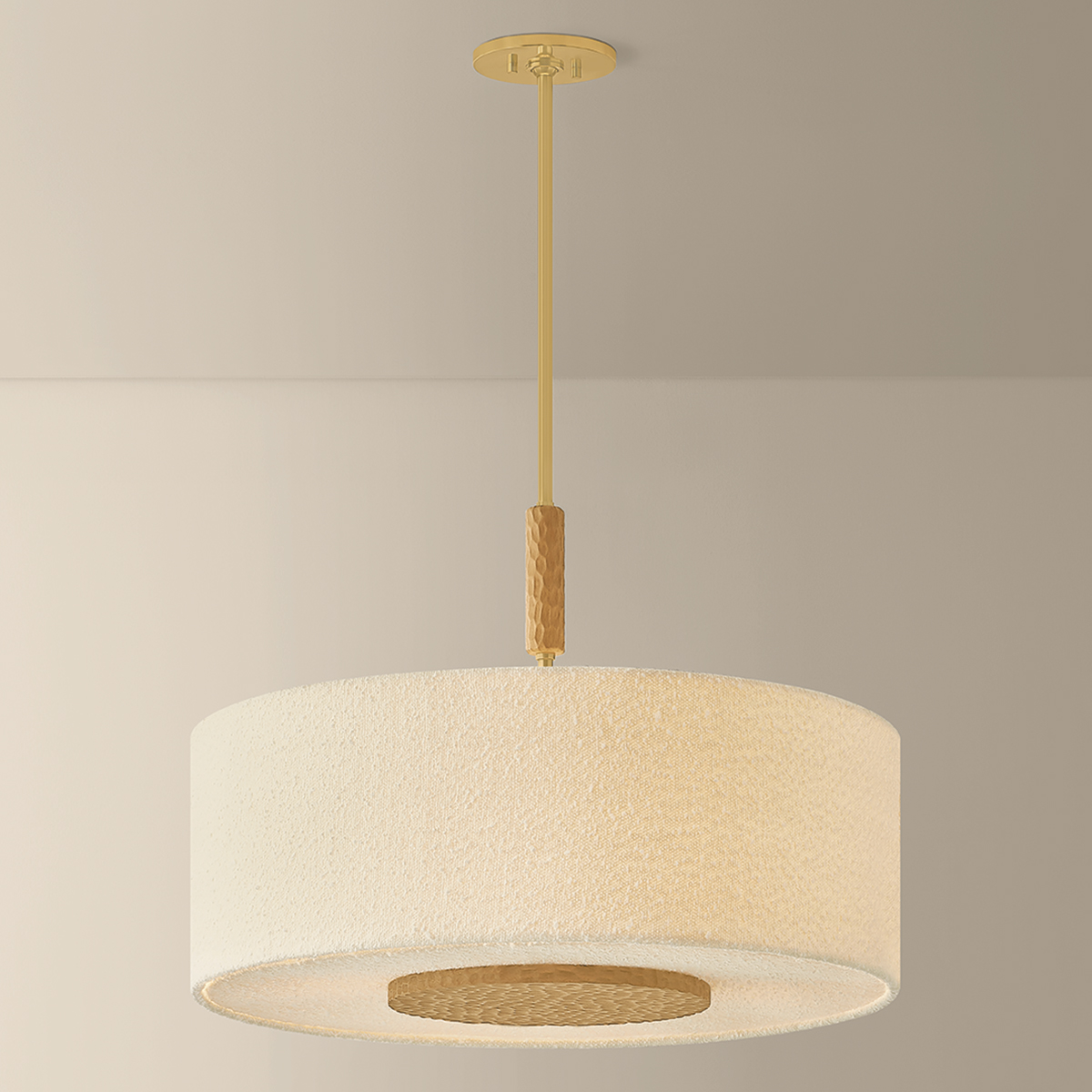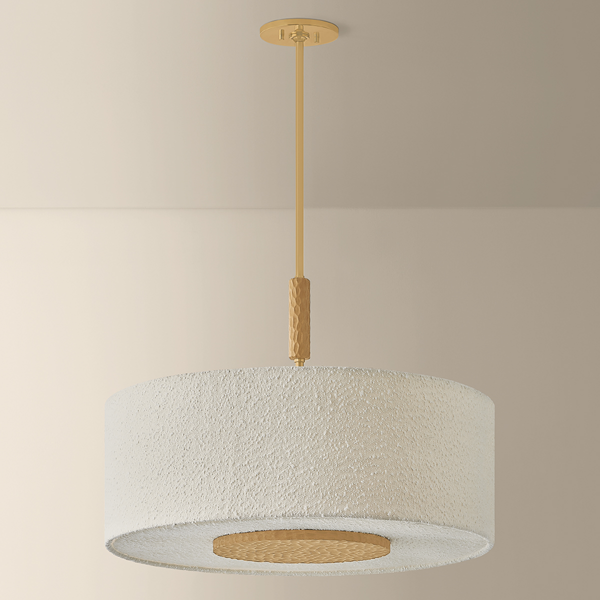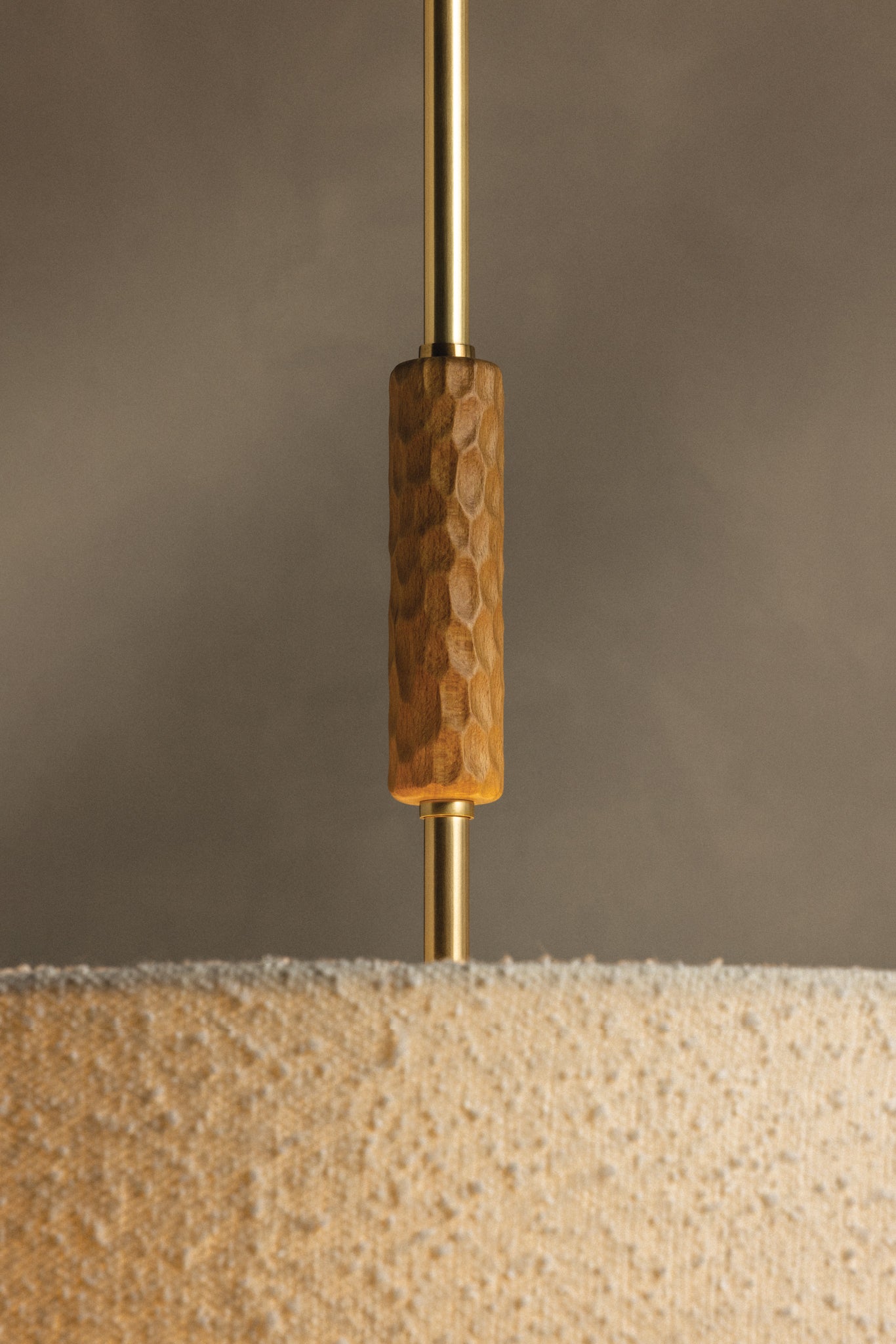Leaning into cozy minimalism, the Miller family pairs warm neutrals with high textural contrasts. Accented by chiseled light beechwood and Aged Brass elements, the large ivory boucle drum shades create a soft, voluminous statement overhead. Depending on the ceiling height, Miller is available as a flush mount, semi-flush mount, or pendant, bringing a sense of artful ease to living and dining spaces. Part of our Hilary Matt x Mitzi Tastemakers collection.