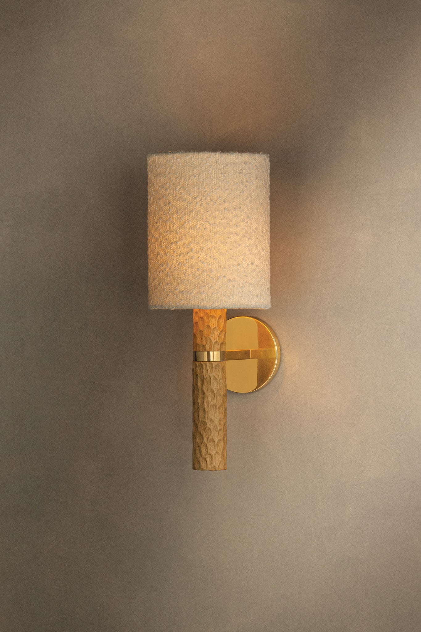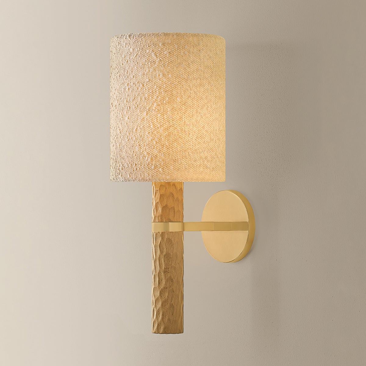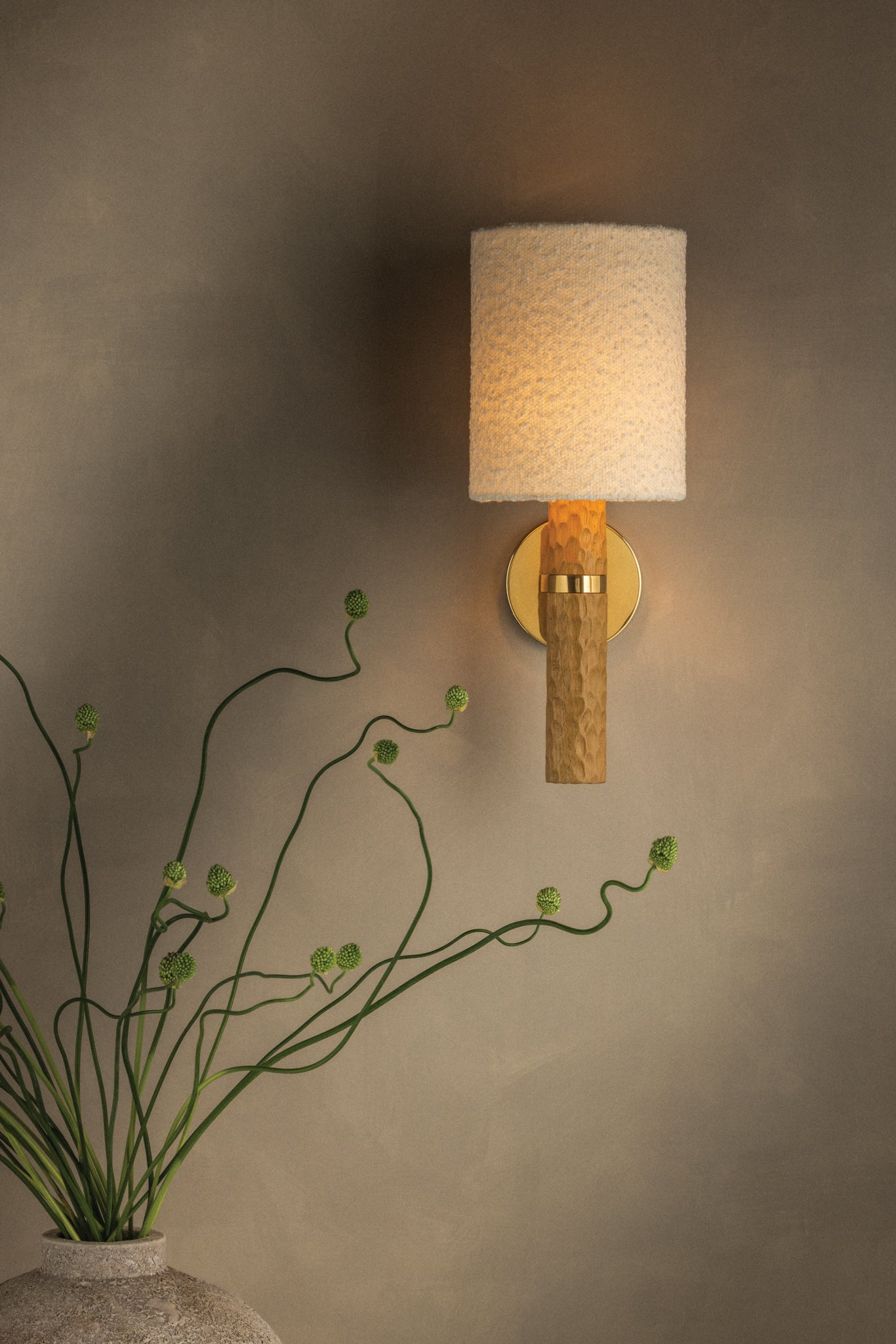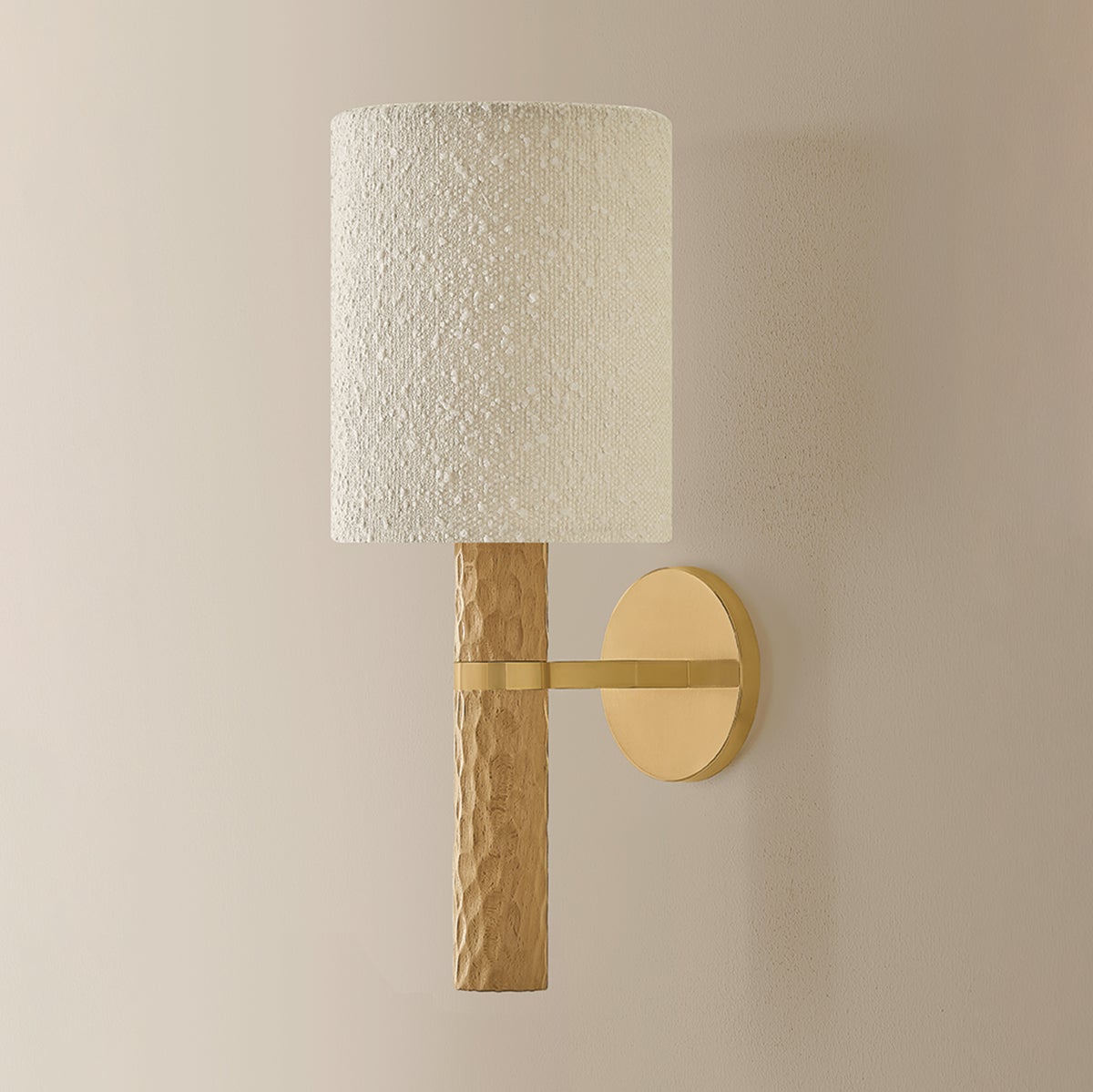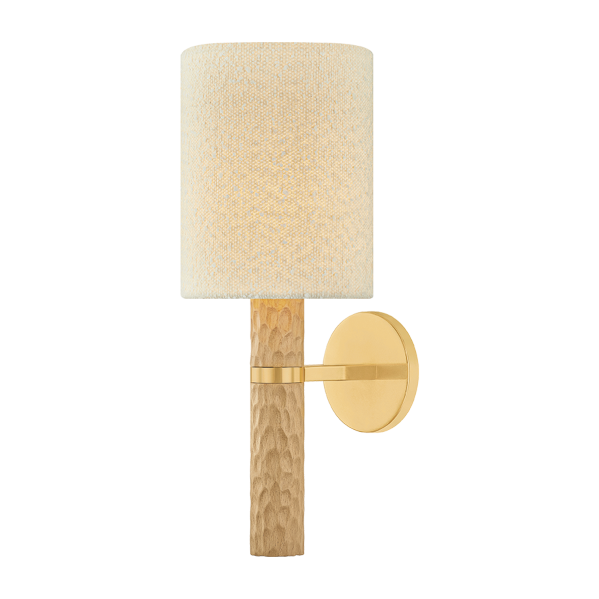 Guided by Hilary Matt’s design philosophy, the Jones family introduces a sense of playfulness to minimalist silhouettes through its considered proportions and textures. A chiseled light beech wood base is complemented by an ivory bouclé shade that softens the forms. In the sconce, an Aged Brass arm and backplate provide an industrial accent to balance the natural materials. As light moves across the wood, fabric, and metal, it creates an inviting, atmospheric presence. Also available as a table lamp, Jones makes for a distinctive accent piece in living rooms, bedrooms, and reading nooks. Part of our Hilary Matt x Mitzi Tastemakers collection.