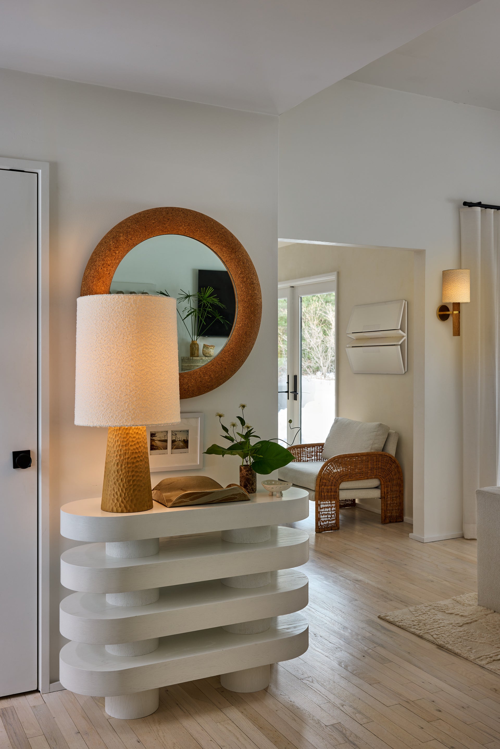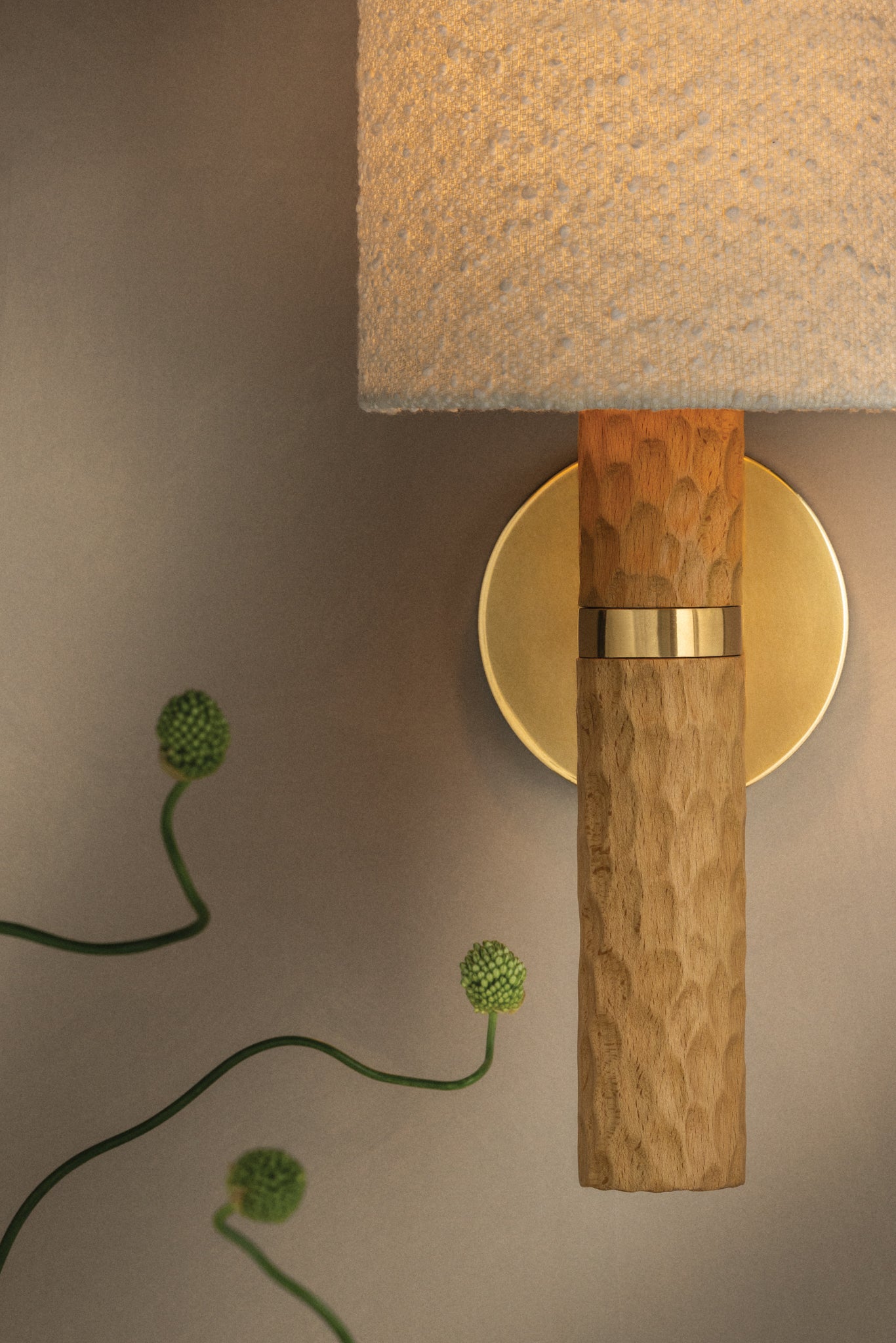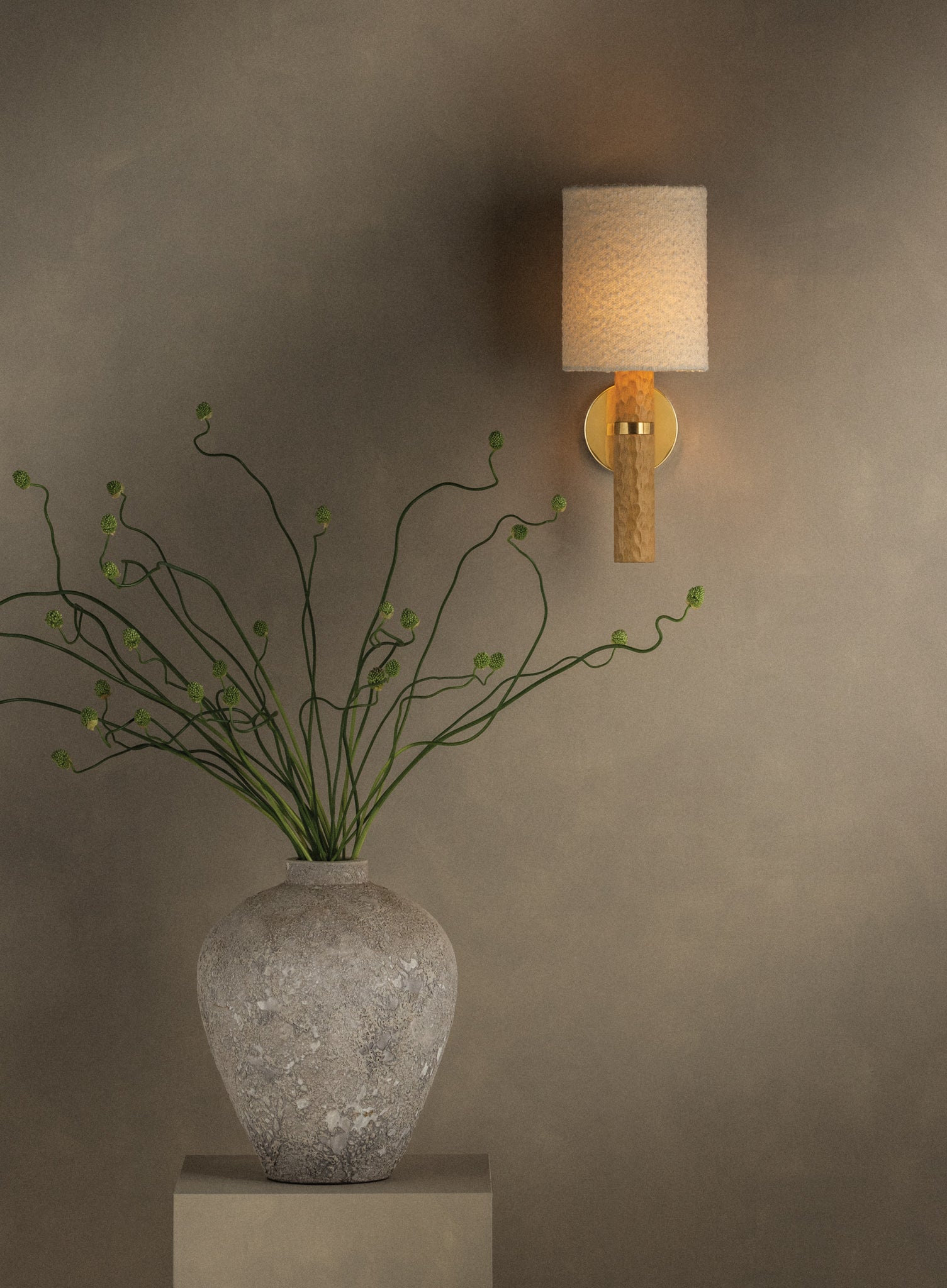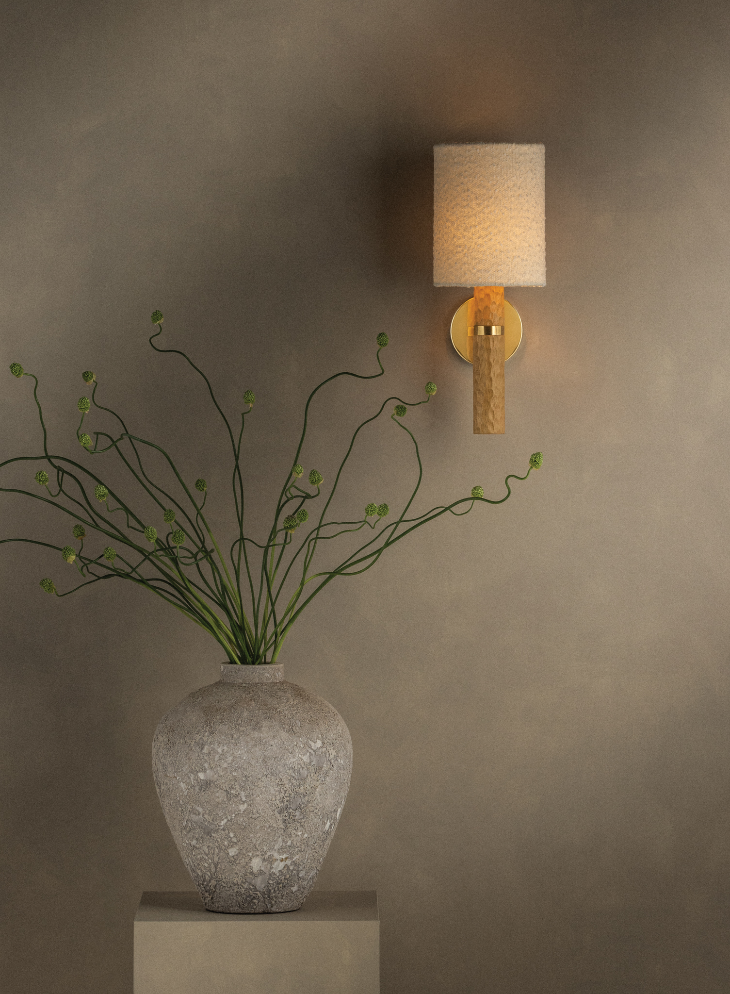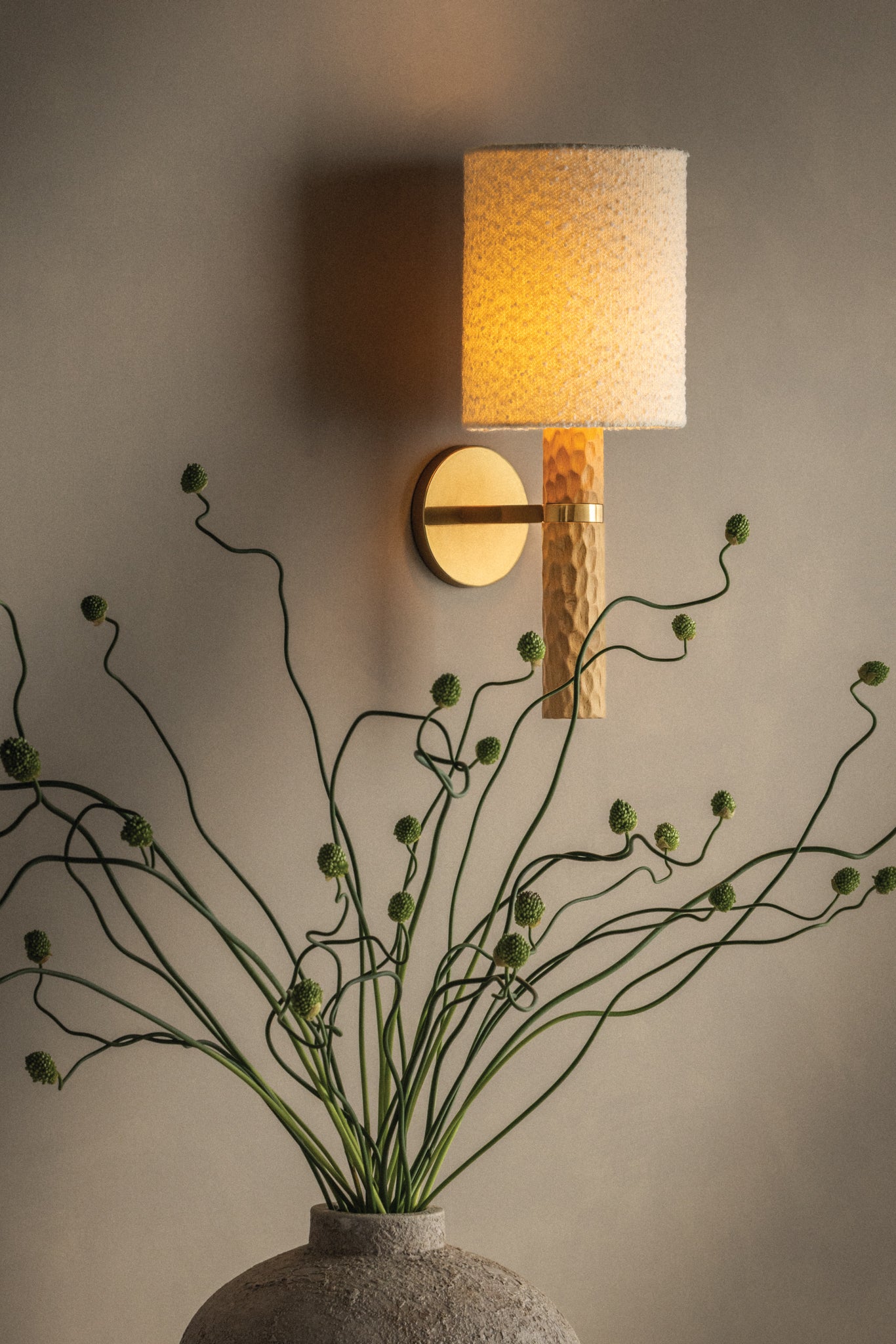 Guided by Hilary Matt’s design philosophy, the Jones family introduces a sense of playfulness to minimalist silhouettes through its considered proportions and textures. A chiseled light beech wood base is complemented by an ivory bouclé shade that softens the forms. In the sconce, an Aged Brass arm and backplate provide an industrial accent to balance the natural materials. As light moves across the wood, fabric, and metal, it creates an inviting, atmospheric presence. Also available as a table lamp, Jones makes for a distinctive accent piece in living rooms, bedrooms, and reading nooks. Part of our Hilary Matt x Mitzi Tastemakers collection.