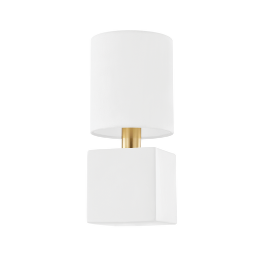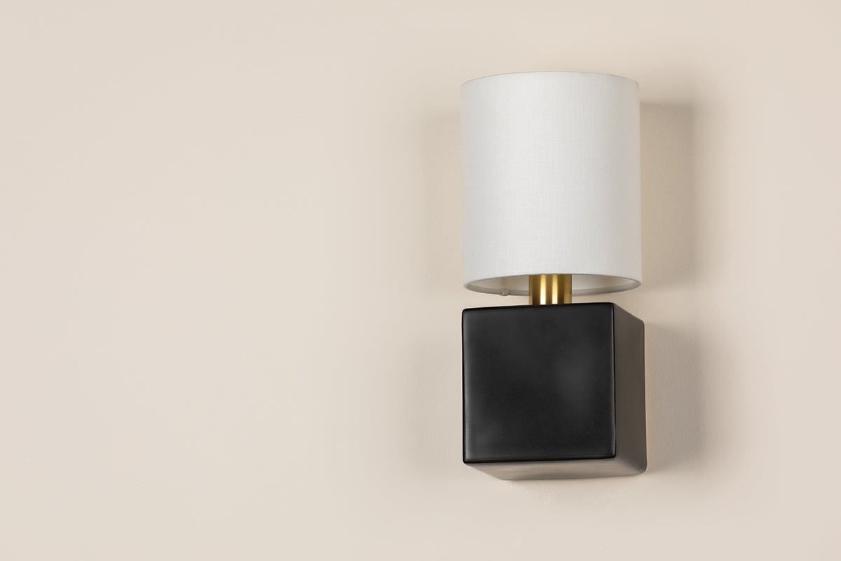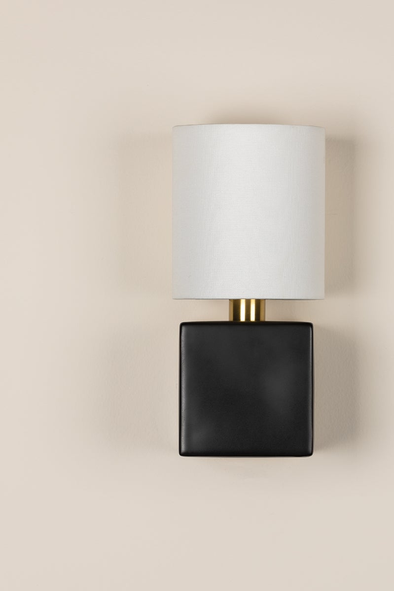 Transitional and trendy, the Joey Wall Sconce features a ceramic base, satin black or white finish, and a white linen shade. The circular shade plays off the square base, lending a geometric quality to the simplistic form.