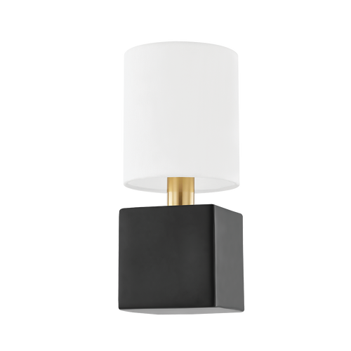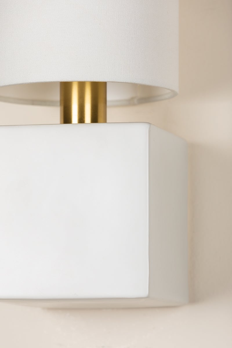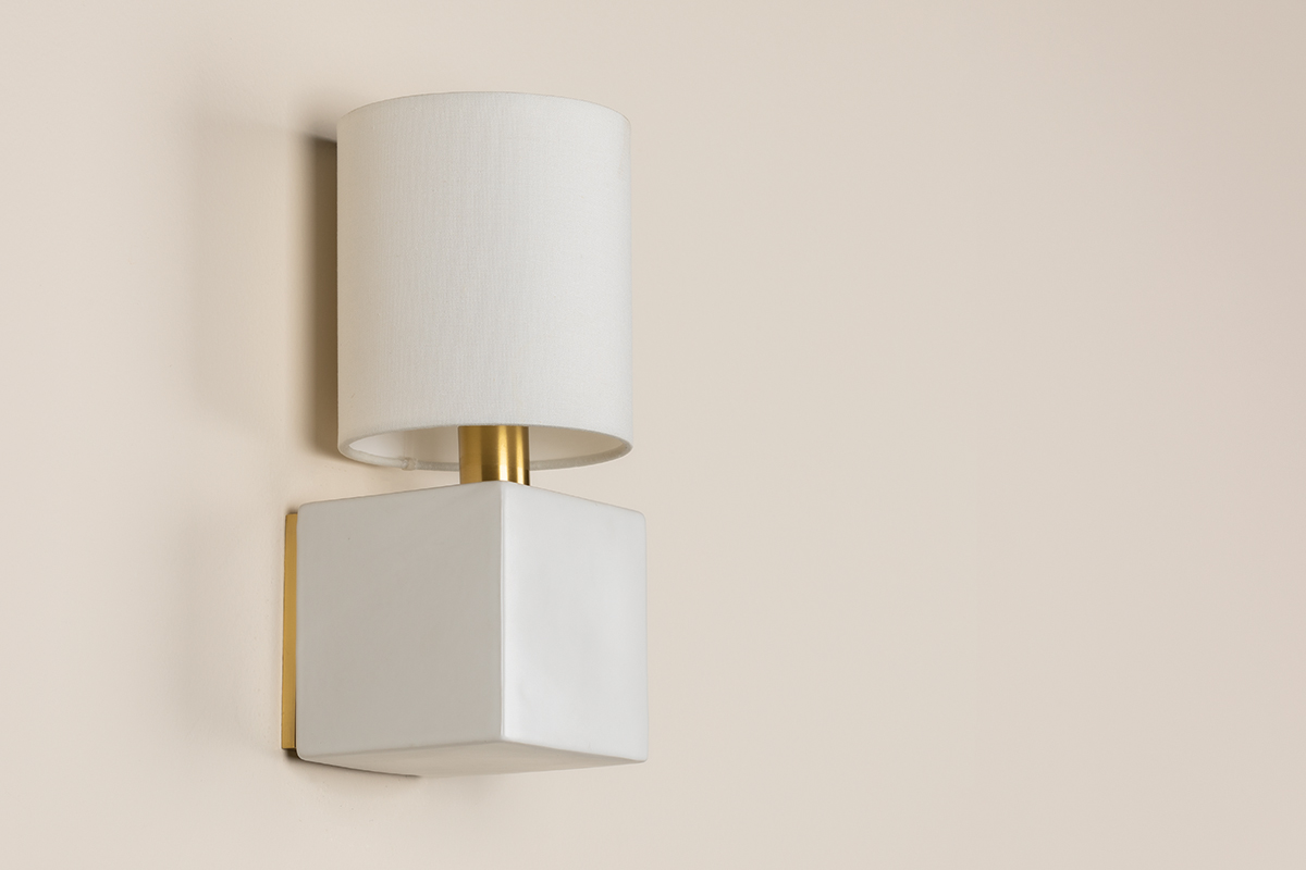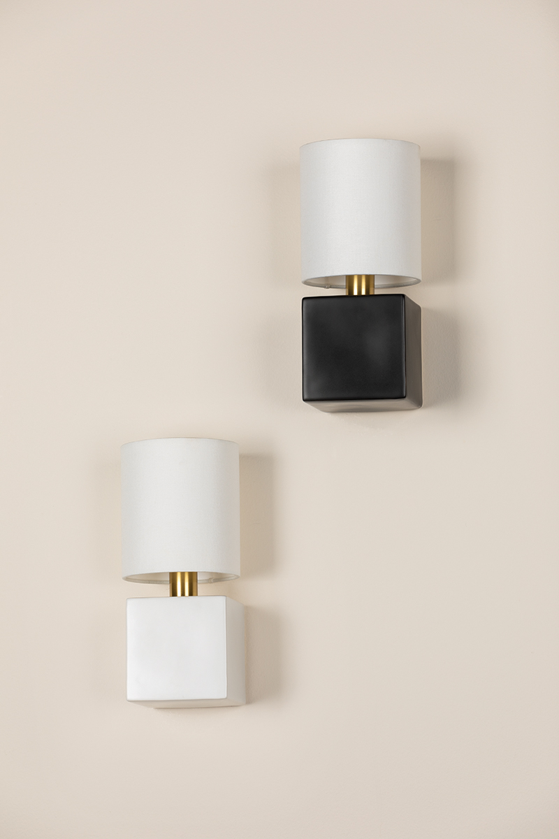Transitional and trendy, the Joey Wall Sconce features a ceramic base, satin black or white finish, and a white linen shade. The circular shade plays off the square base, lending a geometric quality to the simplistic form.