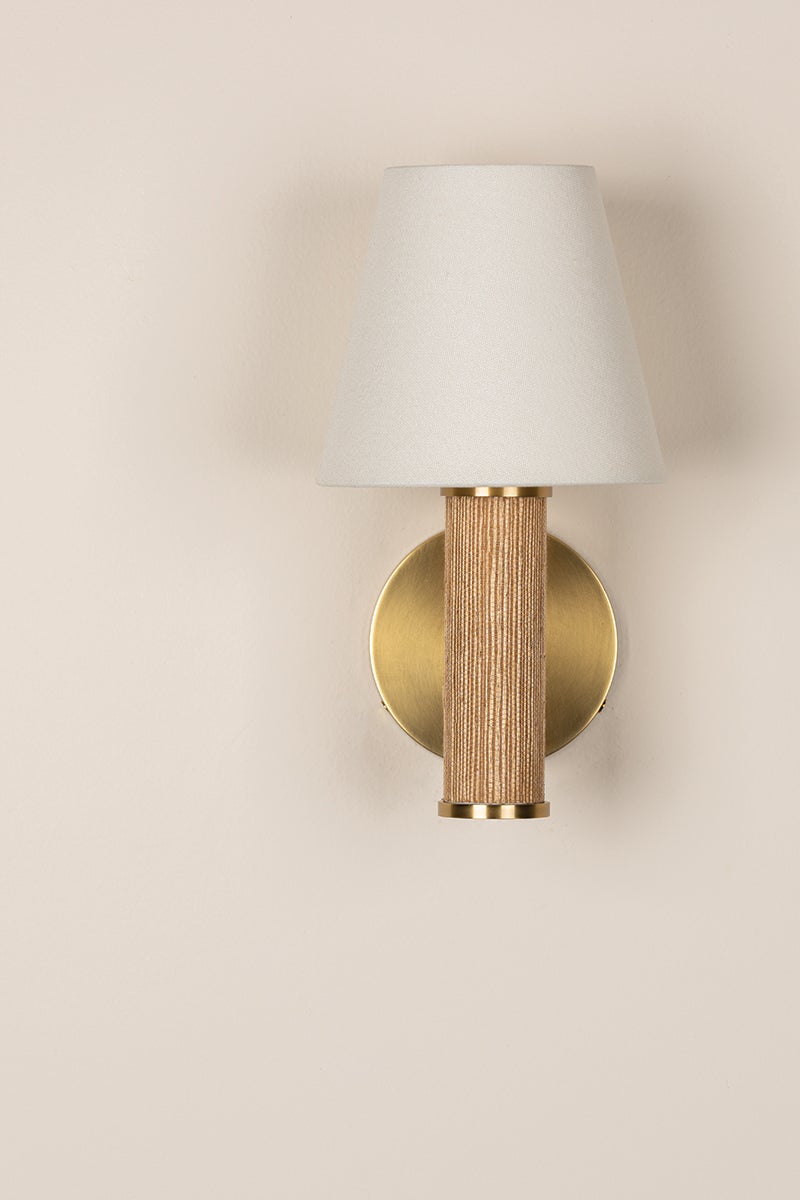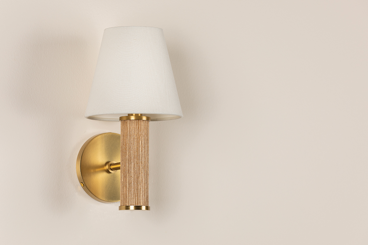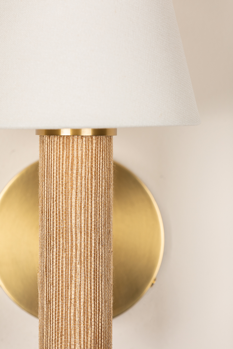 Bring a little sunshine into your space with Amabella. Inspired by resort design, the 1- or 2-light wall sconce moves between modern and coastal by mixing tone and texture. Grasscloth wraps around the tubular form, contrasted with aged brass accents. Exposed bulbs add a more contemporary quality to the piece.