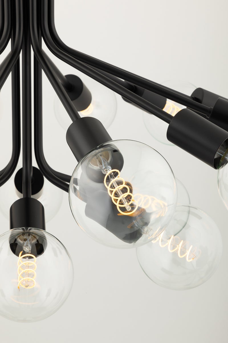 The Drea Wall Sconce, Chandelier, and Semi Flush feature a soft black finish on pivoting arms. Traditional clear bulbs transform the design.