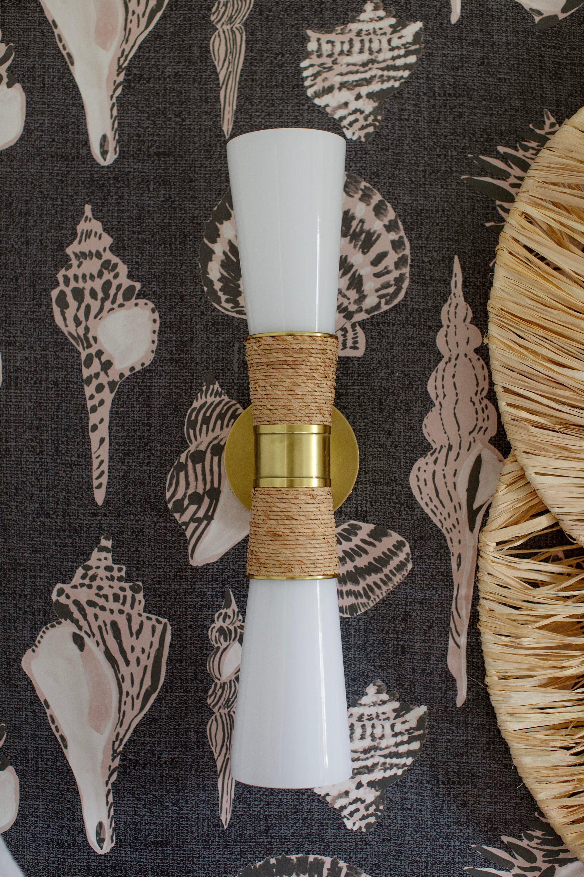 Balancing coastal charm with quiet luxury, Mica emits a gentle wash of light in kitchens and powder rooms. Its sleek silhouette is accented by wrapped raffia, an organic touch that makes this fixture feel approachable. Mica is available as a pendant in two sizes, or a wall sconce with one or two shades. Part of our Megan Molten x Mitzi Tastemakers collection.