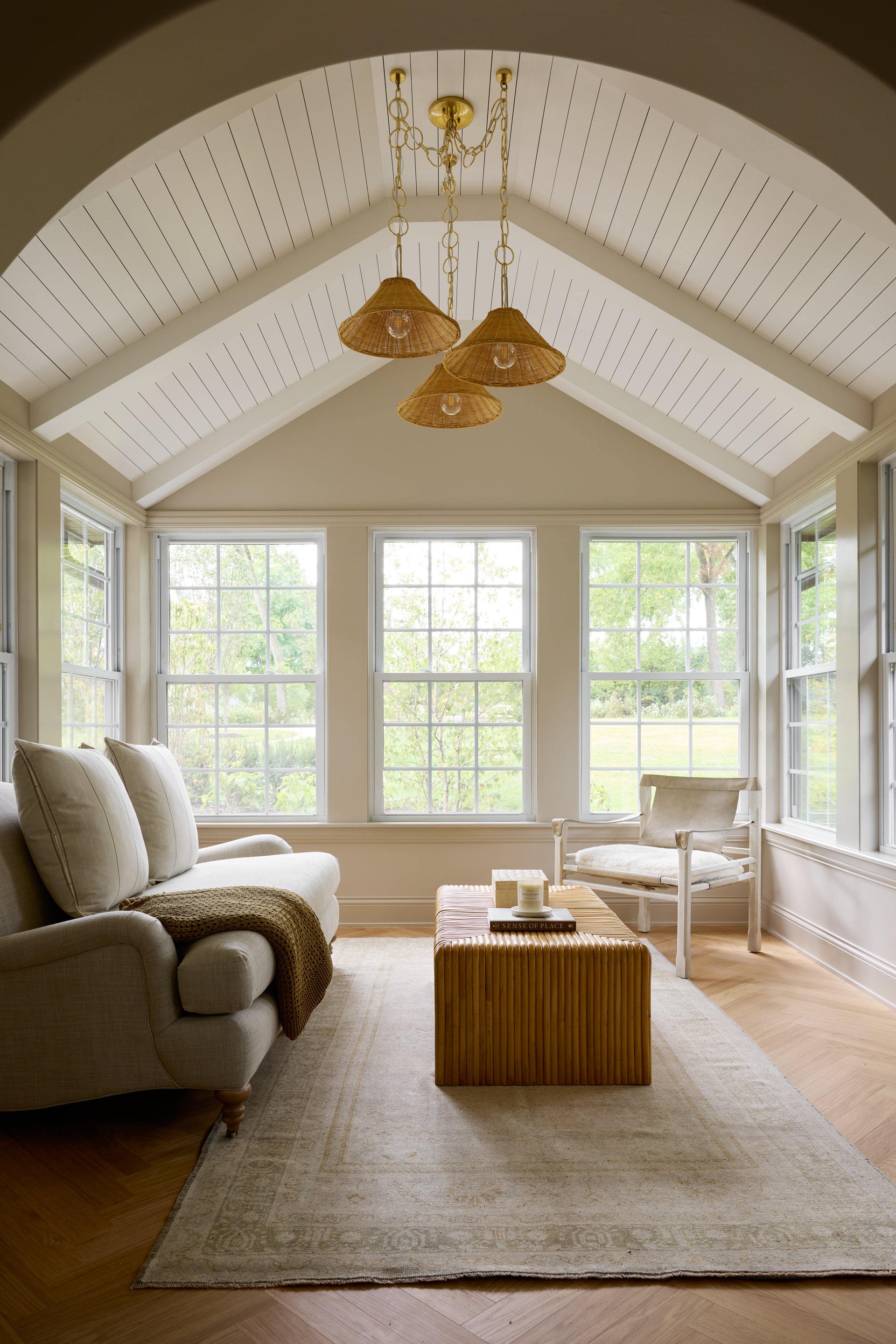 "Updating a classic silhouette with contemporary materiality, Dalia features a large, tapered shade woven from rattan wicker. The refined metal work is finished in Aged Brass, adding a timeless, vintage quality to the fixture. Available as a 1-light sconce or 3-light chandelier, Dalia introduces a pop of texture and style to any space.