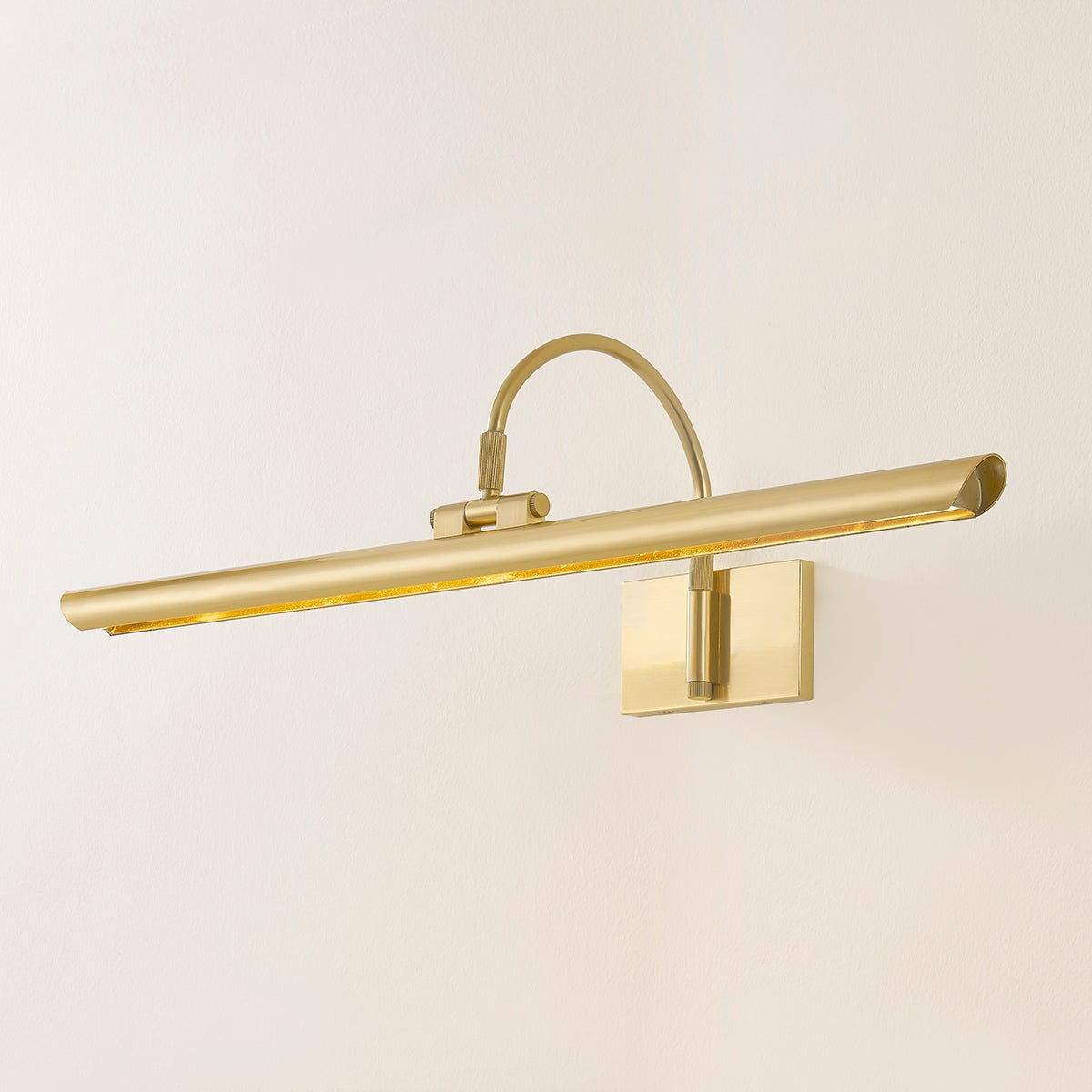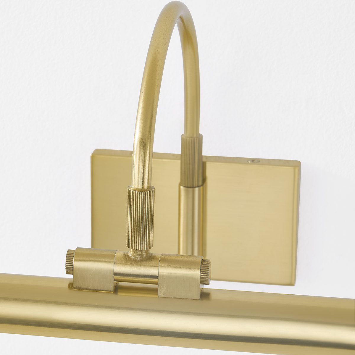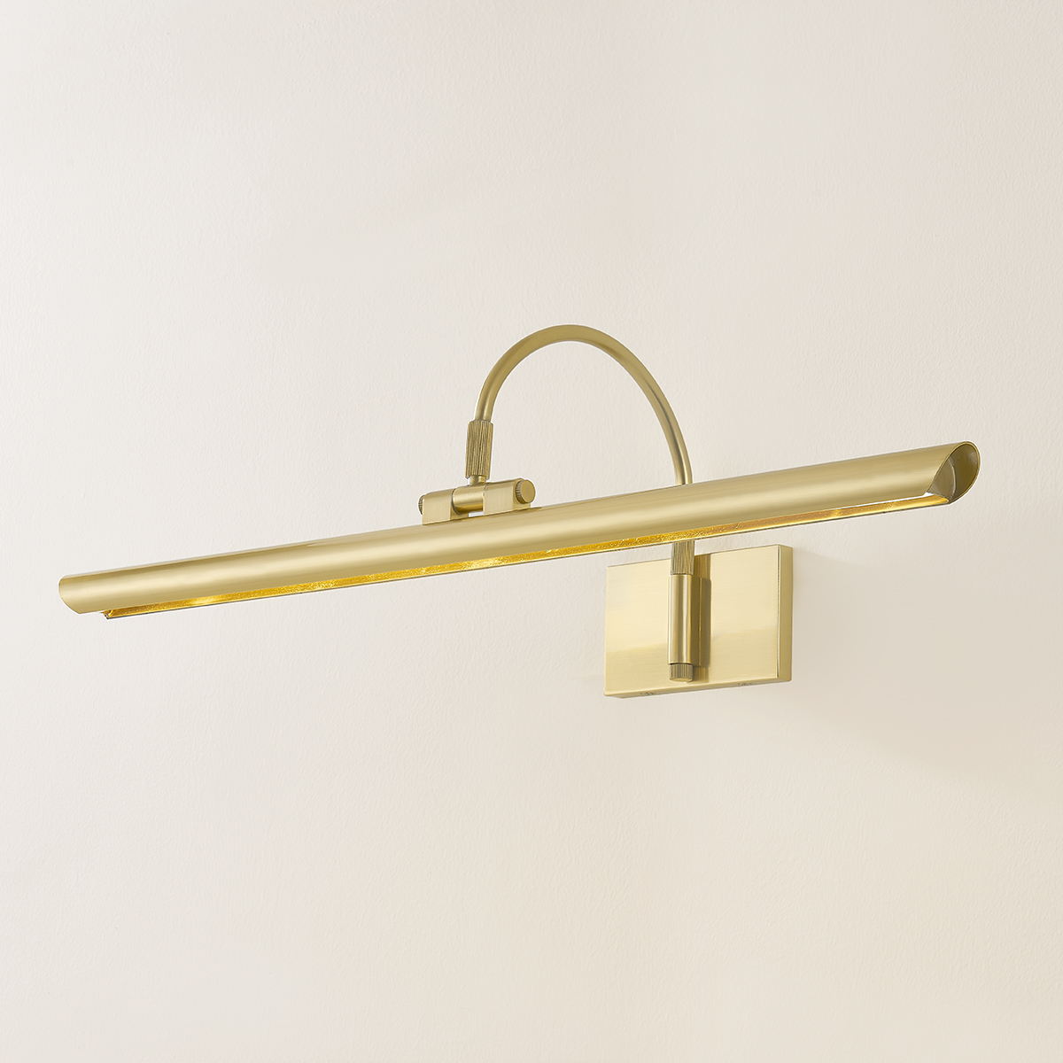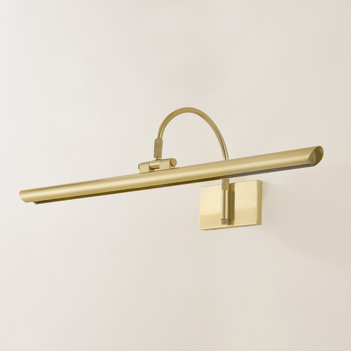 Breathing new life into a classic picture light design, Elowen features a slender silhouette and integrated LED technology. Supported by an arched neck, the shade is folded into a tube, leaving a thin opening that allows a band of light to pass through. Available in two sizes in either an Aged Brass or an Aged Old Bronze finish, Elowen provides discreet, yet powerful illumination of wall decor.