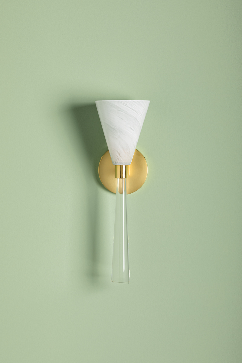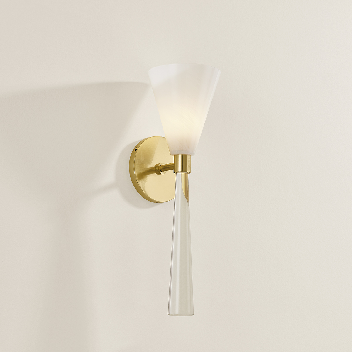 Amara is a timeless beauty with an abstracted botanical motif. Representing a bloom, an inverted cone-shaped shade is formed from Cloud Glass and etched internally to enhance its texture. A sparkling crystal stem adds an upscale touch that reflects light. Supported by a circular Aged Brass backplate, this serene wall light is ideal for illuminating small spaces, like a bathroom, bedside, or hallway.