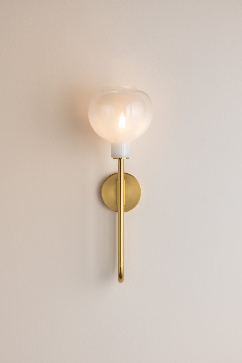 At the intersection of transitional and modern design, the Estelle family features relatable silhouettes with striking glasswork. The elongated J-arms arc upwards to support naturally rounded glass shades. Combining the cloudy Sfumato glass with classic Aged Brass metalwork results in a warm, inviting lighting experience. Available as a 1-light sconce and a 3 or 5-light chandelier, Estelle lends a sense of soft elegance to any space.