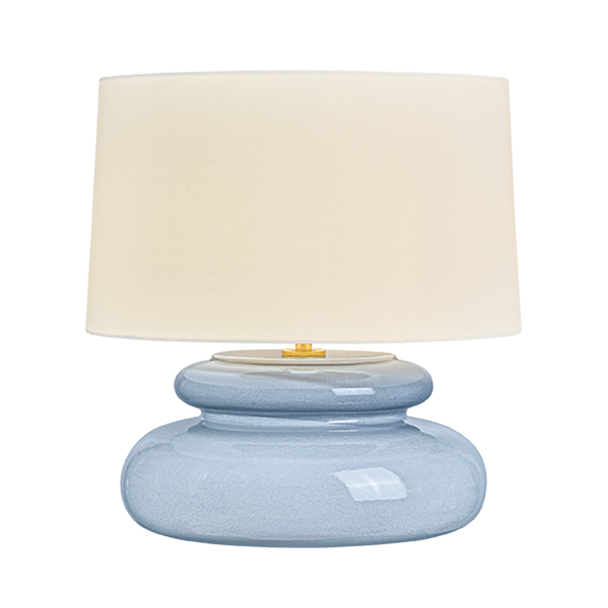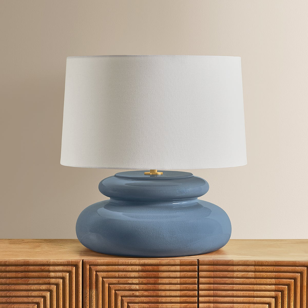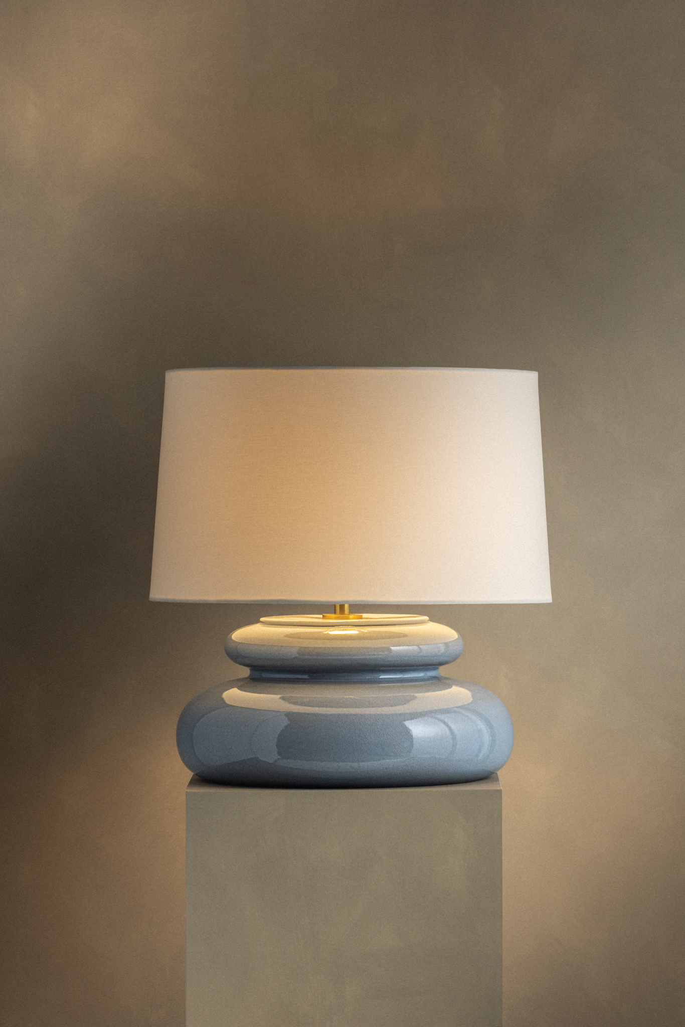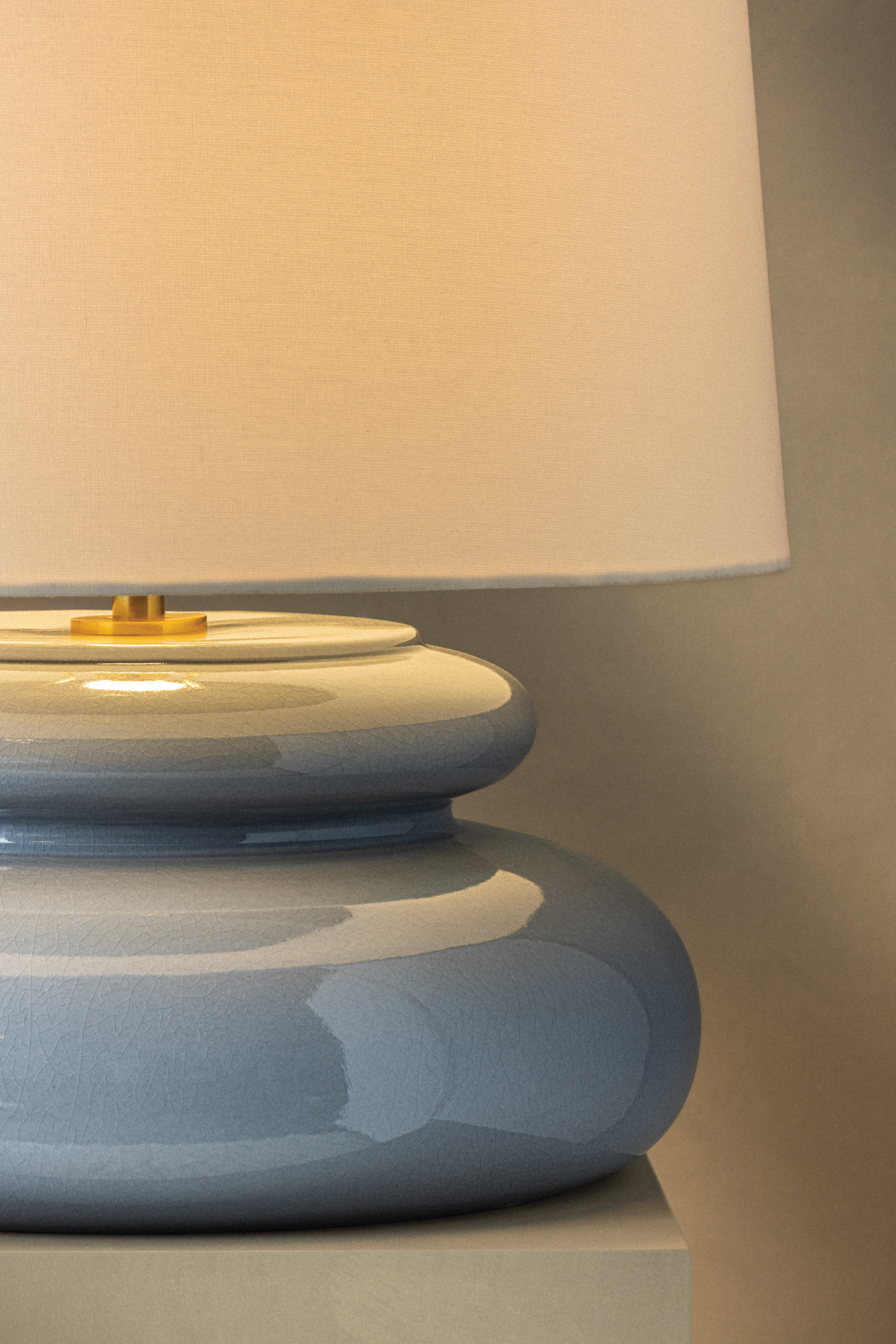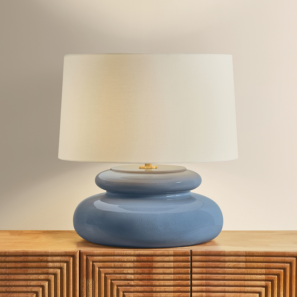An exploration of voluminous forms and soft, endearing colors, the Pia family leans into the playful side of lighting. Stout proportions, generous curves, and stacked ceramic disc shapes lend an artisanal feel that is enhanced by the Butter Crackle and Chateau Crackle finishes. The table lamp is topped with a classic white linen drum shade, while the pendant, flush mount, and wall sconce cast light through a large oculus. Finished with Aged Brass hardware, this family adds artistic visual interest to any space. Part of our Hilary Matt x Mitzi Tastemakers collection.