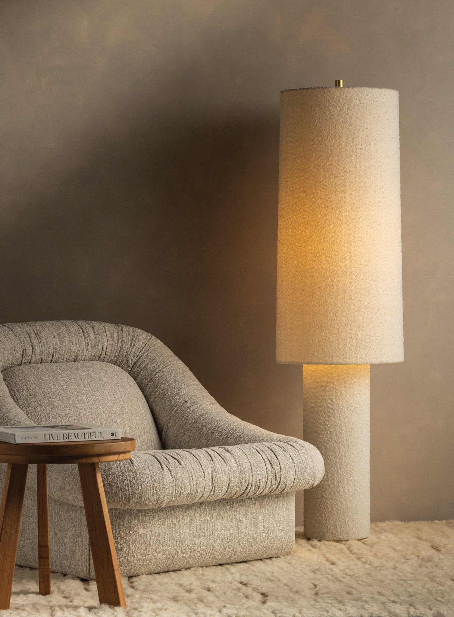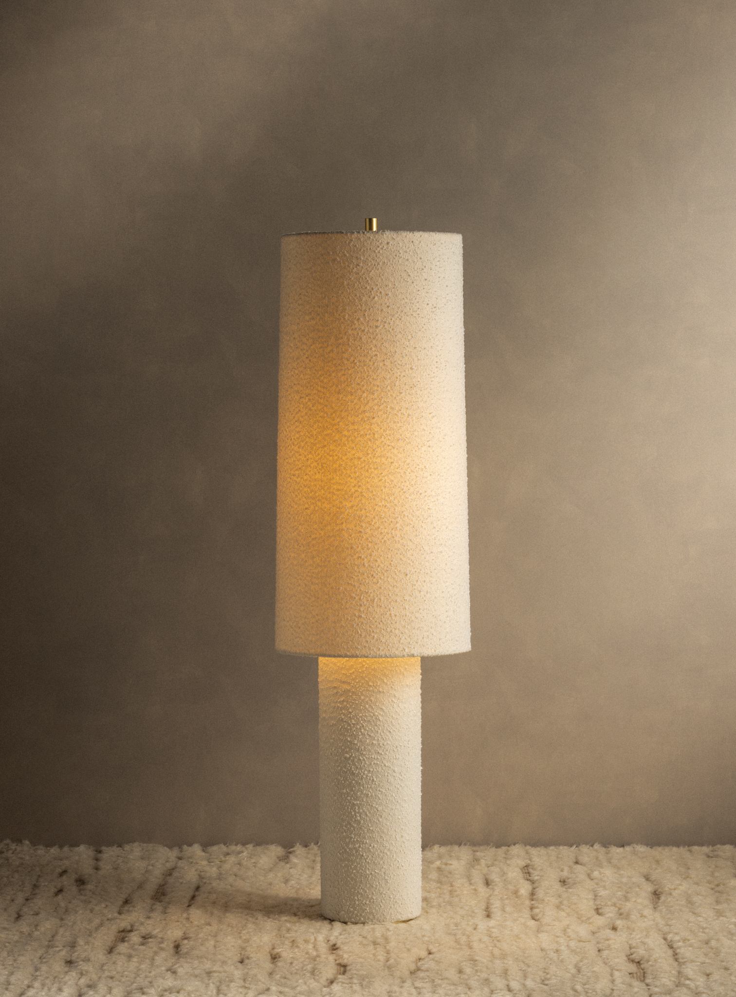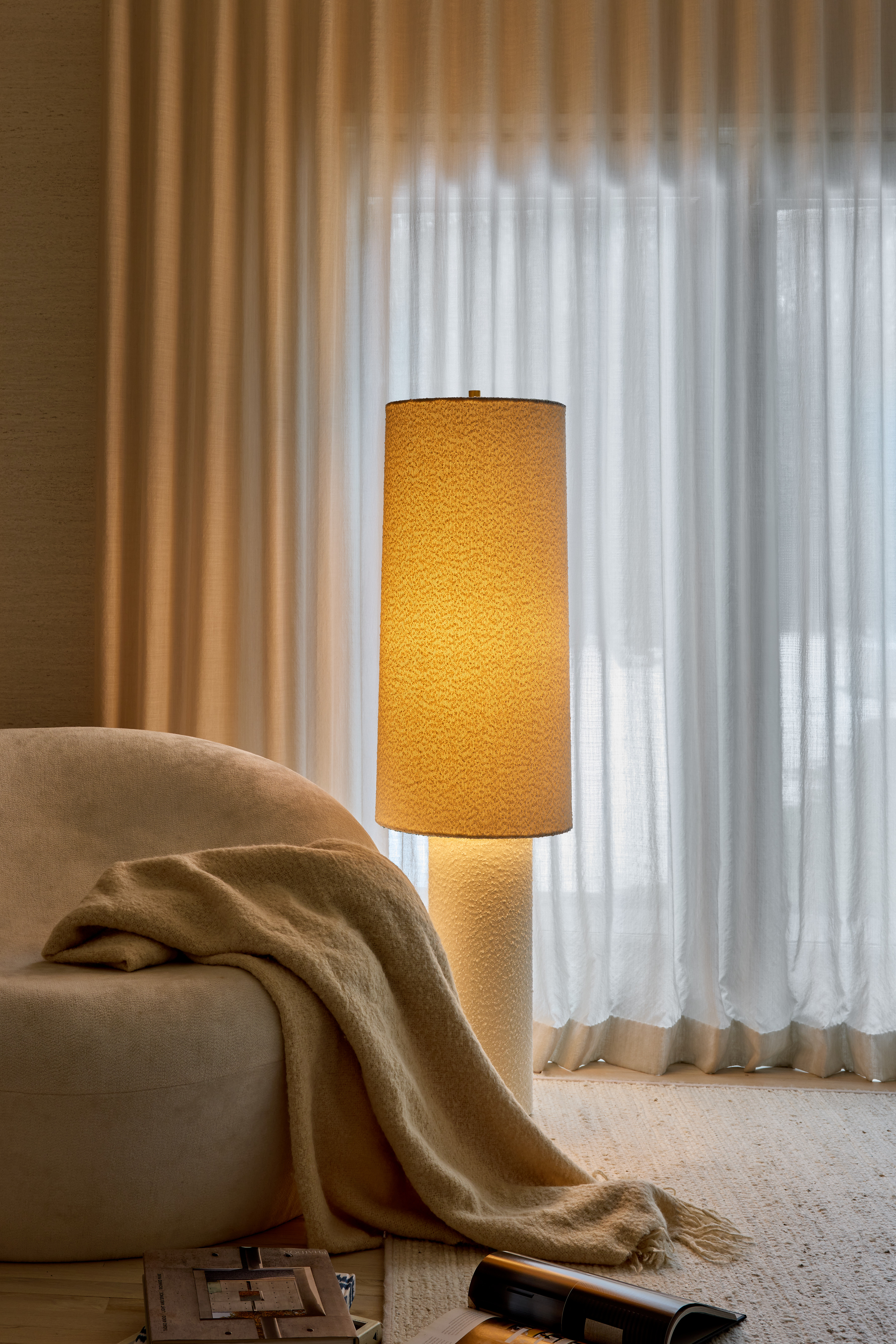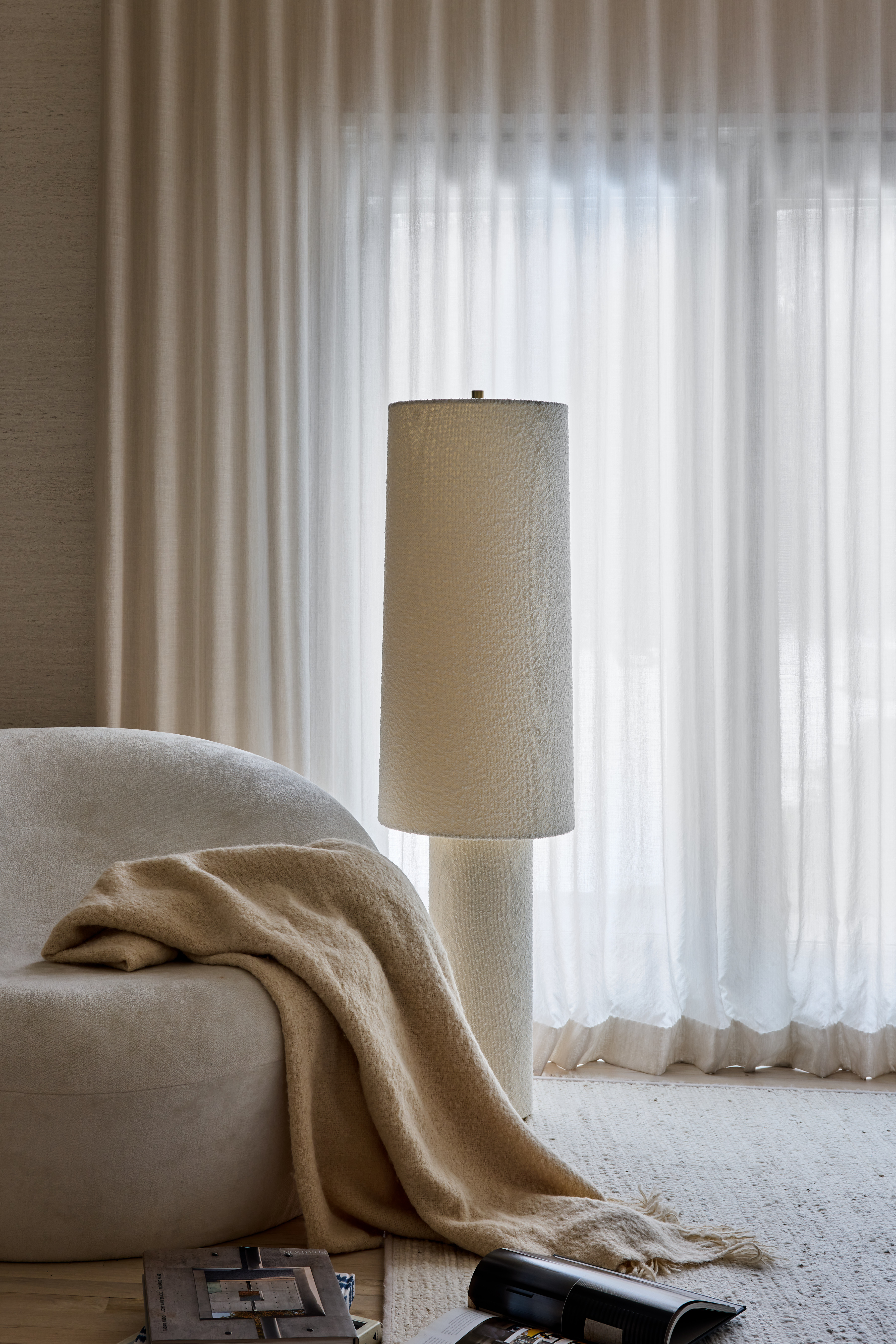 The all-over soft ivory boucle of the Sam family of lamps creates an inviting addition to modern interiors. As a table lamp, Sam makes a minimalist statement on a sideboard, while the floor lamp warms up a bedroom or reading nook with ease. The playful vertical proportions of both the table and floor lamp make them ideal for more narrow spaces. Concealed Aged Brass hardware lends a luxe finish to both of these textural lamps. Part of our Hilary Matt x Mitzi Tastemakers collection.