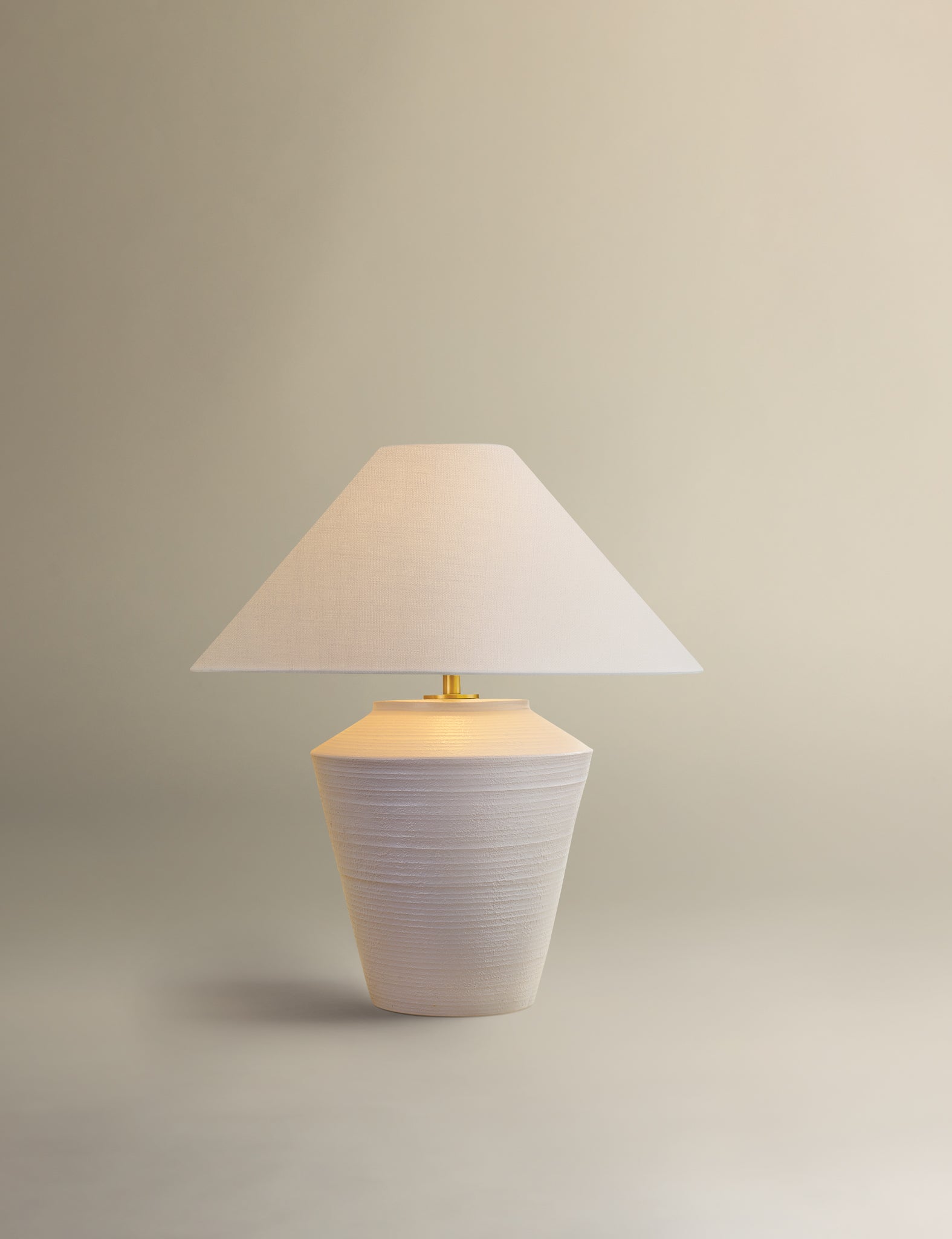 Inspired by raw beauty of the desert, this whitewashed terracotta table lamp is calm and refreshing. The textural body contrasts beautifully with the angular tapered white linen shade. An Aged Brass frame provides a surprising metallic finish. Part of THELIFESTYLEDCO® collection.