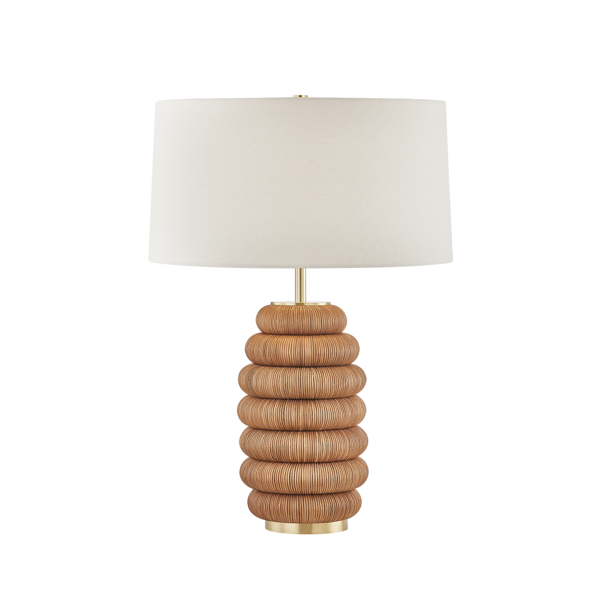 The lively Winbrook table lamp calls to mind the shape of a honeycomb. The voluminous base has been wrapped in natural pencil rattan, blending shape and material for a spin on the earthy, pillowy decor trend. An elongated neck finished in Aged Brass separates the base from the crisp off white linen shade, creating a balance of proportions and materials.