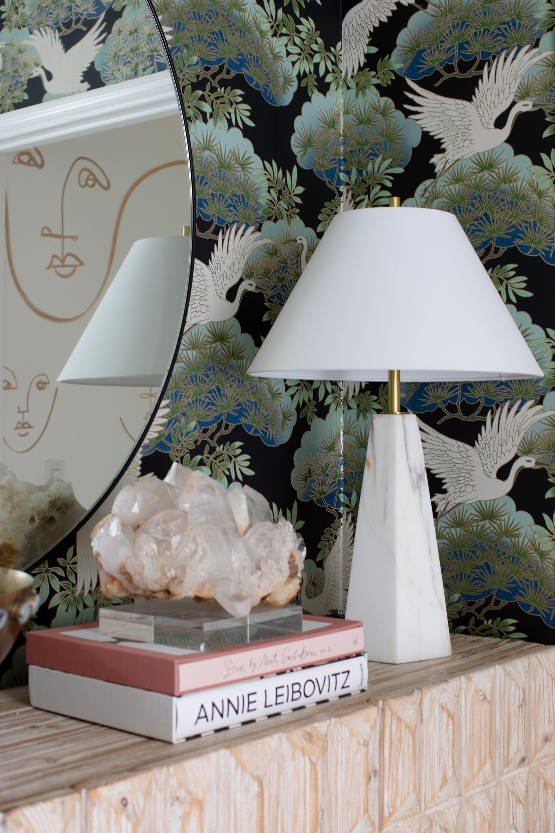 Featuring a pyramid-shaped base of honed Arabescato Corchia marble, the Benicia table lamp stands with a statuesque presence. Evoking a sense of permanence, the polished stone contrasts with the soft white linen of the shade. A slender Aged Brass neck adds the finishing touch � a contemporary update to a timeless beauty.