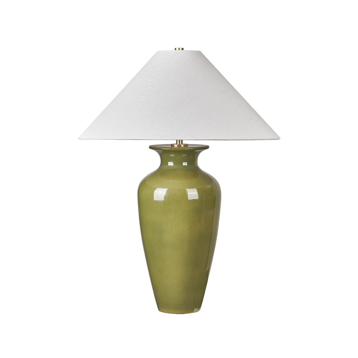Creating a vivid color moment is the ultimate goal of the Grassy Point table lamp. This statuesque ceramic lamp is finished in a glossy Norrie Green glaze that champions an unexpectedly fresh hue. Designed as a companion piece to French Ridge, this larger-scale lamp is completed with a classic textured linen shade and Aged Brass hardware.