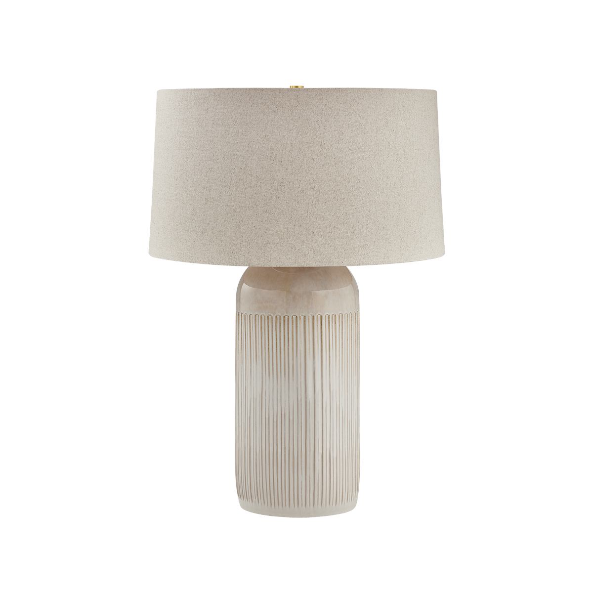The Stevens Point table lamp melds the beauty of a classical column with the earthiness of pottery. Subtle tonal variations in the Oyster White glaze result in a dripping, translucent effect that adds painterly dimension to the ceramic base. Topped by a Sandstone Linen shade and finished with Aged Brass hardware, this lamp brings a sense of serenity to contemporary spaces.