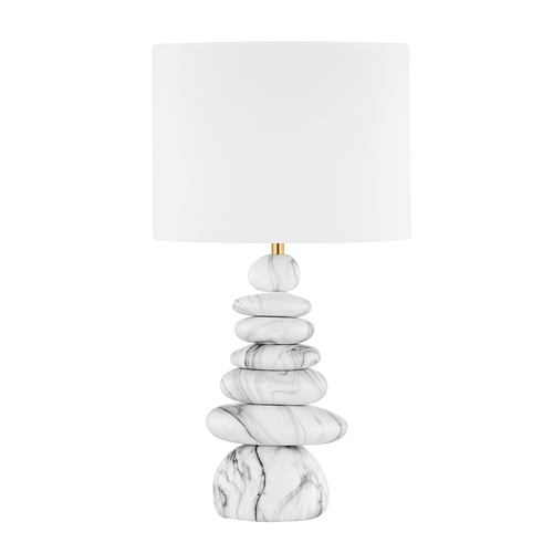 A fresh spin on a totemic design, Galeville is carved from striking natural travertine. While design-forward, the irregular stacked forms are both artistic and accessible. Completed with Aged Brass hardware and topped by a white linen shade, this versatile lamp easily complements modern, vintage, and farmhouse-style homes.