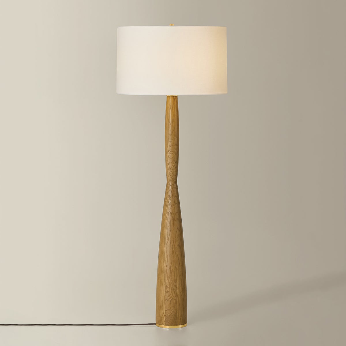 Streamlined and statuesque, the mid-century silhouette of the Somers Chase floor lamp has been hand-carved from natural wood. The light oak base tapers inwards at the middle, creating a point of interest. A large crisp white linen drum shade complements the wood, while an Aged Brass finish on the hardware adds an element of shine at the base.