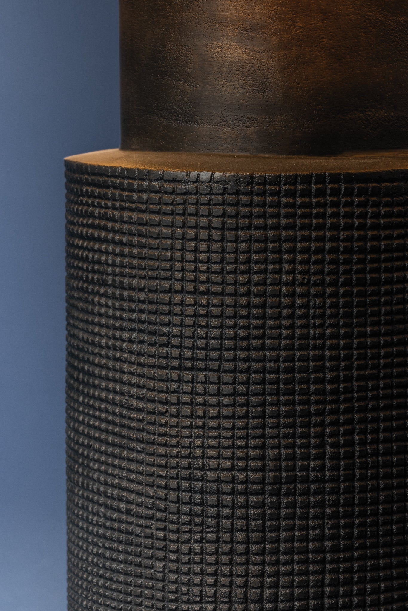 Handcrafted in India, the Farmingdale table lamp taps into the trend for artisanal pieces. The cast aluminum base features a stacked, cylindrical shape with a highly textural grid pattern and exposed edge detailing. A smooth neck provides a break in texture, while the natural linen shade softens the overall look. Dark Bronze hardware coordinates with the metalwork of this striking lamp.