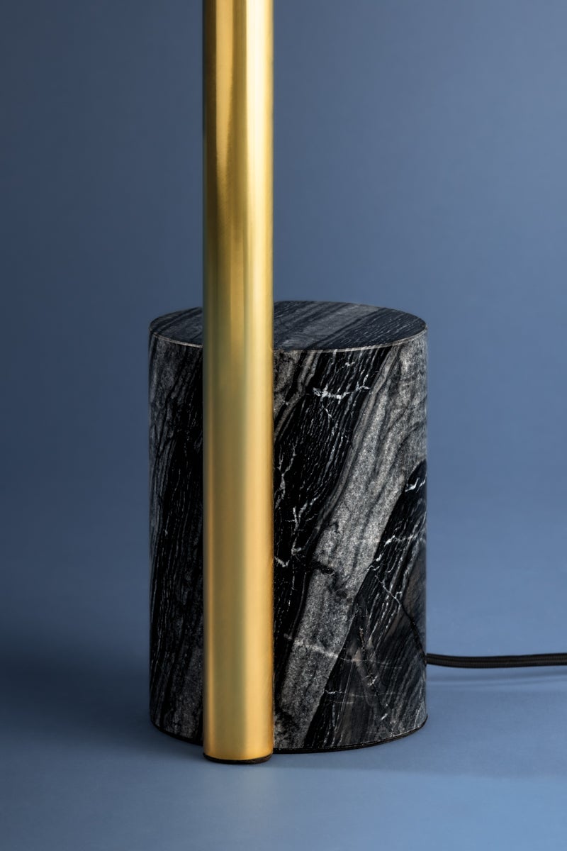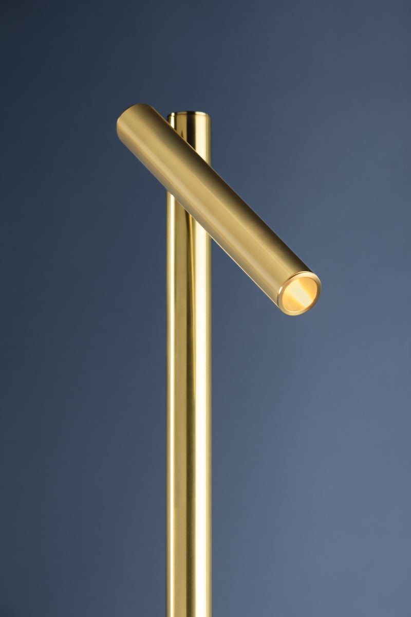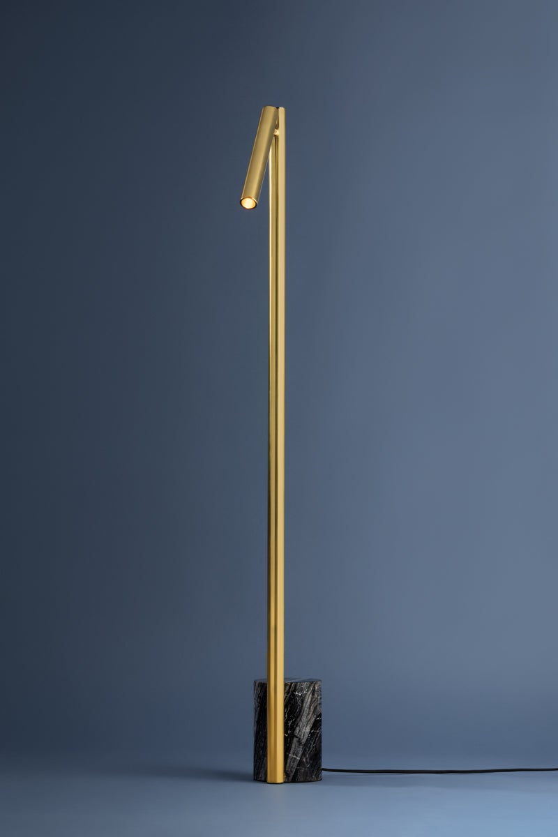 Incorporating CSL’s innovative ‘Whisper’ technology, Circleville cuts a sleek figure in Aged Brass. While it might read as industrial, the elongated tube forms lean towards modernist aesthetics. The articulating shade allows precise control to create a powerful spotlight where needed. Available as a sconce and floor lamp.