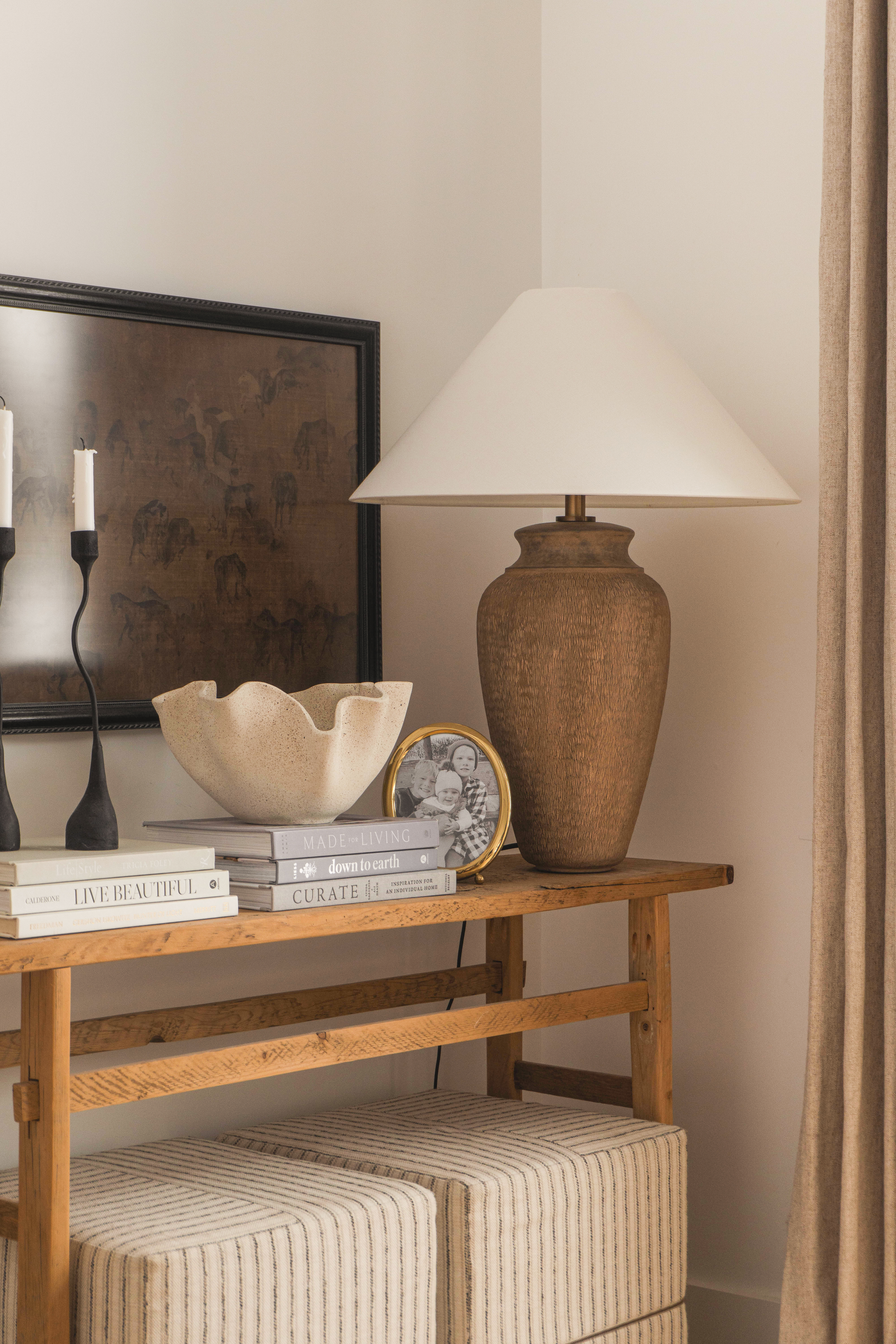 Inspired by Ancient Roman pottery, Vessel features a statuesque, elongated base with a richly textured finish that evokes clay layered by hand. A sharply tapered white linen shade balances the earthy hues with a note of freshness while Patina Brass hardware adds a subtle glint at the neck. Earthy yet refined, Vessel pairs beautifully with Unearthed for a collected, sculptural feel.