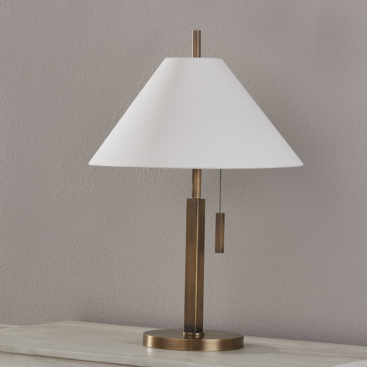 Clic is classic and tailored. An extruded square body set atop a circular base extends into a slim pole that pierces through a tapered, off-white linen shade to create a layering of simple geometry. The pull chain adds a stylish and functional detail, while the all-over Patina Brass finish contributes to the sophistication of this collection. Clic is available as a floor and table lamp.