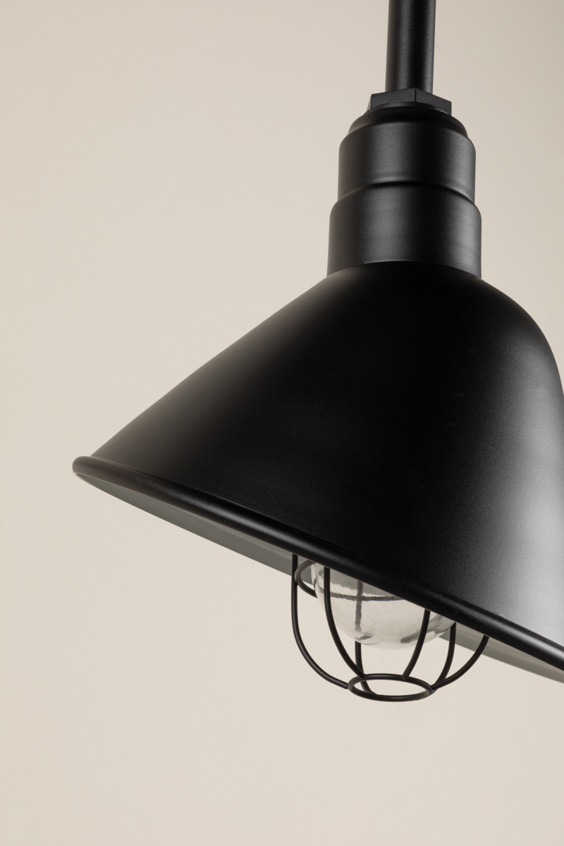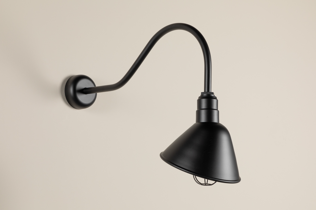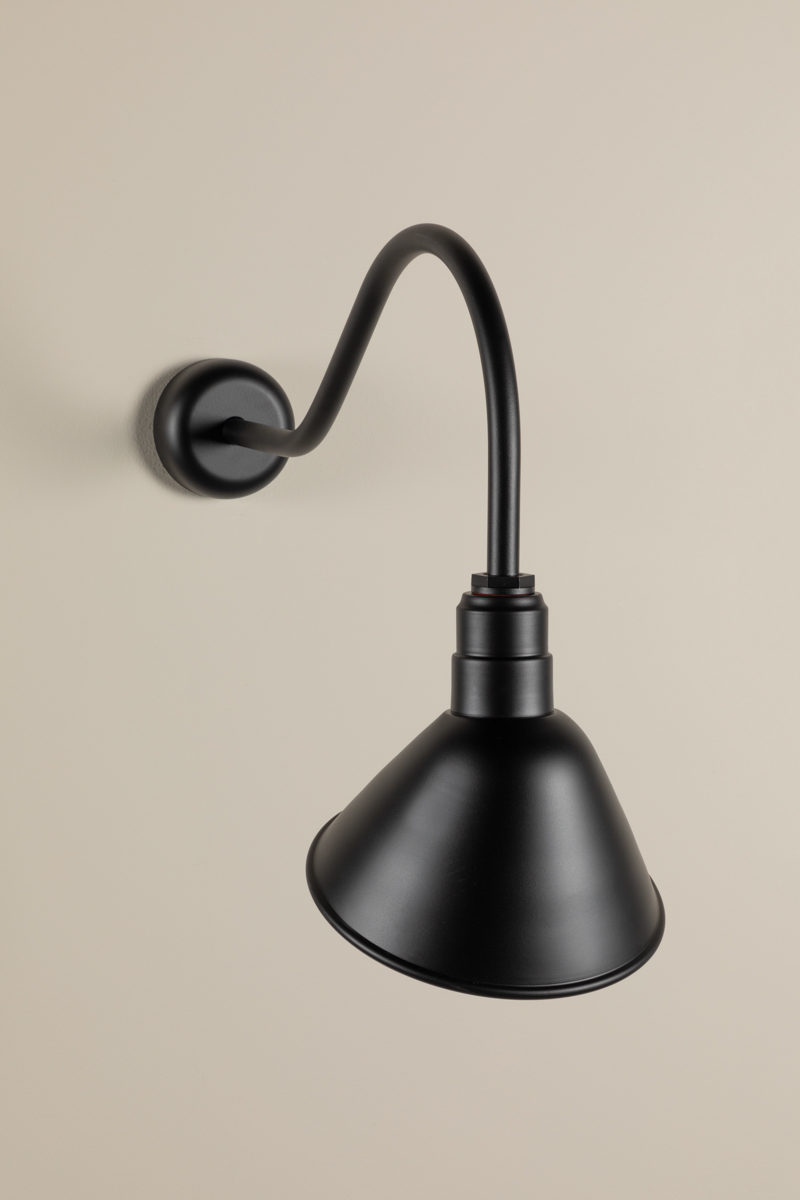 A powerful interior or exterior wall light with a classic RLM shade, San Bruno provides an elevated take on industrial style. Featuring a curved gooseneck arm that extends from a circular wall mount, it angles light towards the wall, reducing glare. This highly practical, timeless fixture is available in a Matte Black finish.