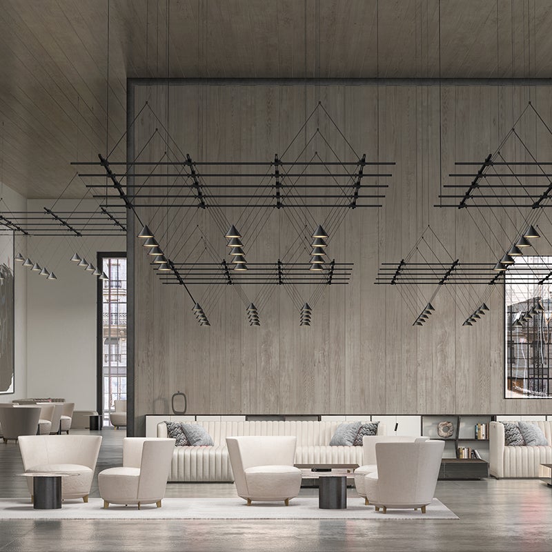 Power bars are suspended at right angles to each other, connected by perpendicular Power Bar Hangers. Zig Zag arrangements can be used to form a linear pattern, or combined and oriented to form a broad composition arrayed across the plane of an entire ceiling.