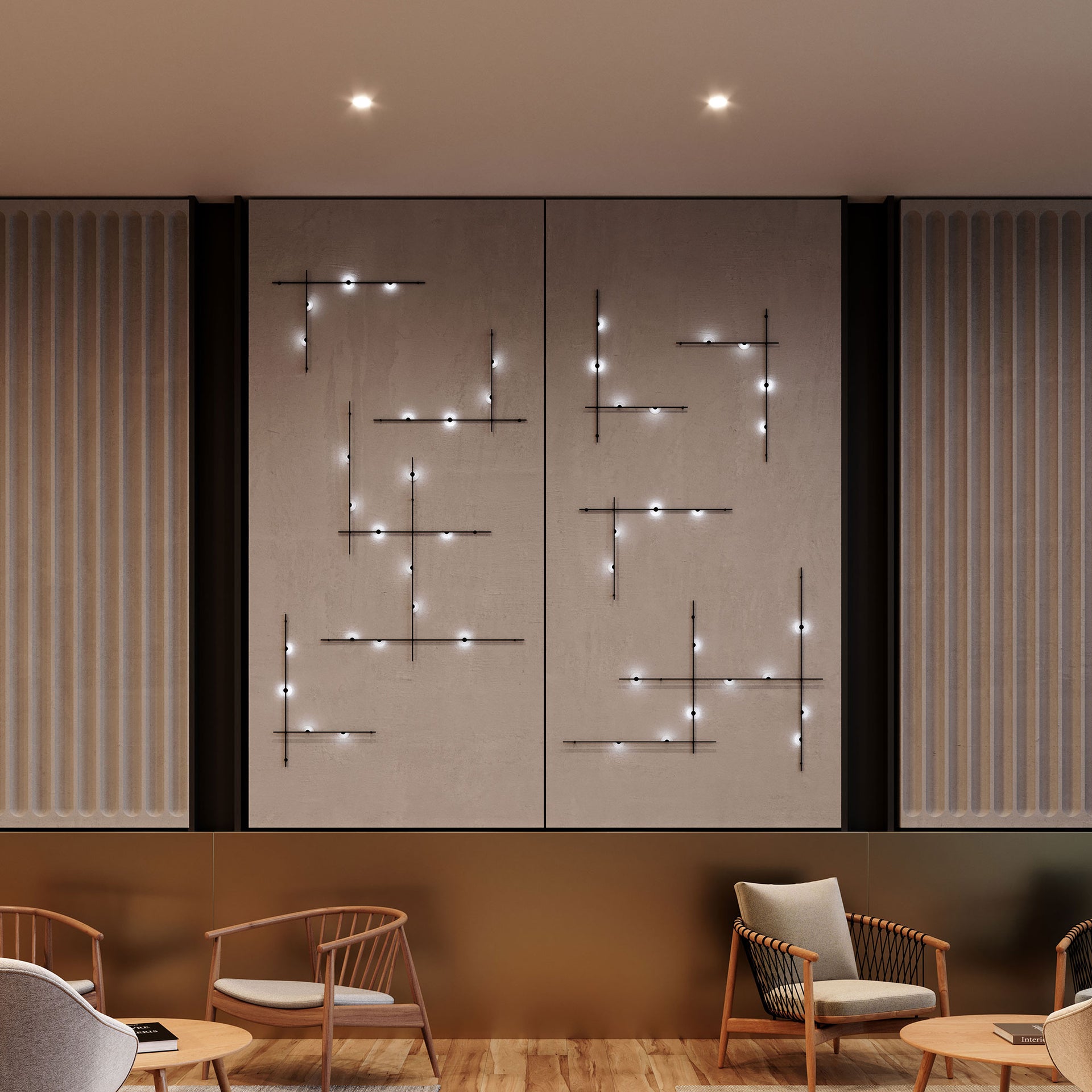 Power bars are suspended at right angles to each other, connected by perpendicular Power Bar Hangers. Zig Zag arrangements can be used to form a linear pattern, or combined and oriented to form a broad composition arrayed across the plane of an entire ceiling.