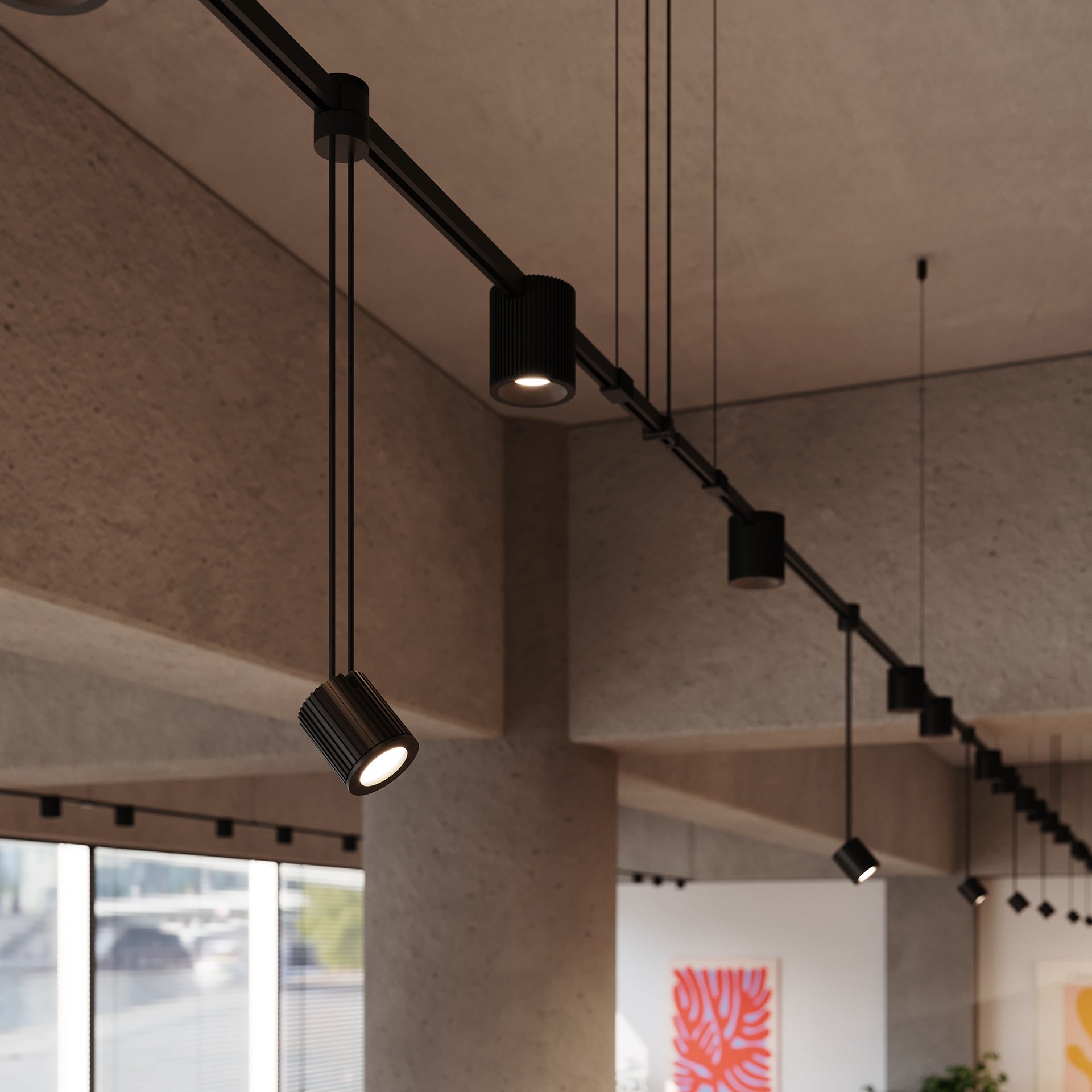 Power bars are suspended at right angles to each other, connected by perpendicular Power Bar Hangers. Zig Zag arrangements can be used to form a linear pattern, or combined and oriented to form a broad composition arrayed across the plane of an entire ceiling.
