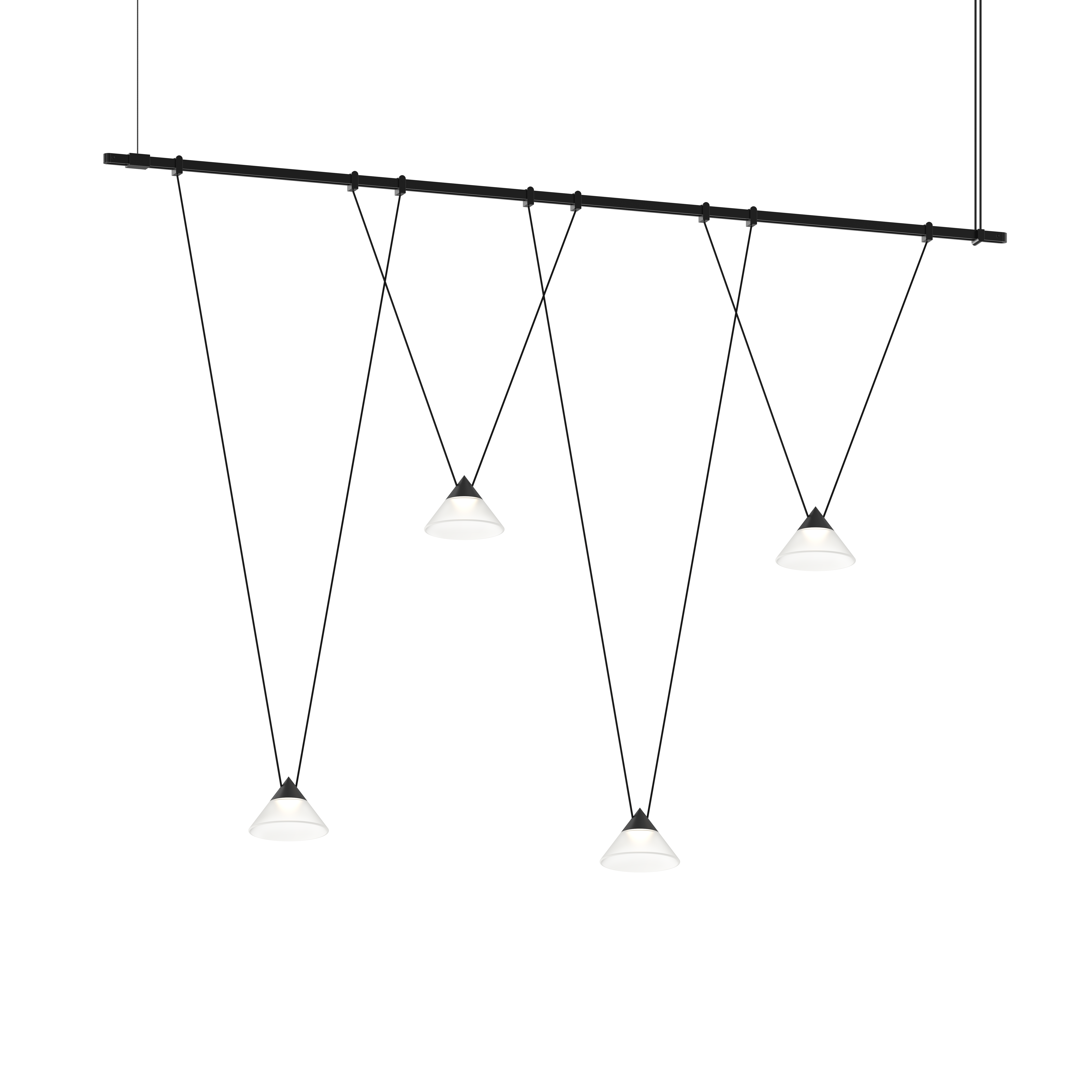 Power bars are suspended at right angles to each other, connected by perpendicular Power Bar Hangers. Zig Zag arrangements can be used to form a linear pattern, or combined and oriented to form a broad composition arrayed across the plane of an entire ceiling.